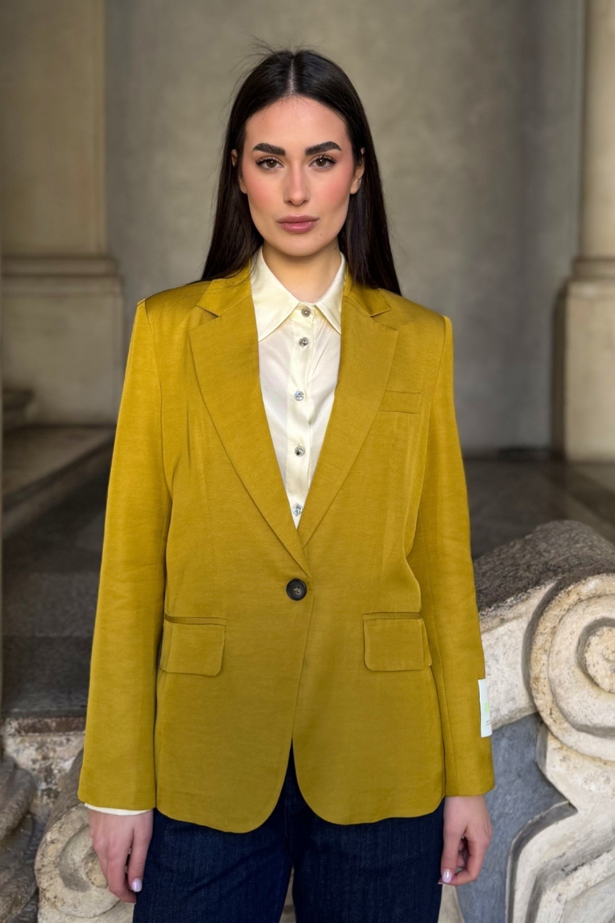 La tonalità senape dona carattere e luminosità al look, perfetta per dare personalità sia ad outfit formali che a combinazioni più casual con denim o pantaloni ampi. Il fit è regolare, con spalle ben definite e lunghezza leggermente sotto il fianco.