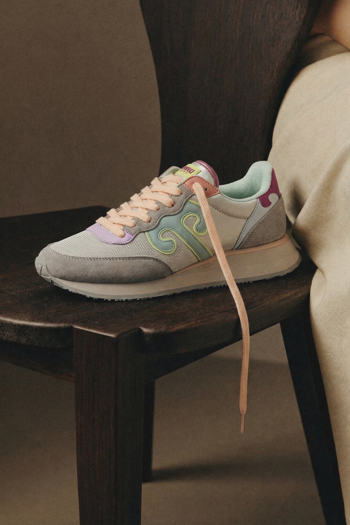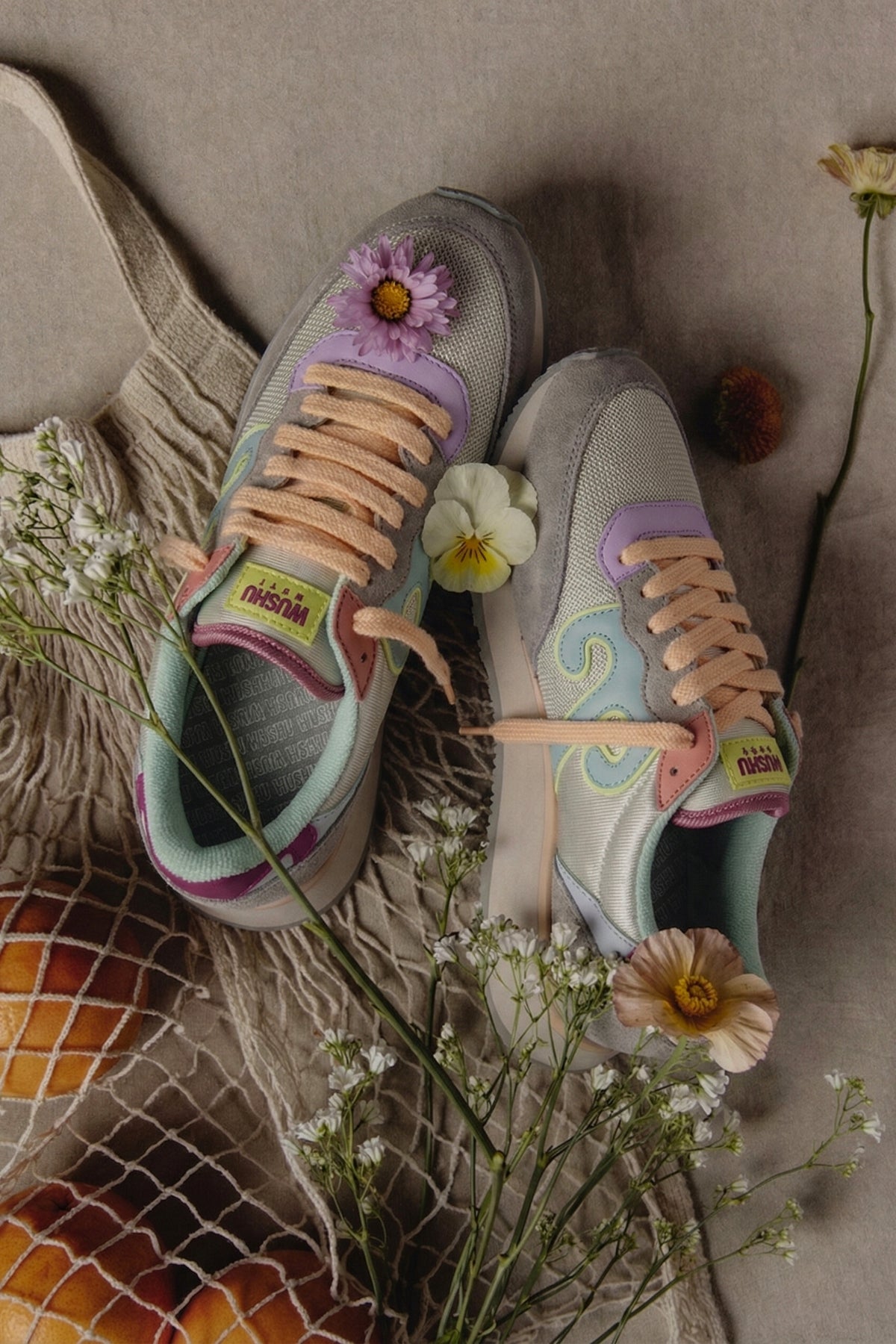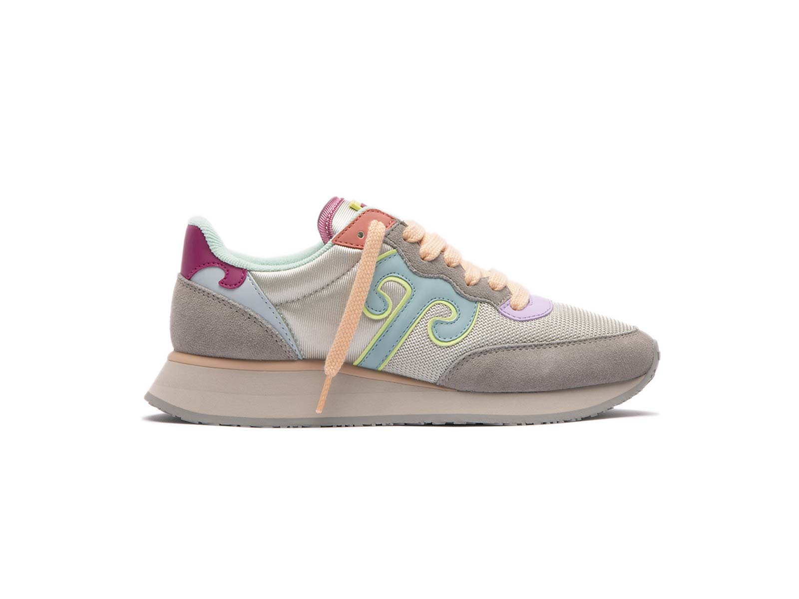 Camoscio color Gypsum, nylon e rete nylon color Cool Gray. Logo Ruyi color Lake Green, laccio color Light Peach e secondo laccio color Gray.