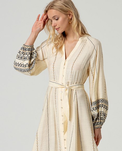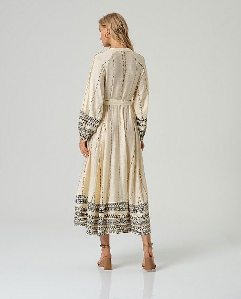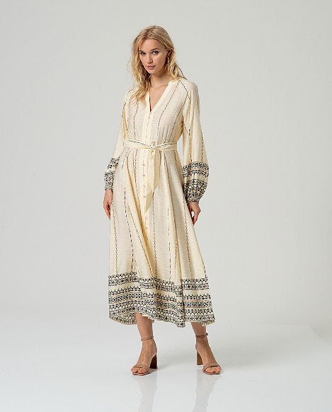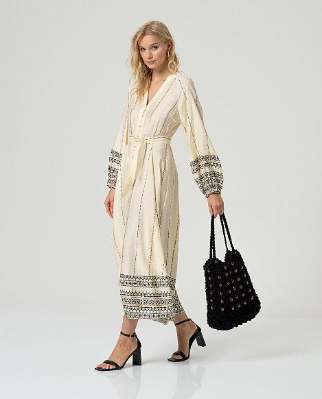 Abito SURKANA – INLO nella variante Crudo, lungo e leggero, caratterizzato da una stampa delicata a righe verticali con dettagli decorativi sui polsi e sul fondo.