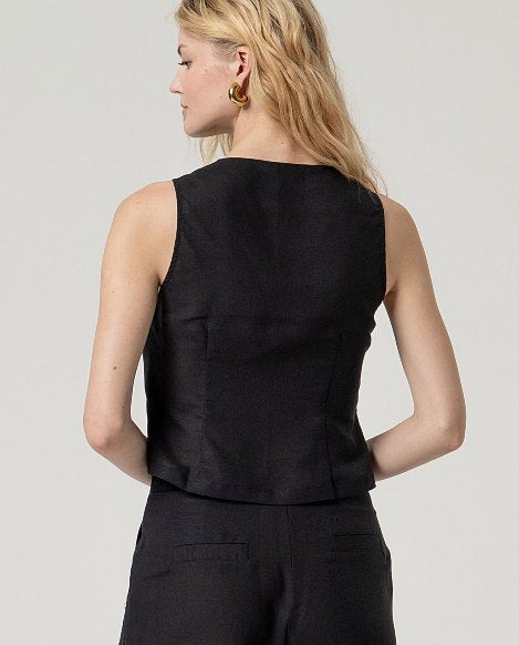 Gilet smanicato in blend di viscosa e lino, dal design essenziale e femminile. La linea leggermente sagomata valorizza la silhouette, mentre l’abbottonatura frontale con bottoni a vista aggiunge un dettaglio raffinato e contemporaneo.