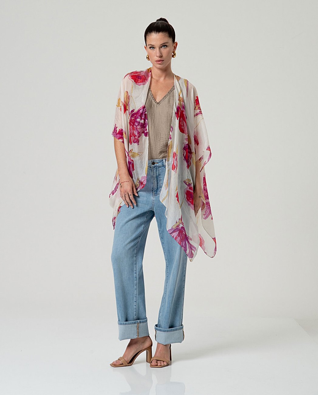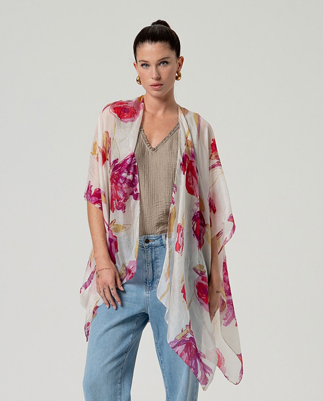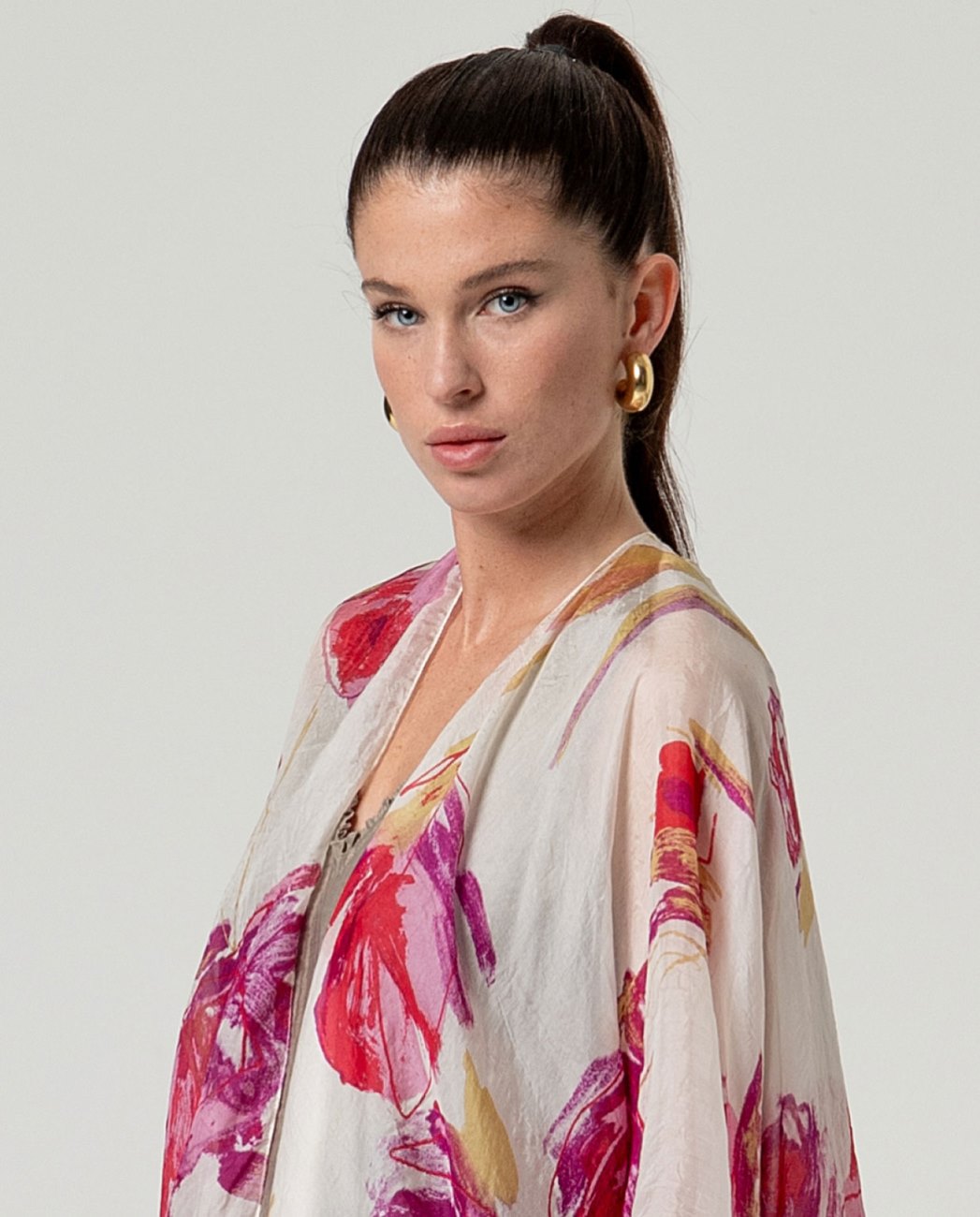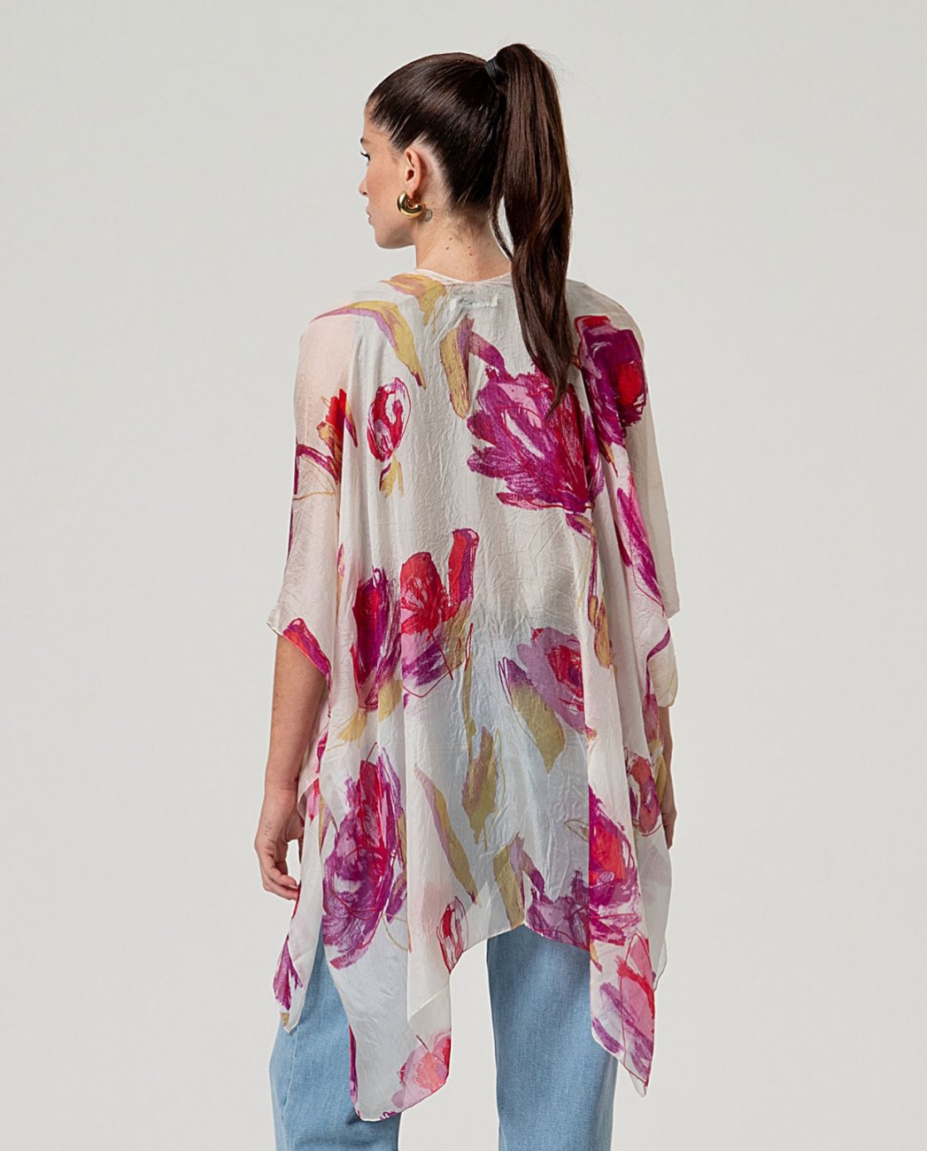 Kaftano aperto con scollo a V e maniche larghe. Design slip-on con silhouette fluida e lunghezza asimmetrica. Presenta una stampa integrale e una finitura leggera. Progettato a Barcellona.. Kaftano a stampa aperta