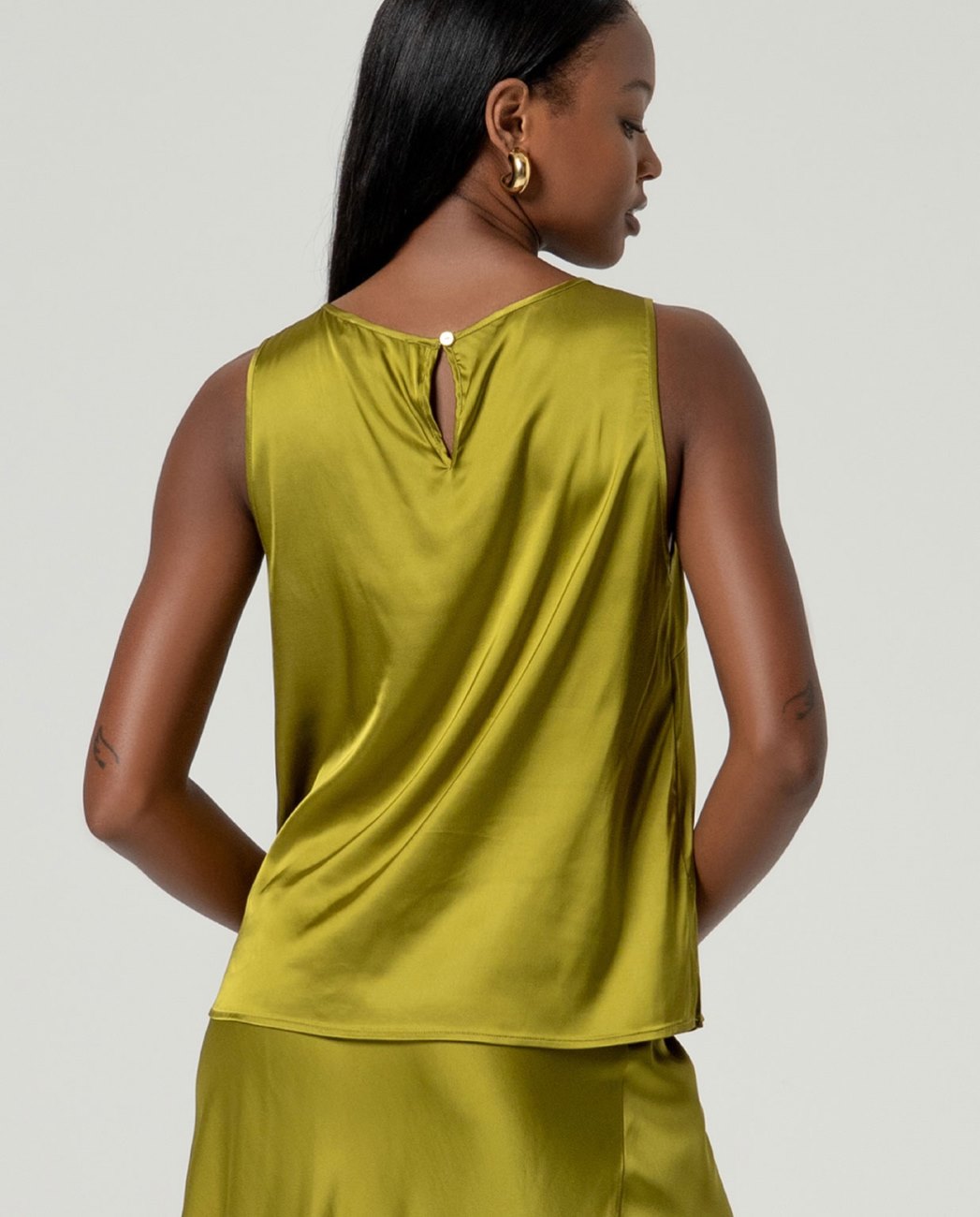 Top sottile con scollo a V frontale. Retro chiuso con apertura piccola e chiusura a pulsante. Taglio dritto e orlo leggermente arrotondato. Fatto di tessuto di raso leggero. Progettato a Barcellona.. Schienale superiore con bottone in raso chiaro