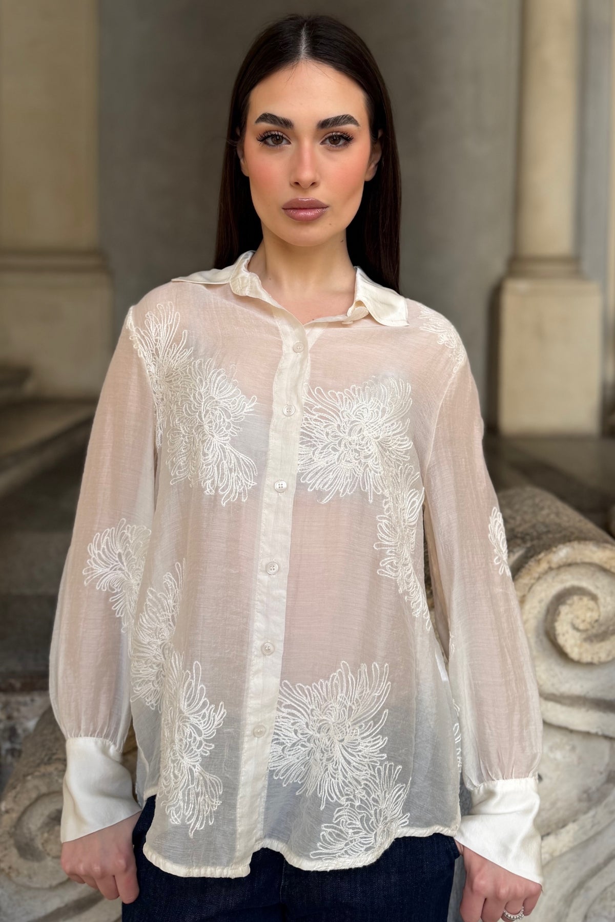Una camicia leggera e luminosa che unisce delicatezza e ricercatezza attraverso raffinati ricami tono su tono. Il tessuto semi-trasparente valorizza la leggerezza del capo, mentre i motivi floreali ricamati creano un elegante gioco di texture sulla superficie.