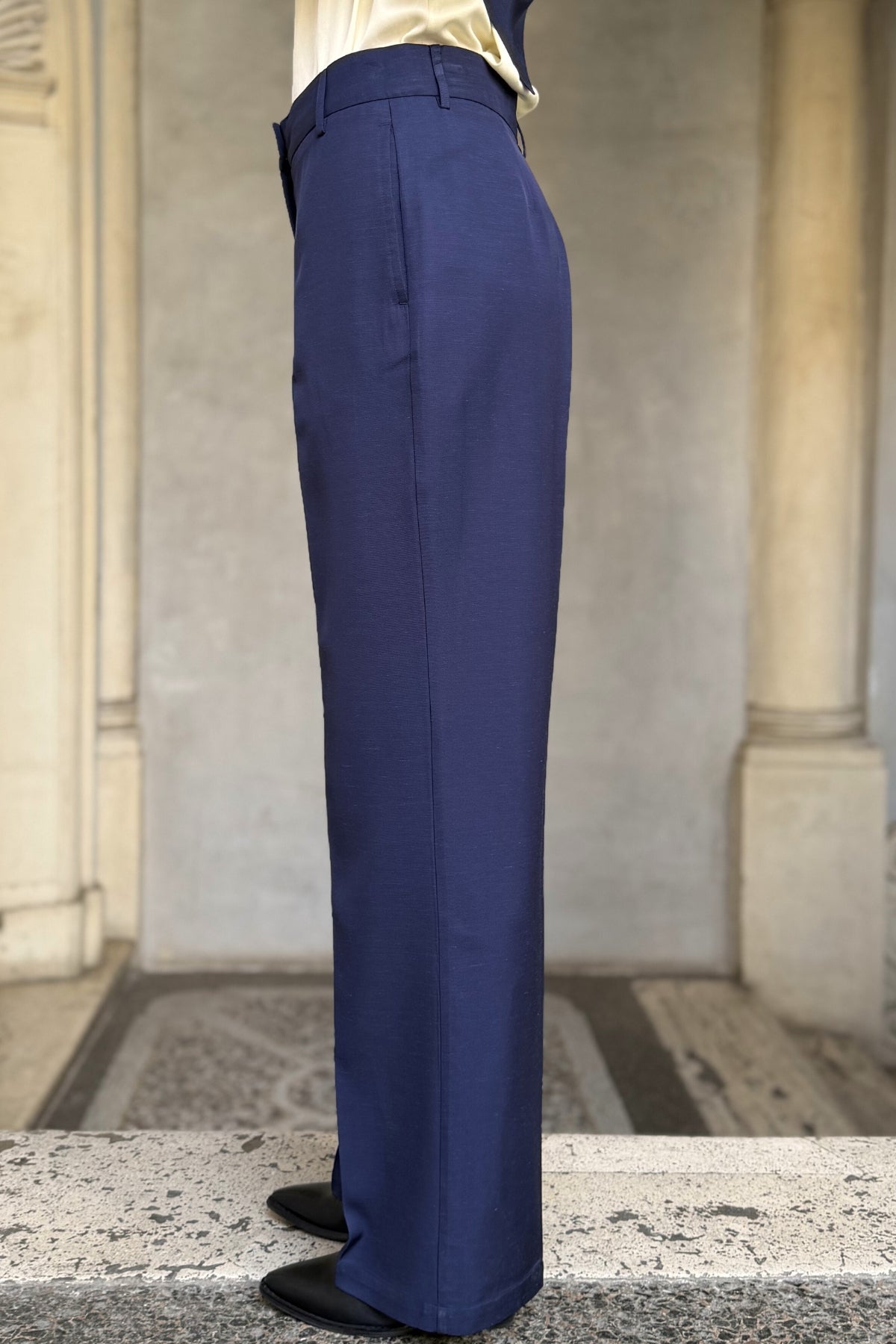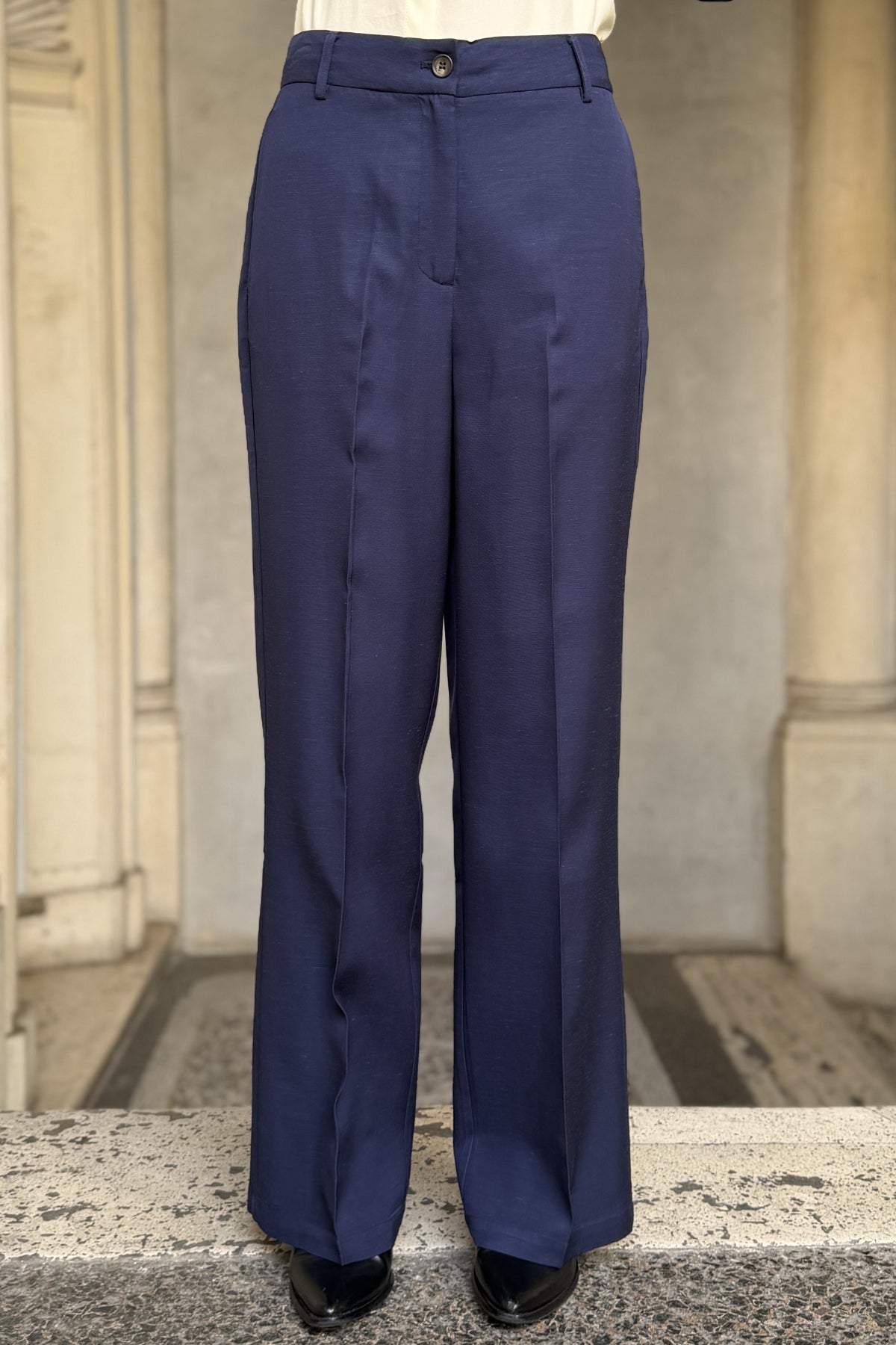 Pantalone palazzo dal taglio pulito e contemporaneo, caratterizzato da una linea lunga e fluida che accompagna naturalmente la silhouette. La vita regolare con passanti e chiusura frontale con bottone definisce un’estetica essenziale, mentre la piega centrale slancia la figura e dona struttura al capo.