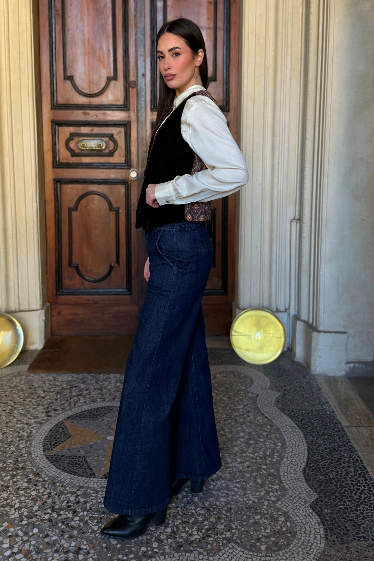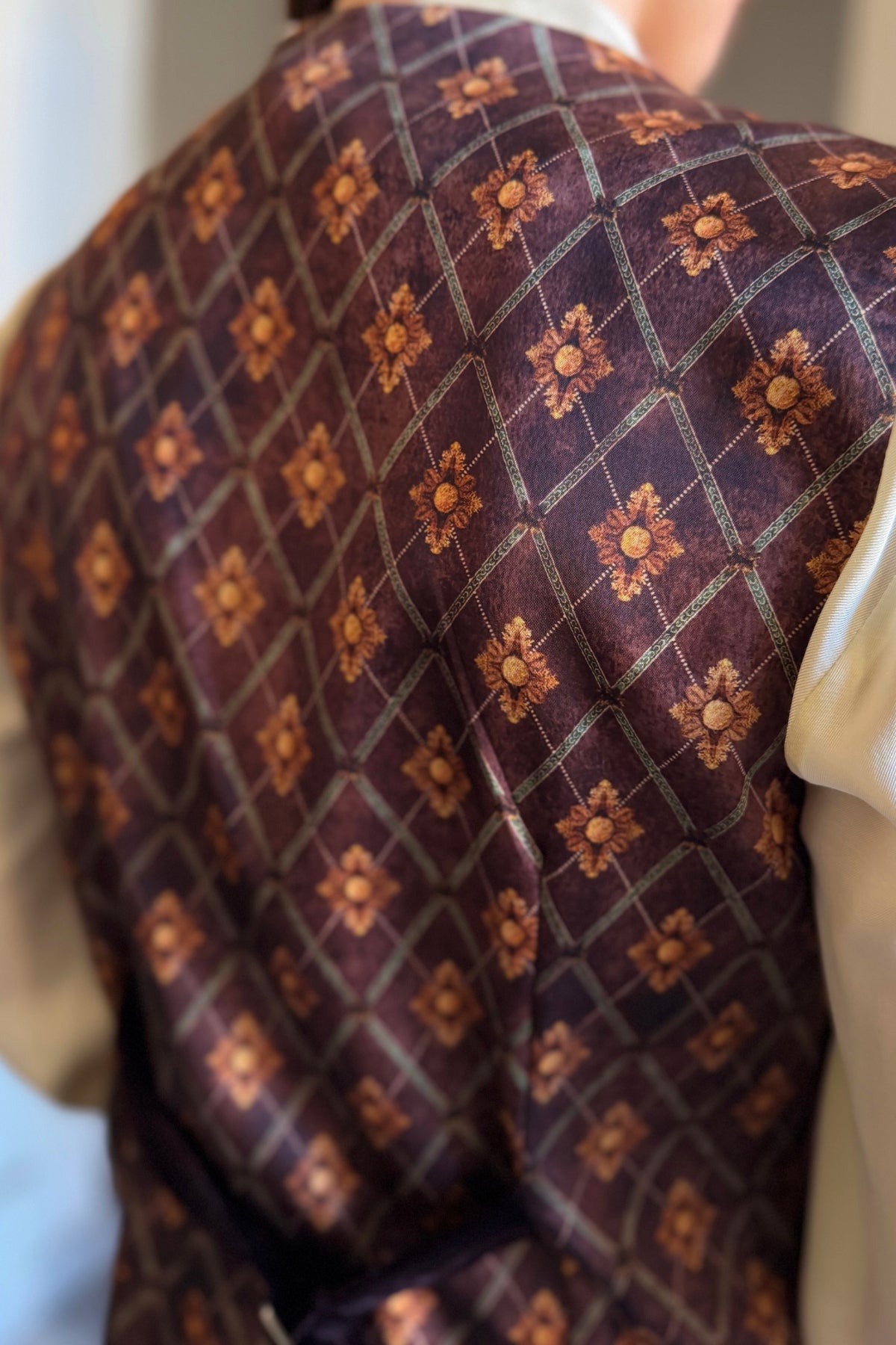 Il velluto dona profondità cromatica e una texture morbida al capo, mentre il retro a fantasia aggiunge un dettaglio distintivo e ricercato, visibile nei movimenti e nelle viste laterali. Un equilibrio studiato tra classicismo e carattere decorativo.