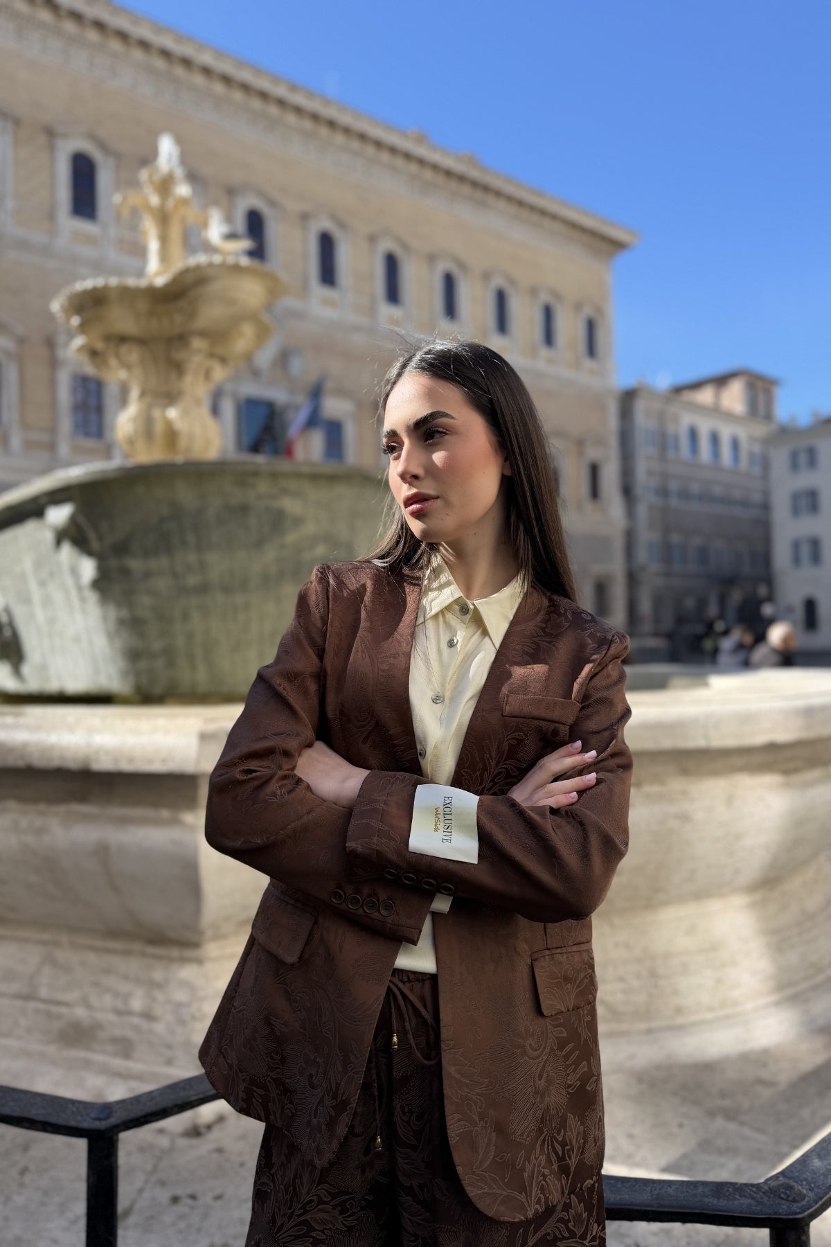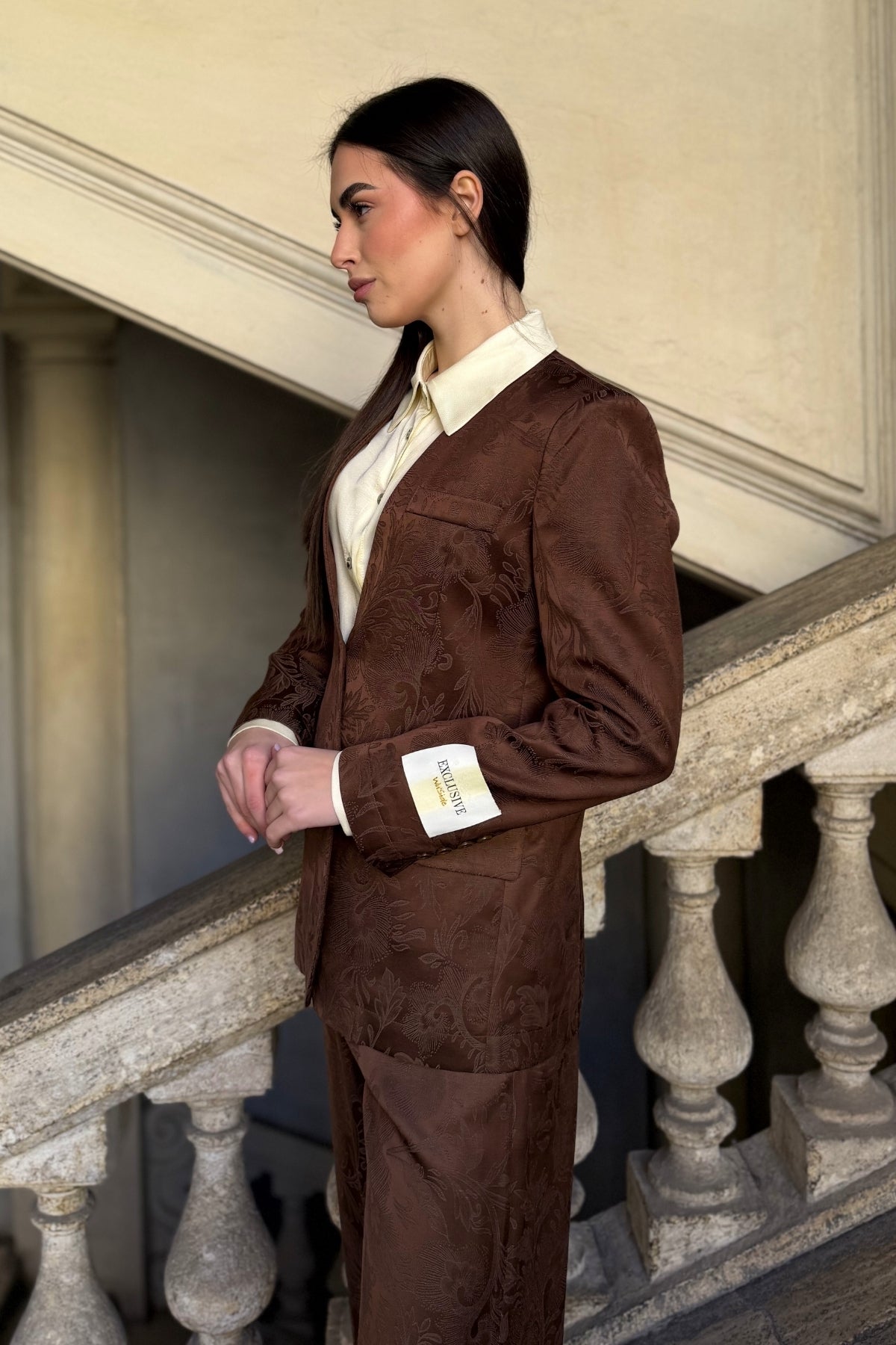 Giacca in tessuto jacquard dalla texture ricca e sofisticata, caratterizzata da un motivo tono su tono che dona profondità e movimento alla superficie. La nuance caffè esalta il disegno floreale inciso nel tessuto, creando un effetto elegante e materico.