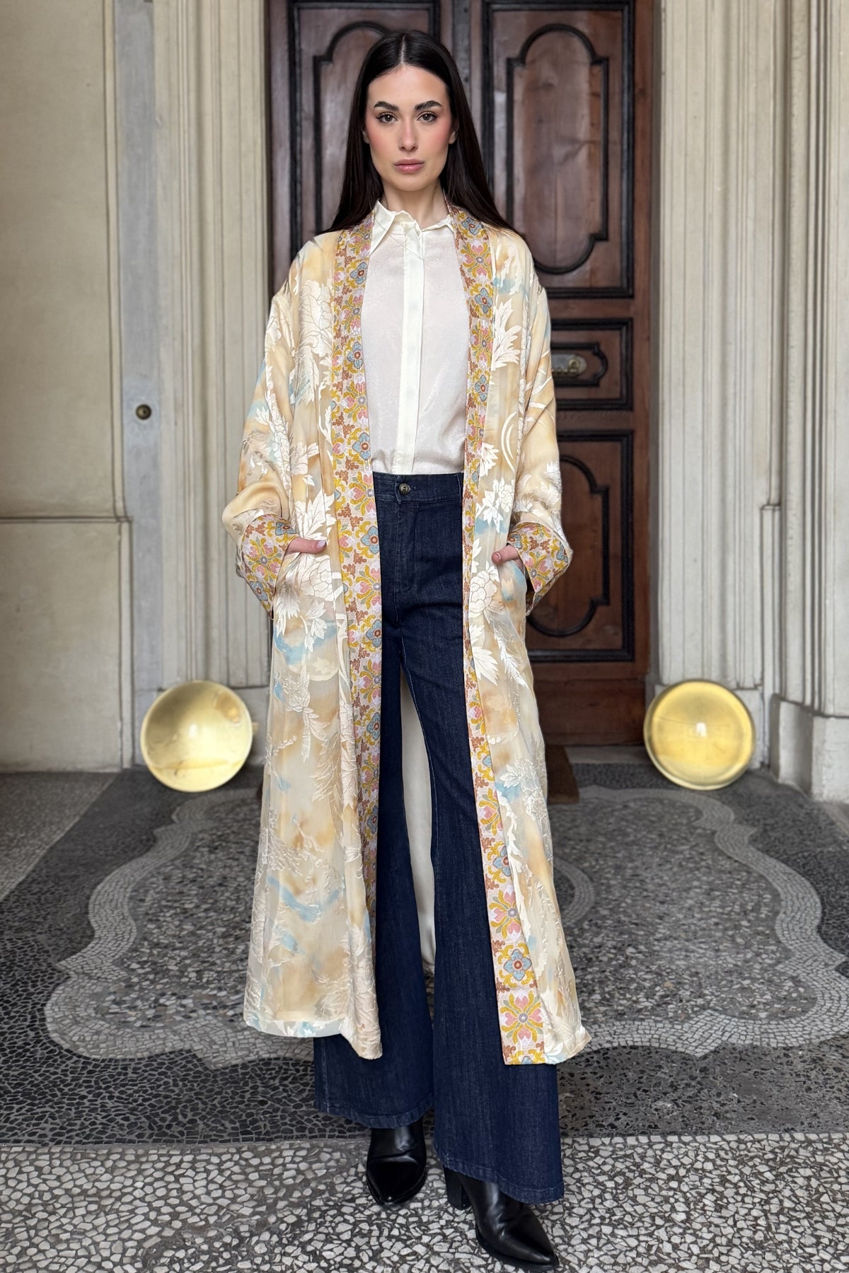 Kimono lungo dal fascino sofisticato, caratterizzato da una silhouette fluida e da una lavorazione dévoré che dona profondità e leggerezza al tessuto. Il capo si distingue per la trasparenza delicata e per il motivo floreale che emerge con eleganza sulla superficie, creando un raffinato gioco di luce e texture.