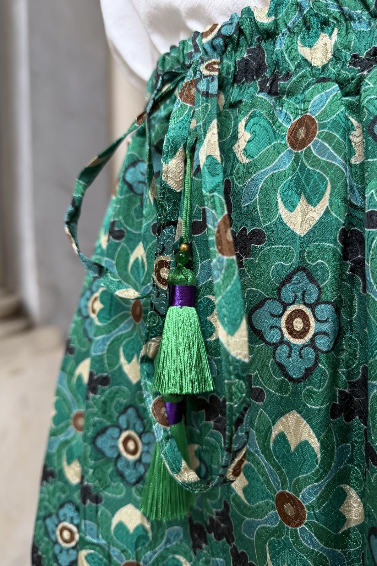 La trama jacquard floreale nei toni dello smeraldo, con accenti crema, azzurro e marrone, dona profondità e carattere al capo. Il disegno ricco ma equilibrato valorizza la fluidità del taglio palazzo, rendendolo ideale per look estivi freschi e sofisticati.
