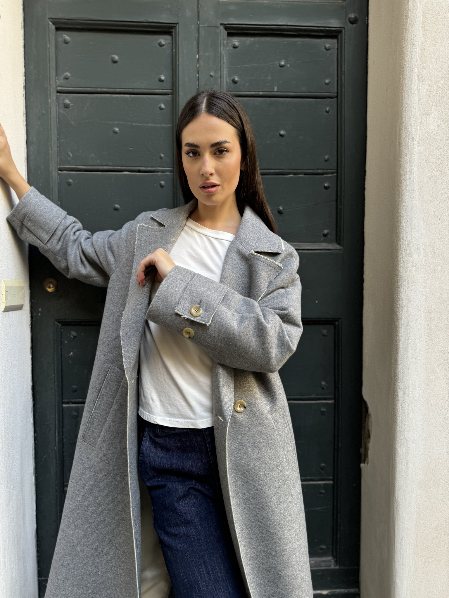Il cappotto Dalia unisce eleganza e comfort in una silhouette raffinata. Realizzato in tessuto morbido e strutturato, si presenta in un delicato tono perla che illumina la figura con sobria raffinatezza. Il modello lungo presenta chiusura con bottoni a vista, collo classico e tasche laterali inserite, dettagli che ne esaltano la linea pulita e versatile. Perfetto da indossare con look quotidiani o più formali, è un capo senza tempo da avere nel guardaroba.