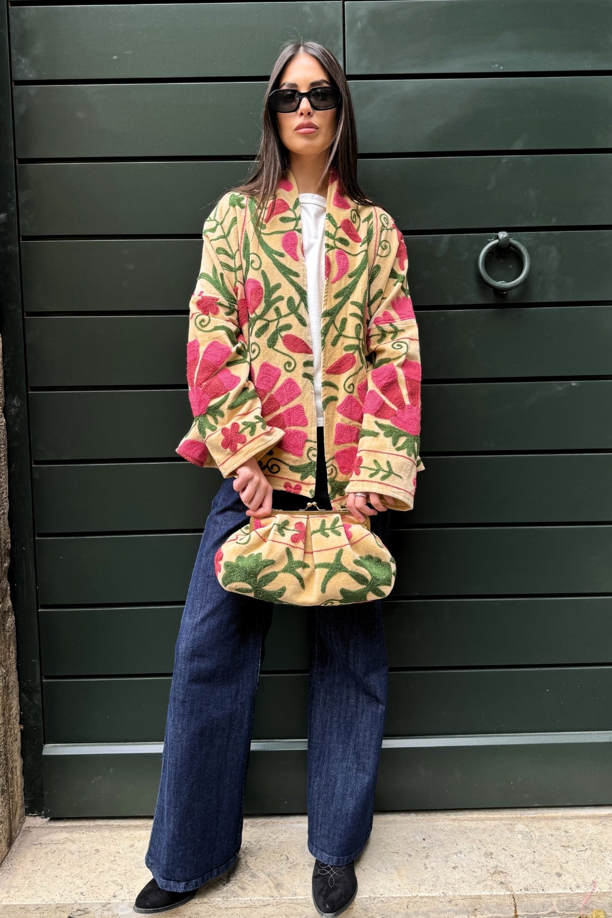 La borsetta Stella Ricamata a Mano, realizzata in velluto di cotone naturale, unisce la morbidezza del tessuto all’eleganza del ricamo artigianale. Ogni motivo è eseguito a mano, rendendo ogni borsa un pezzo unico, custode di un sapere antico e di una raffinatezza senza tempo.