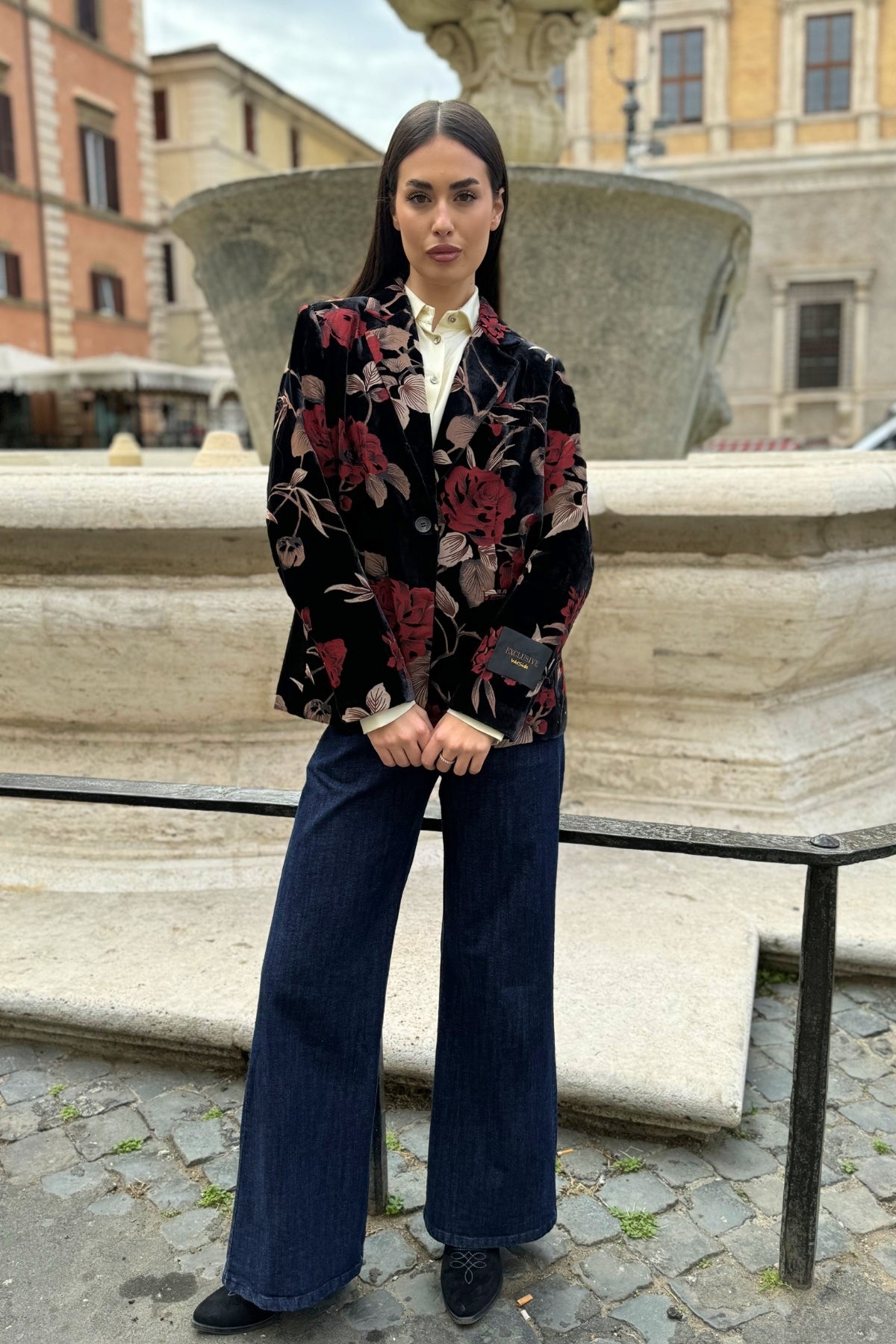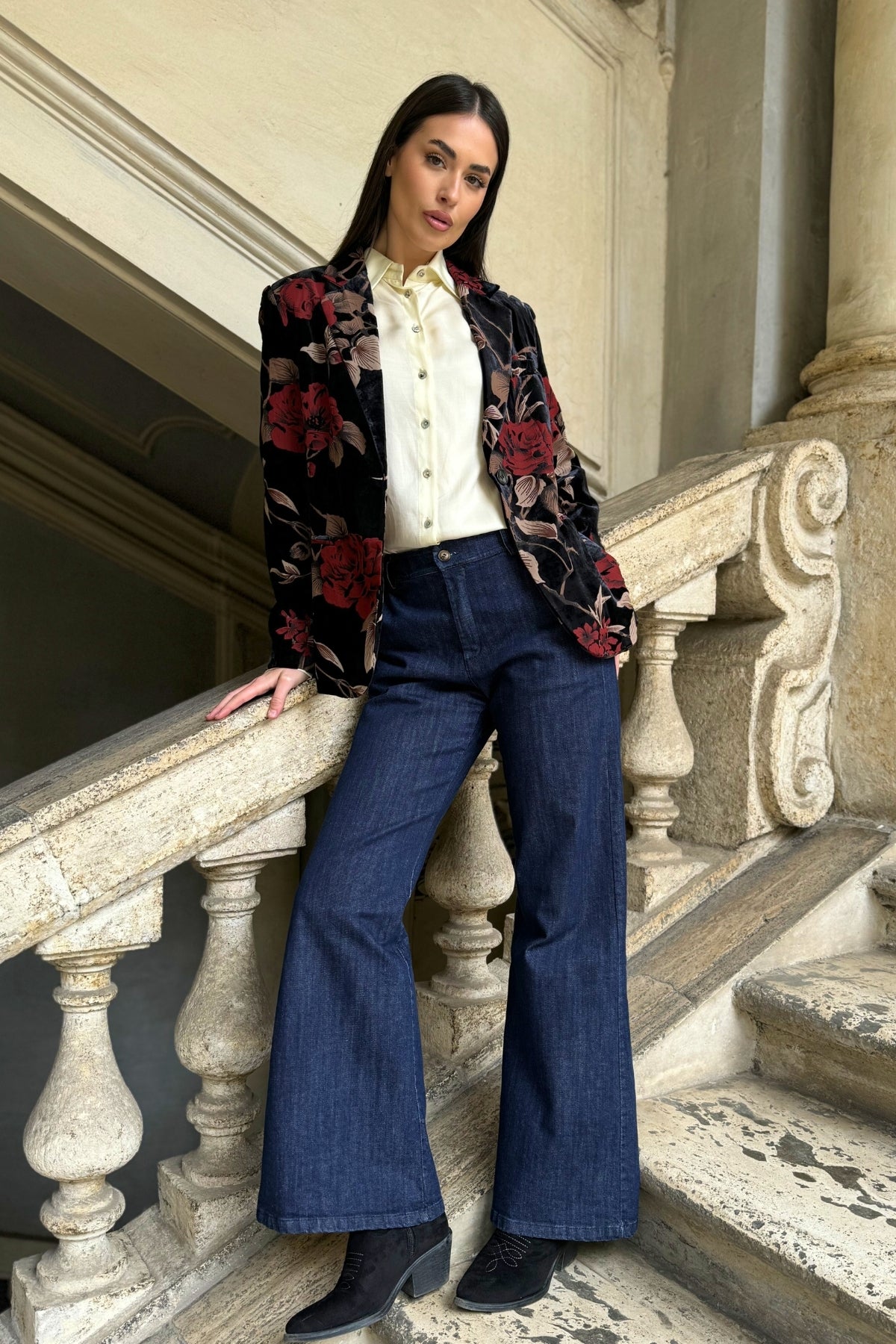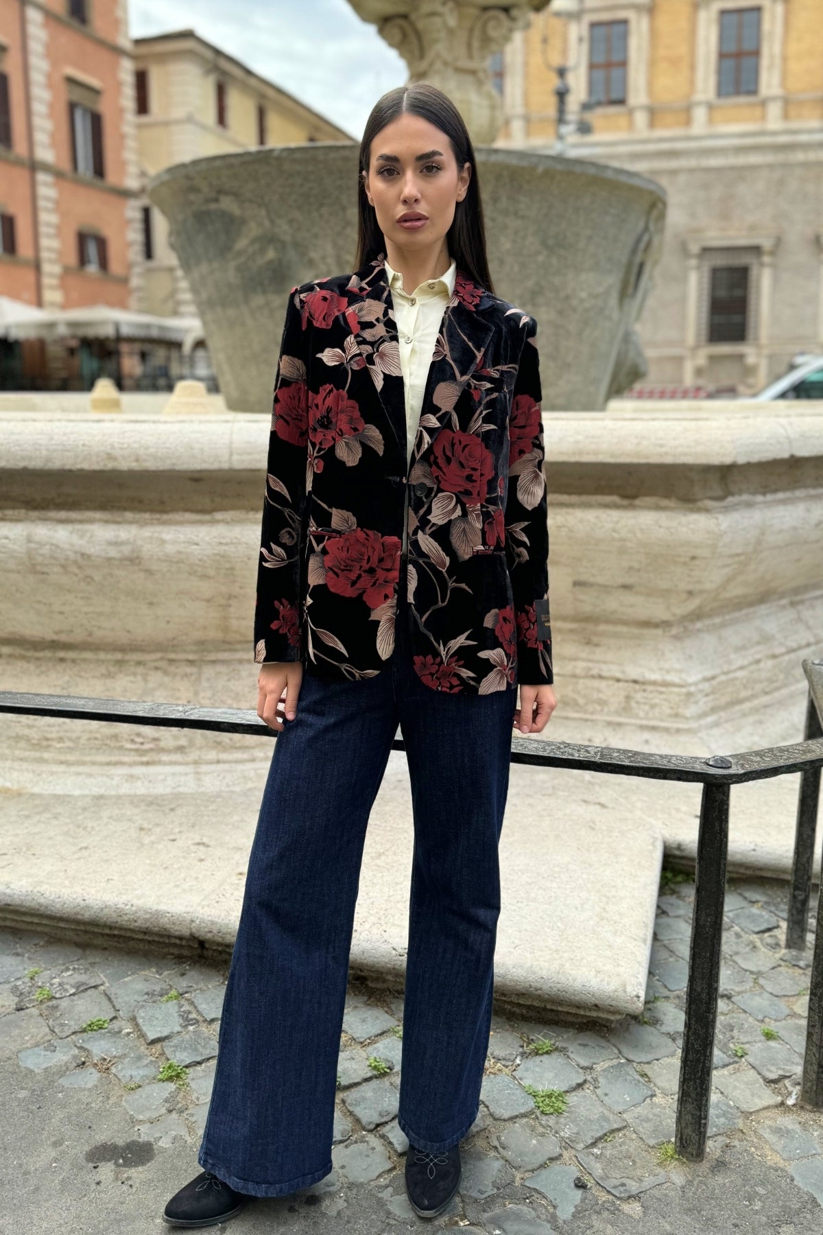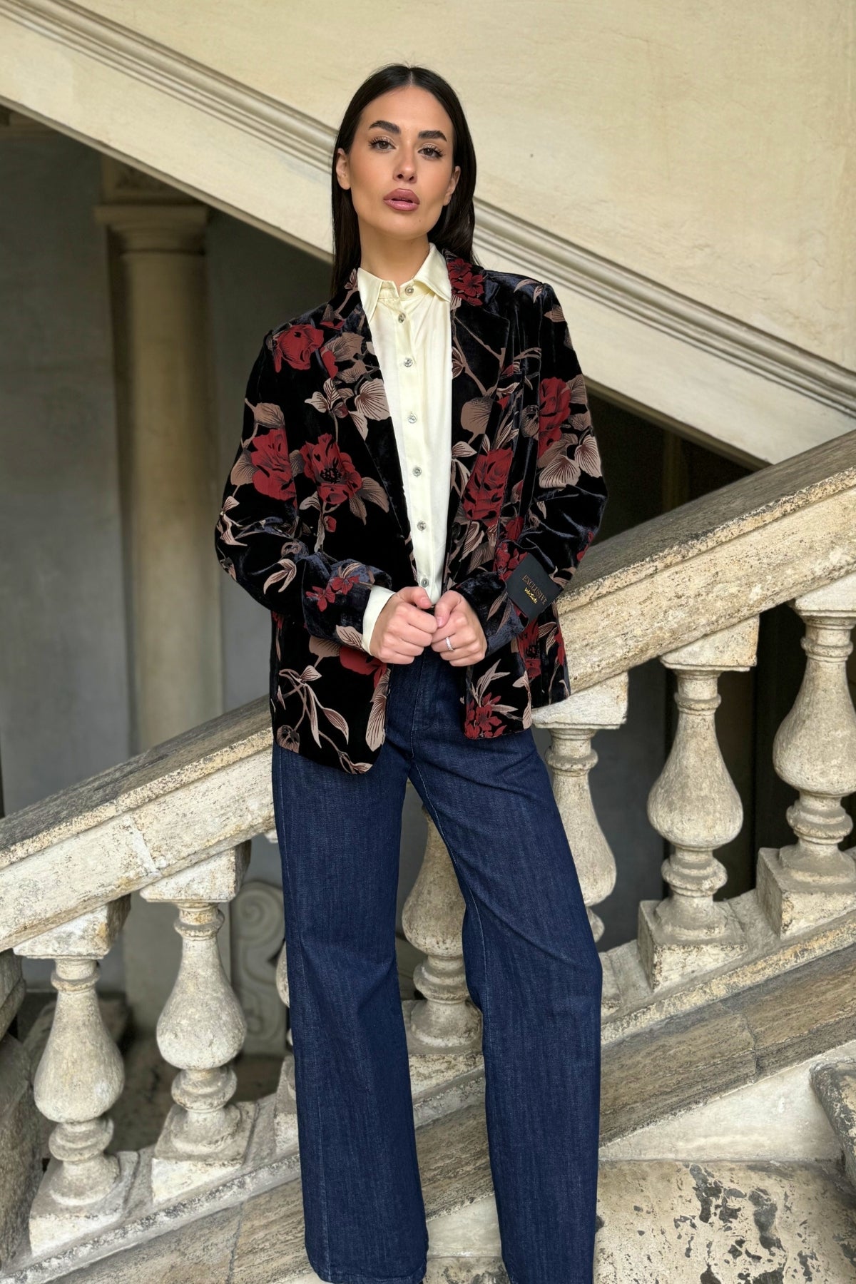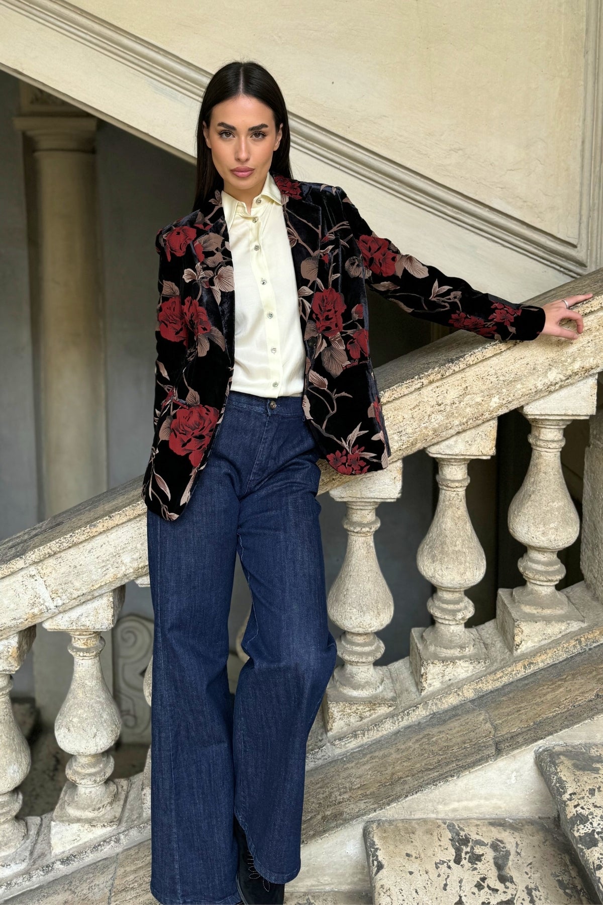 Una giacca elegante e scenografica, realizzata in velluto dévoré con stampa floreale nei toni rosso e beige su fondo nero.