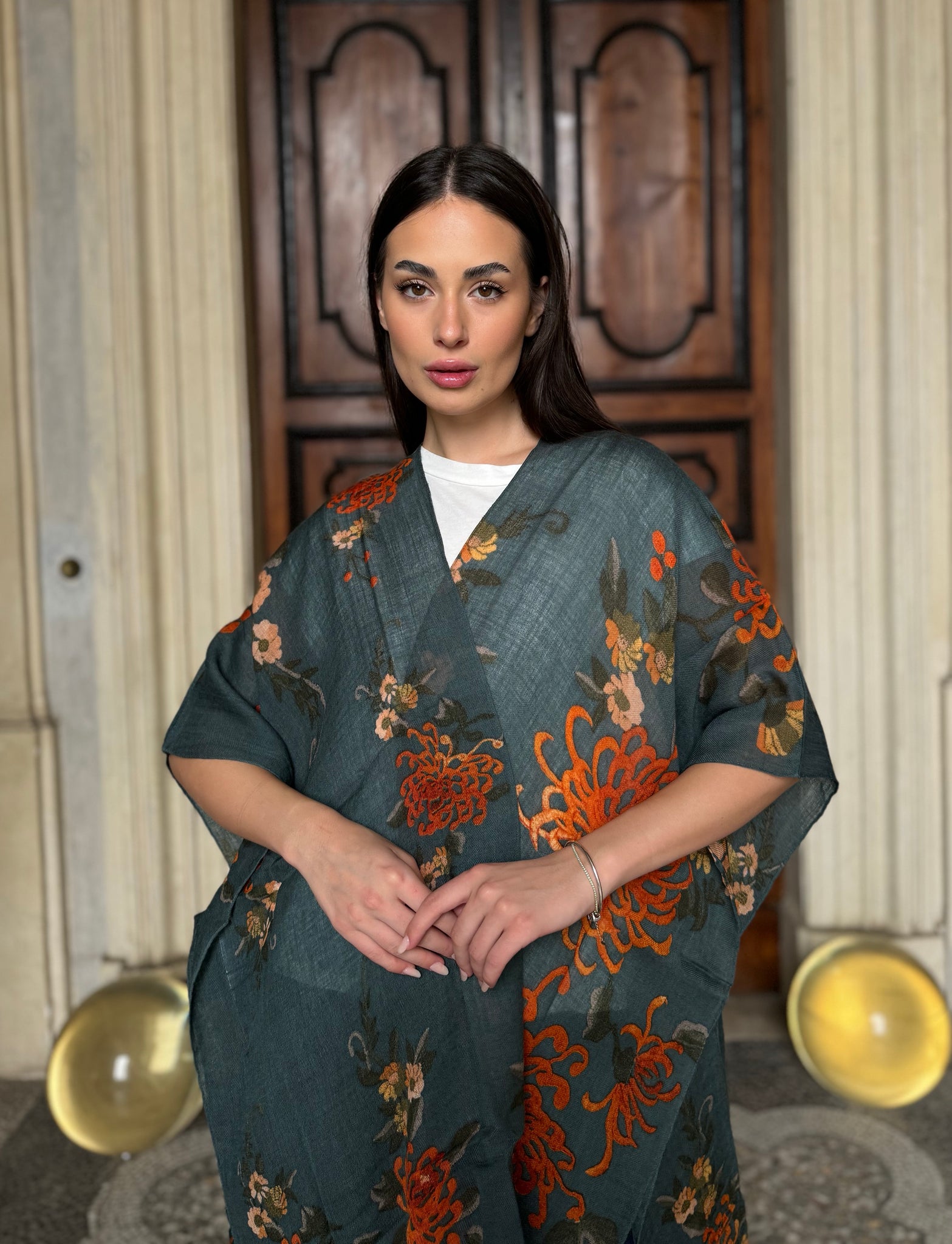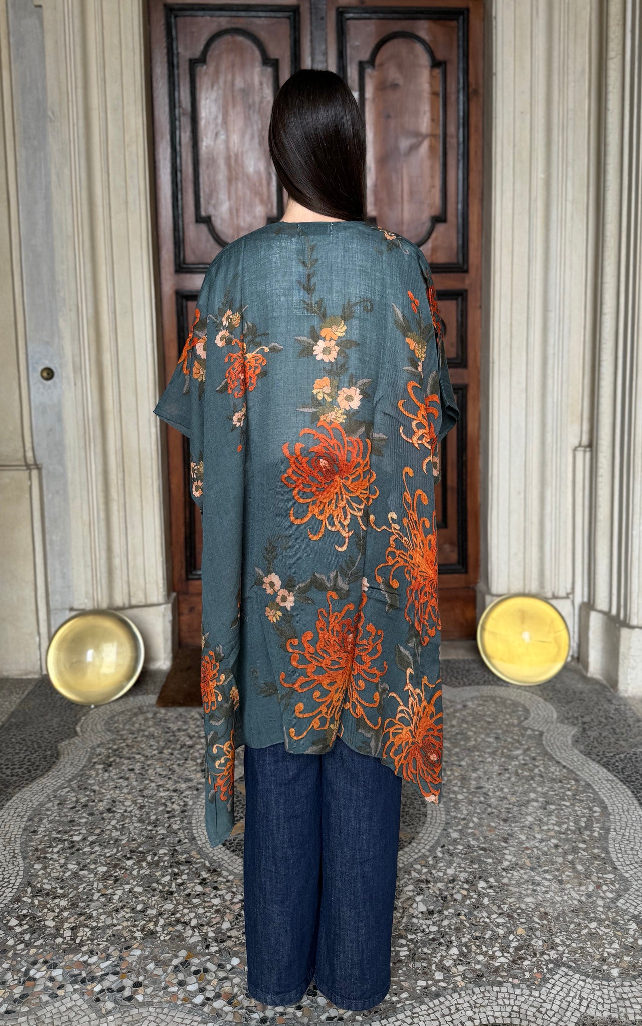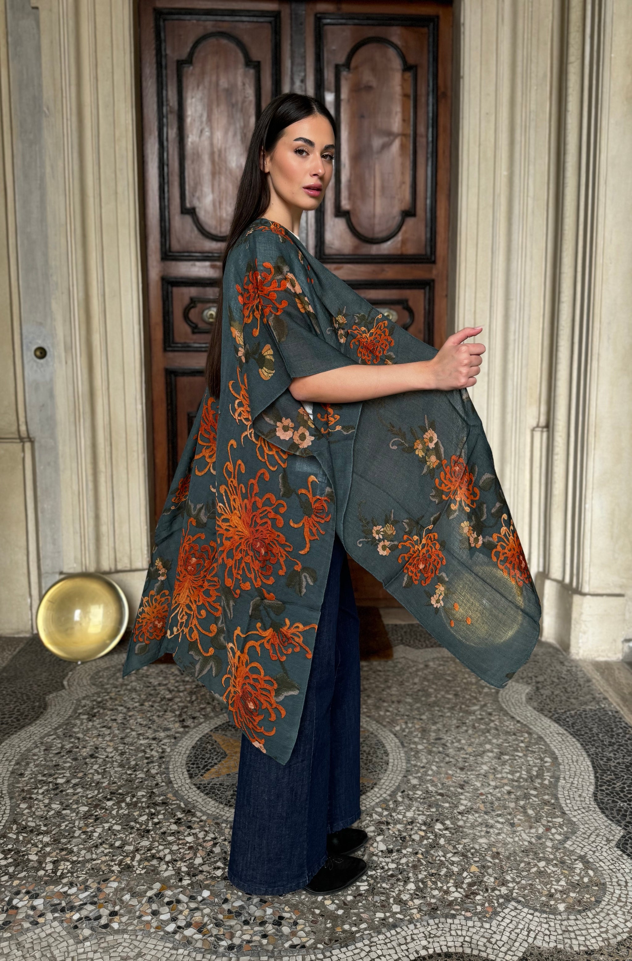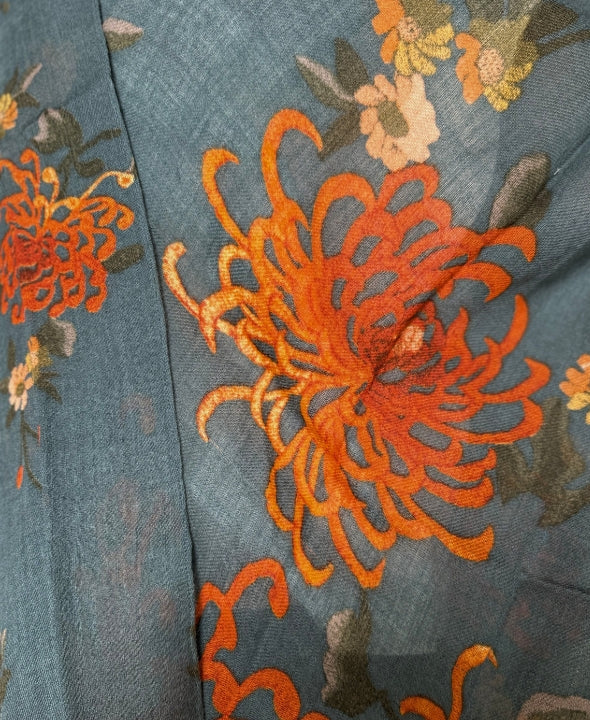 I grandi crisantemi arancio bruciato risaltano su una base grigia, creando un contrasto vibrante e raffinato che rende questo throwover unico e versatile.