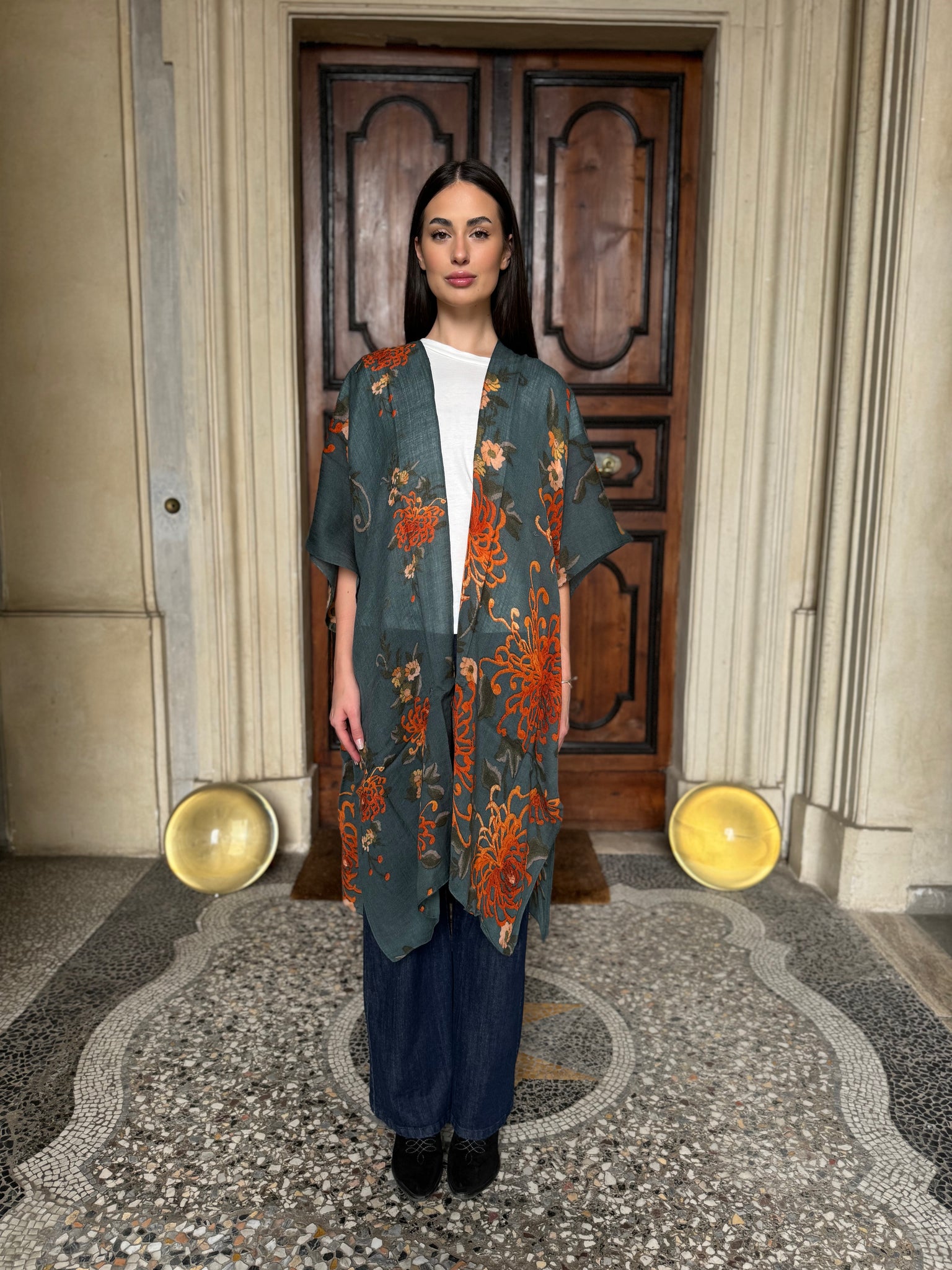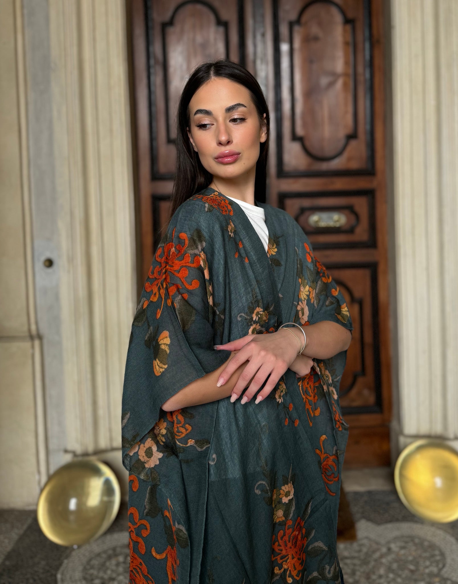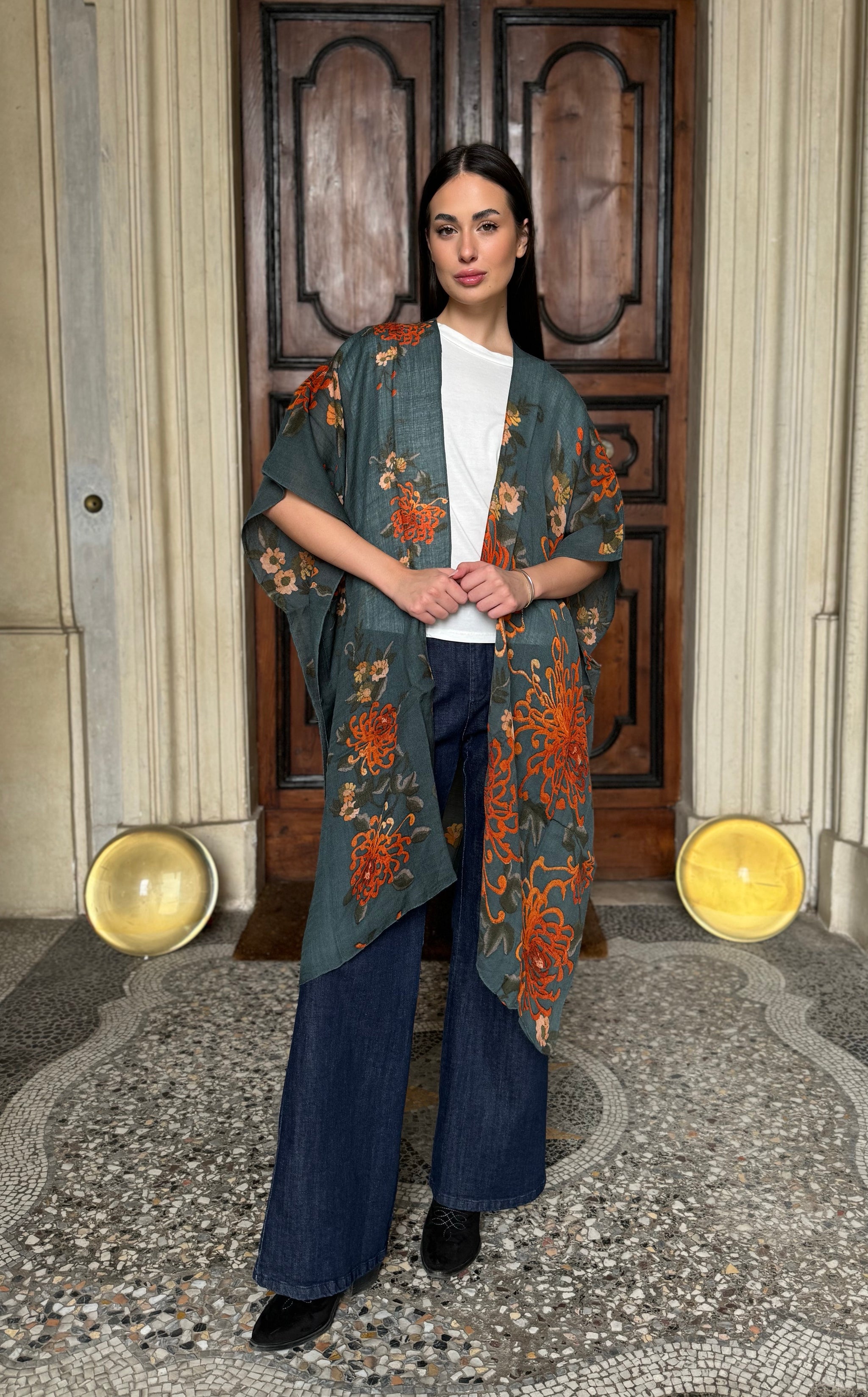I grandi crisantemi arancio bruciato risaltano su una base grigia, creando un contrasto vibrante e raffinato che rende questo throwover unico e versatile.