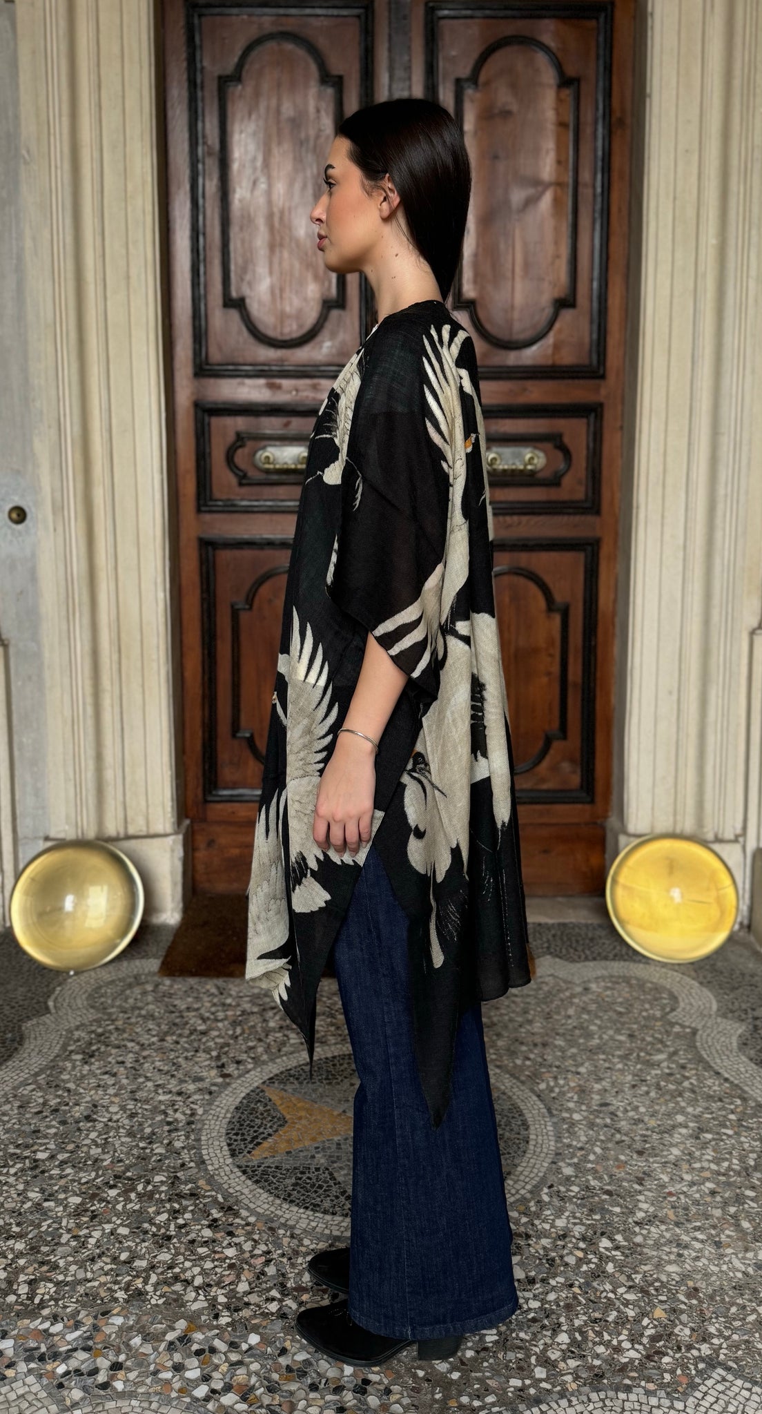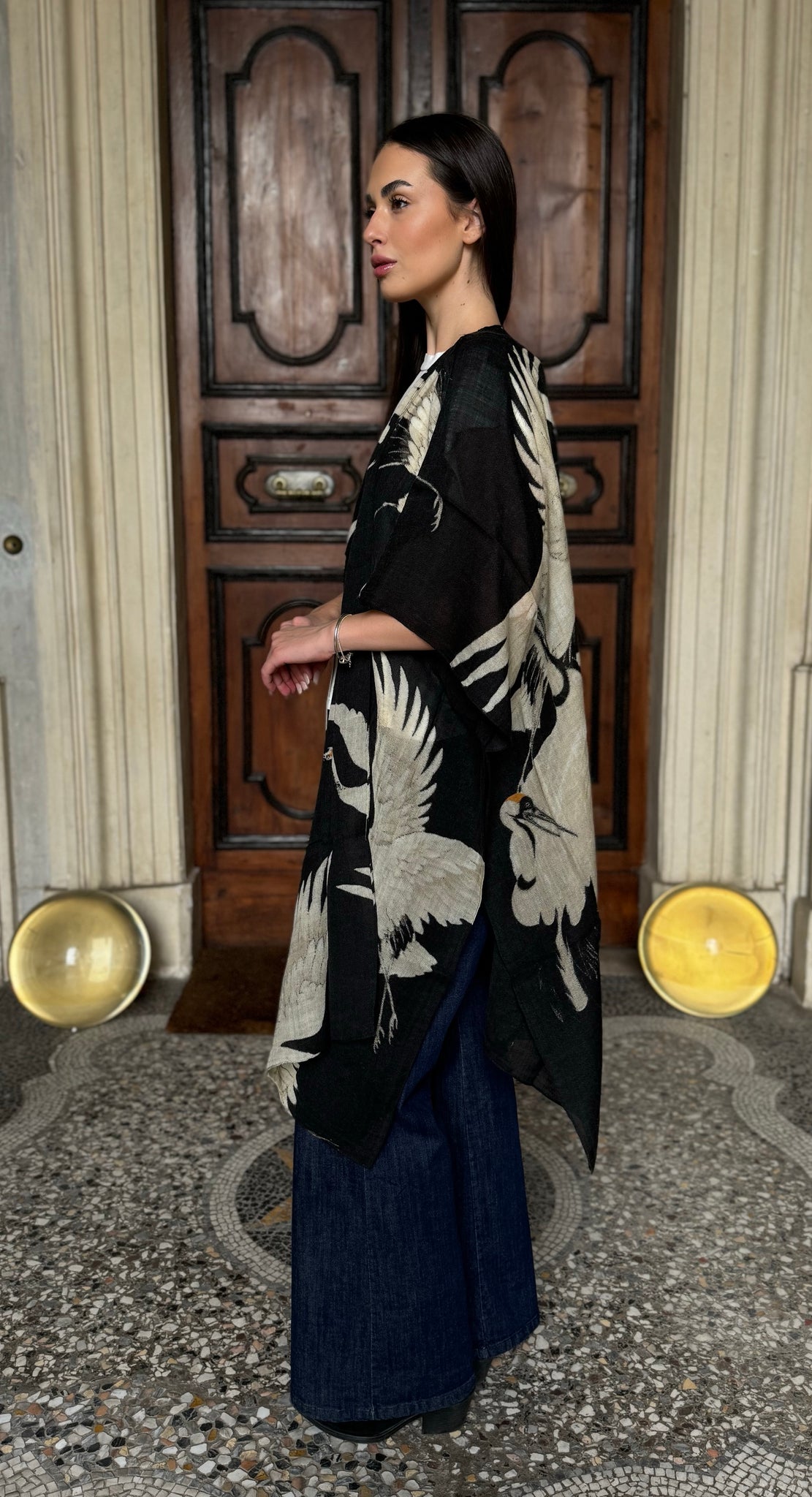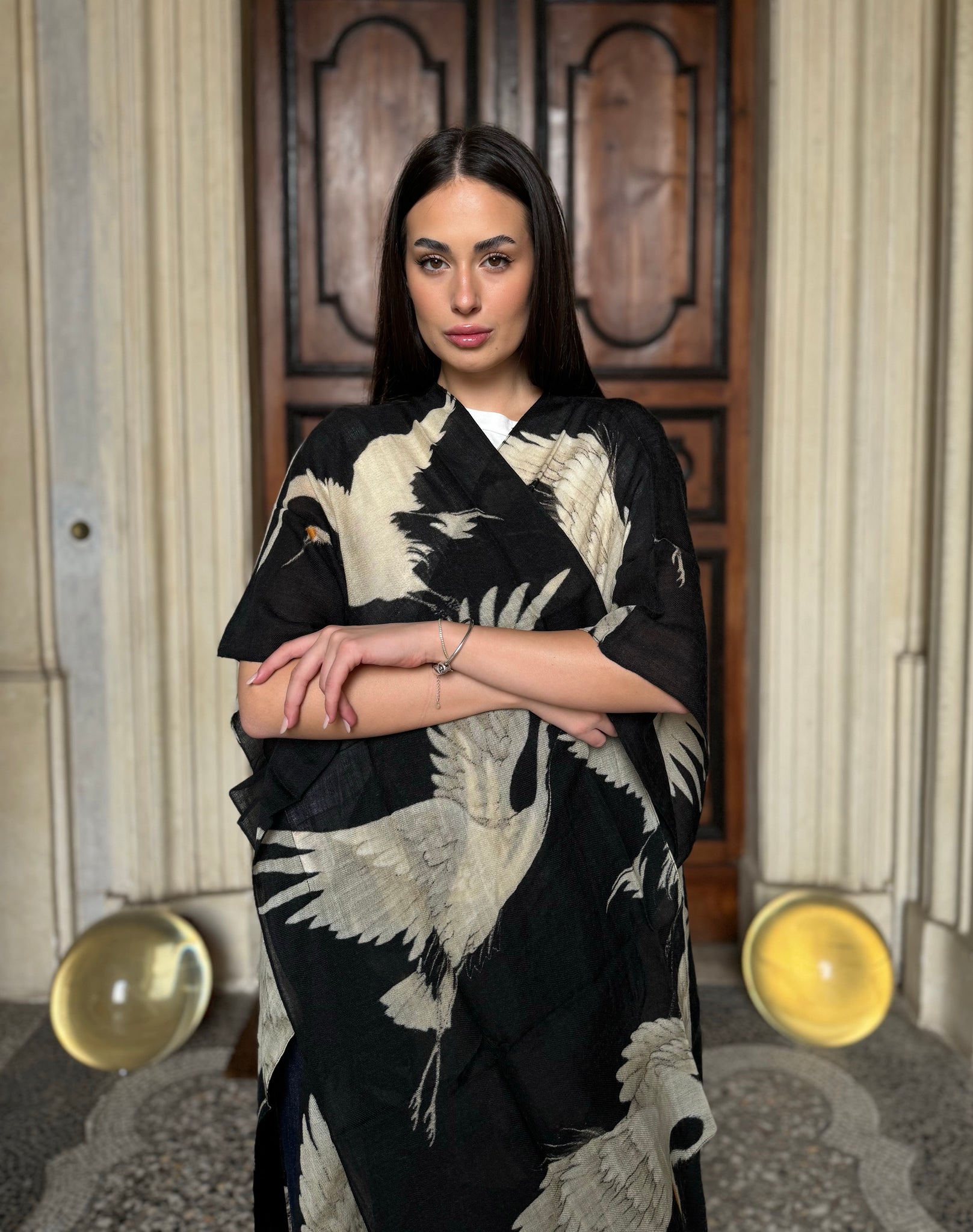 Un capo avvolgente e intramontabile, realizzato in pura lana, dalla vestibilità fluida, ideale per aggiungere calore e raffinatezza durante le stagioni più fresche. Le cicogne avorio e beige si stagliano su una base nera opaca, creando un elegante gioco di contrasti che dona equilibrio tra naturalezza e modernità.