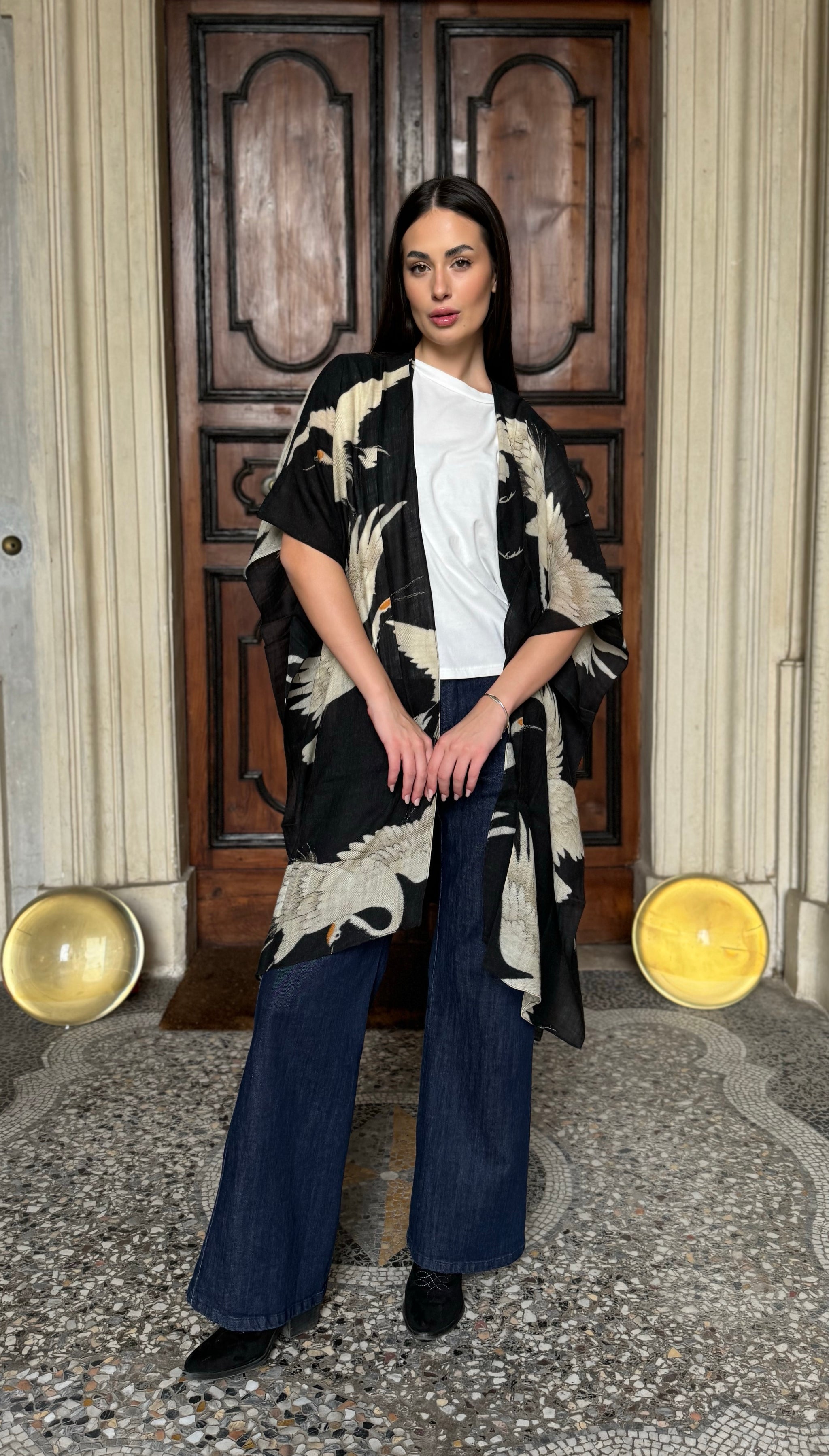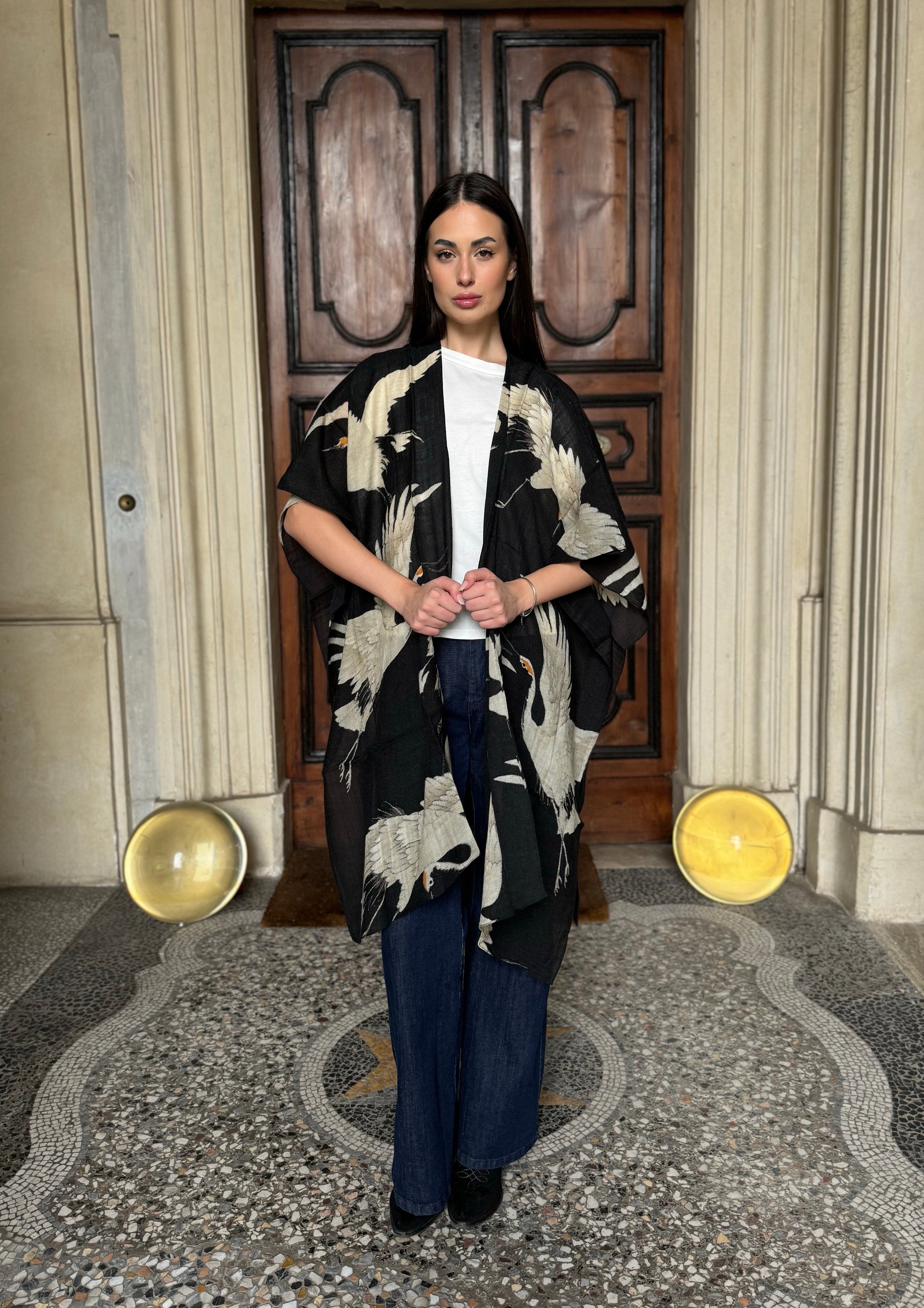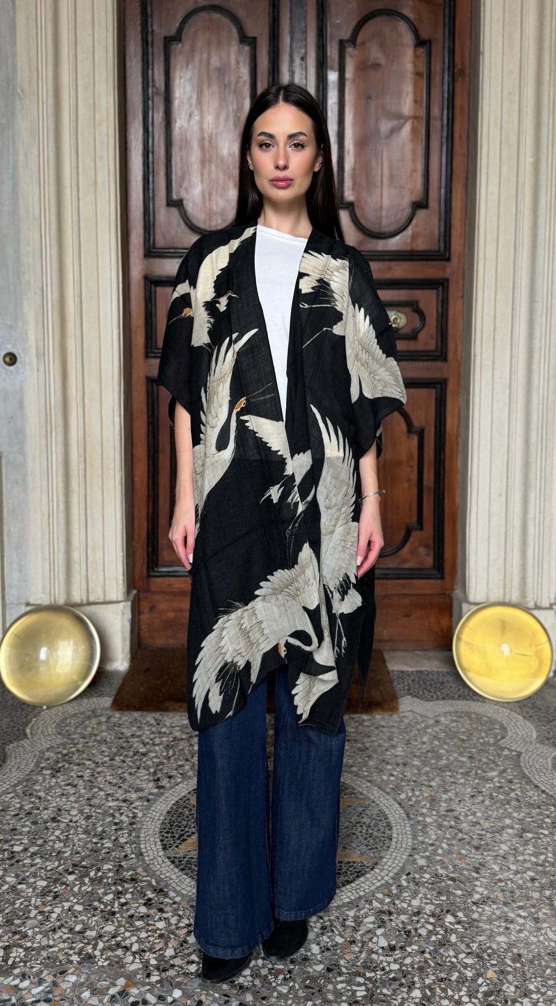Un capo avvolgente e intramontabile, realizzato in pura lana, dalla vestibilità fluida, ideale per aggiungere calore e raffinatezza durante le stagioni più fresche. Le cicogne avorio e beige si stagliano su una base nera opaca, creando un elegante gioco di contrasti che dona equilibrio tra naturalezza e modernità.