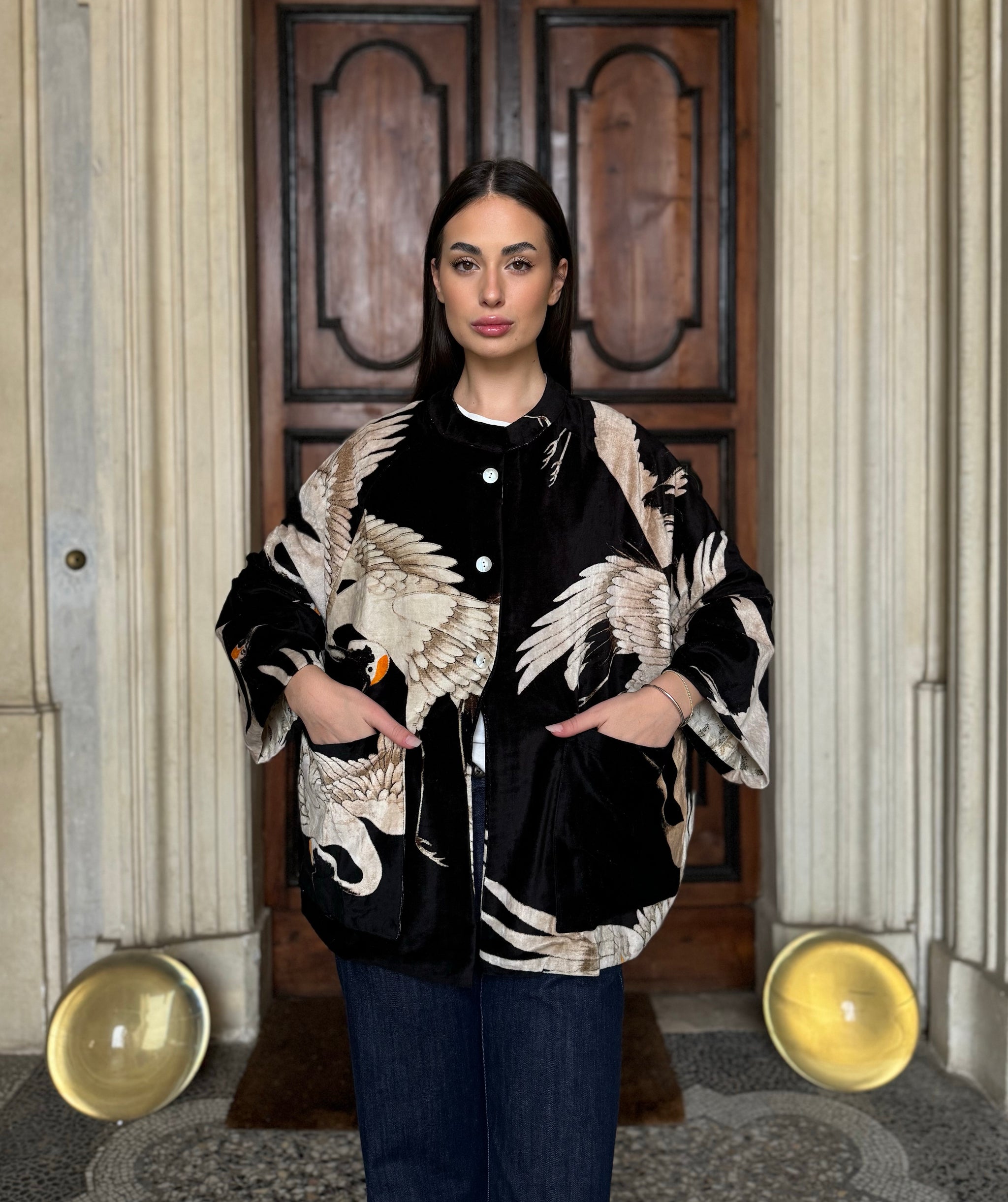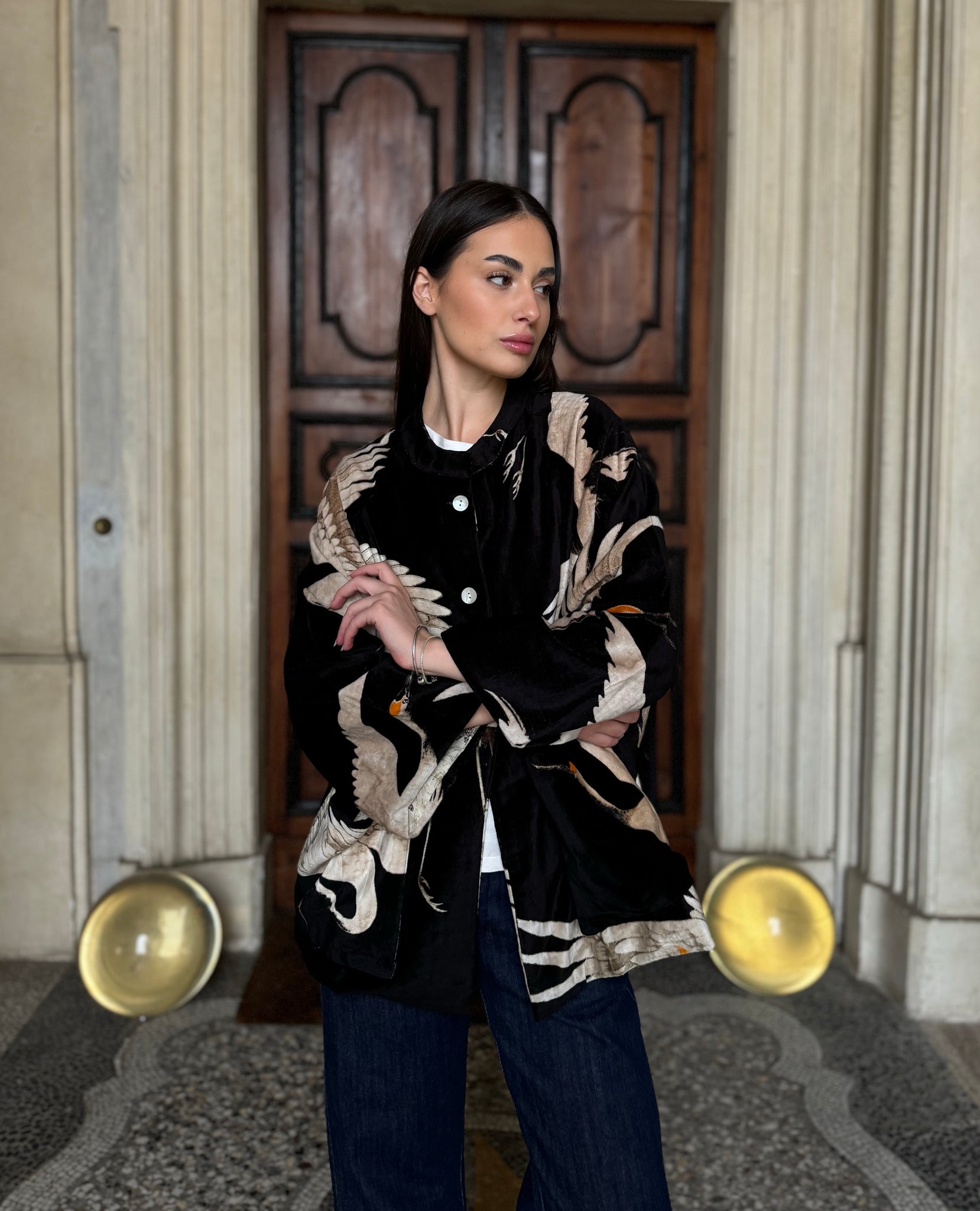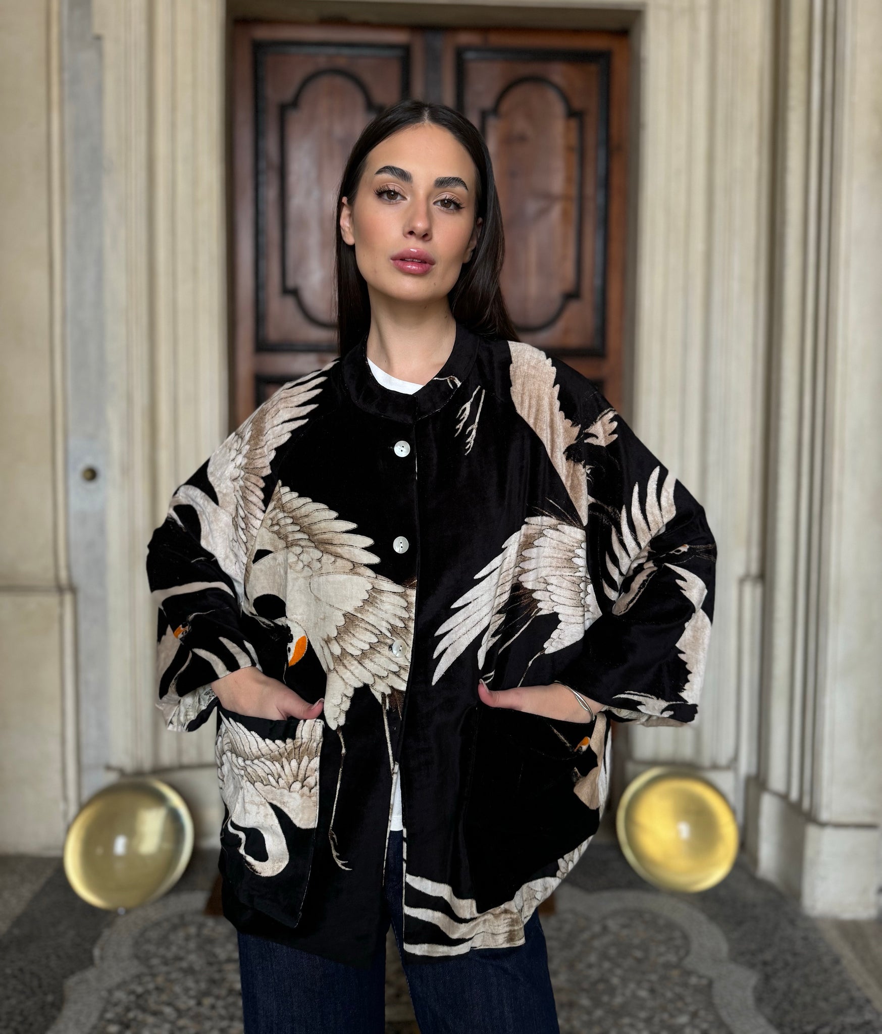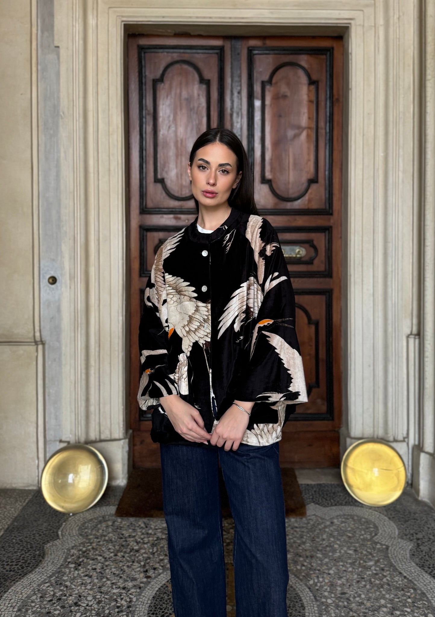 La Stork Black raffigura eleganti cicogne in tonalità sabbia e crema su base nera opaca, creando un contrasto raffinato e deciso. Il modello corto, con colletto alla coreana, tasche a toppa e bottoni in madreperla, offre una vestibilità fluida e confortevole: perfetta per elevare i look di stagione.