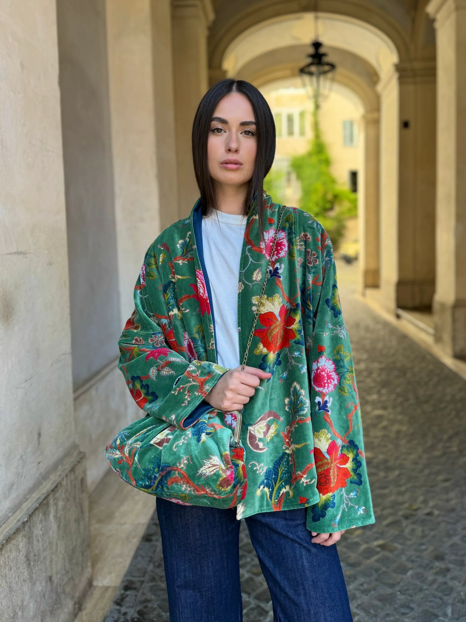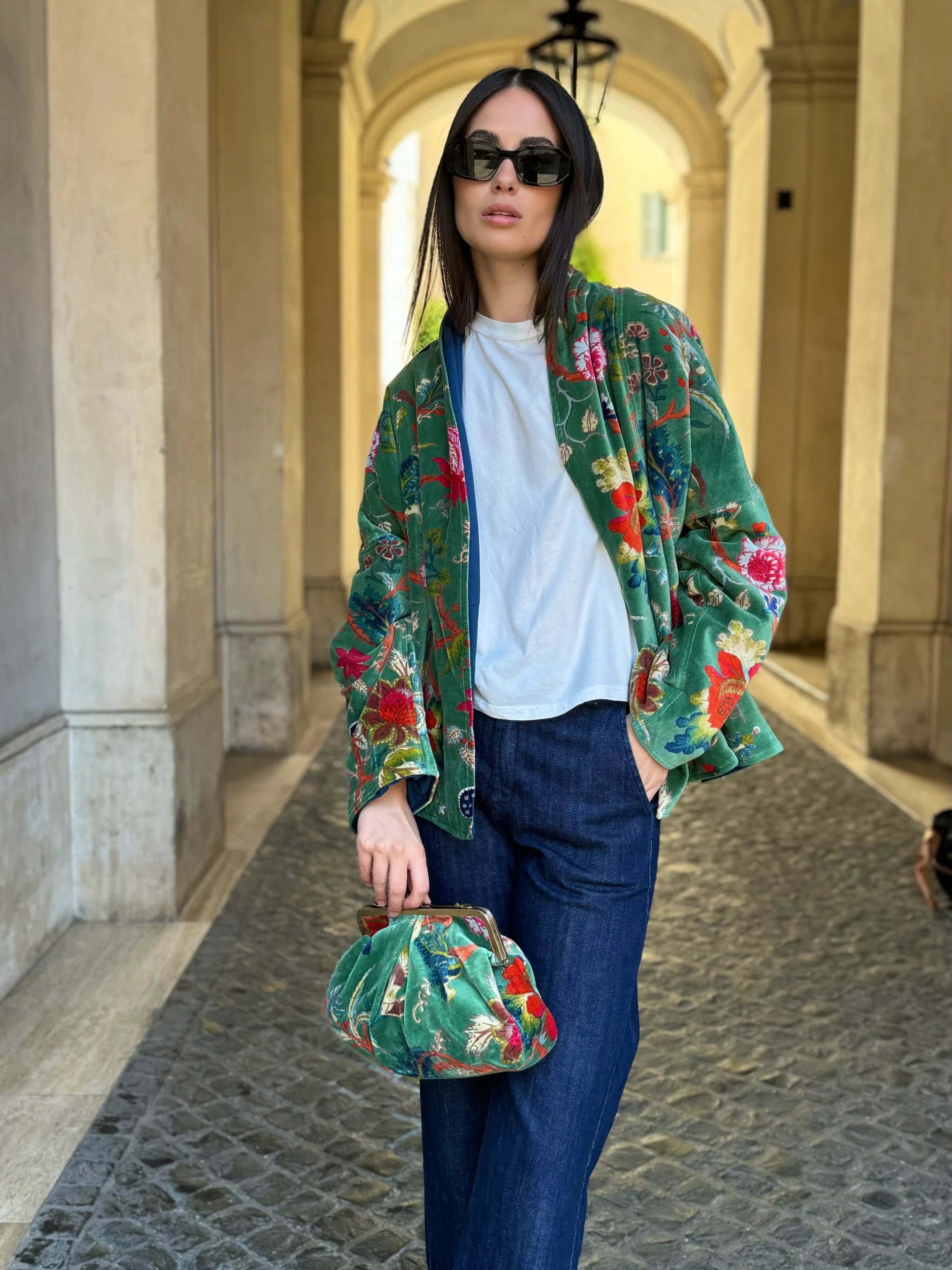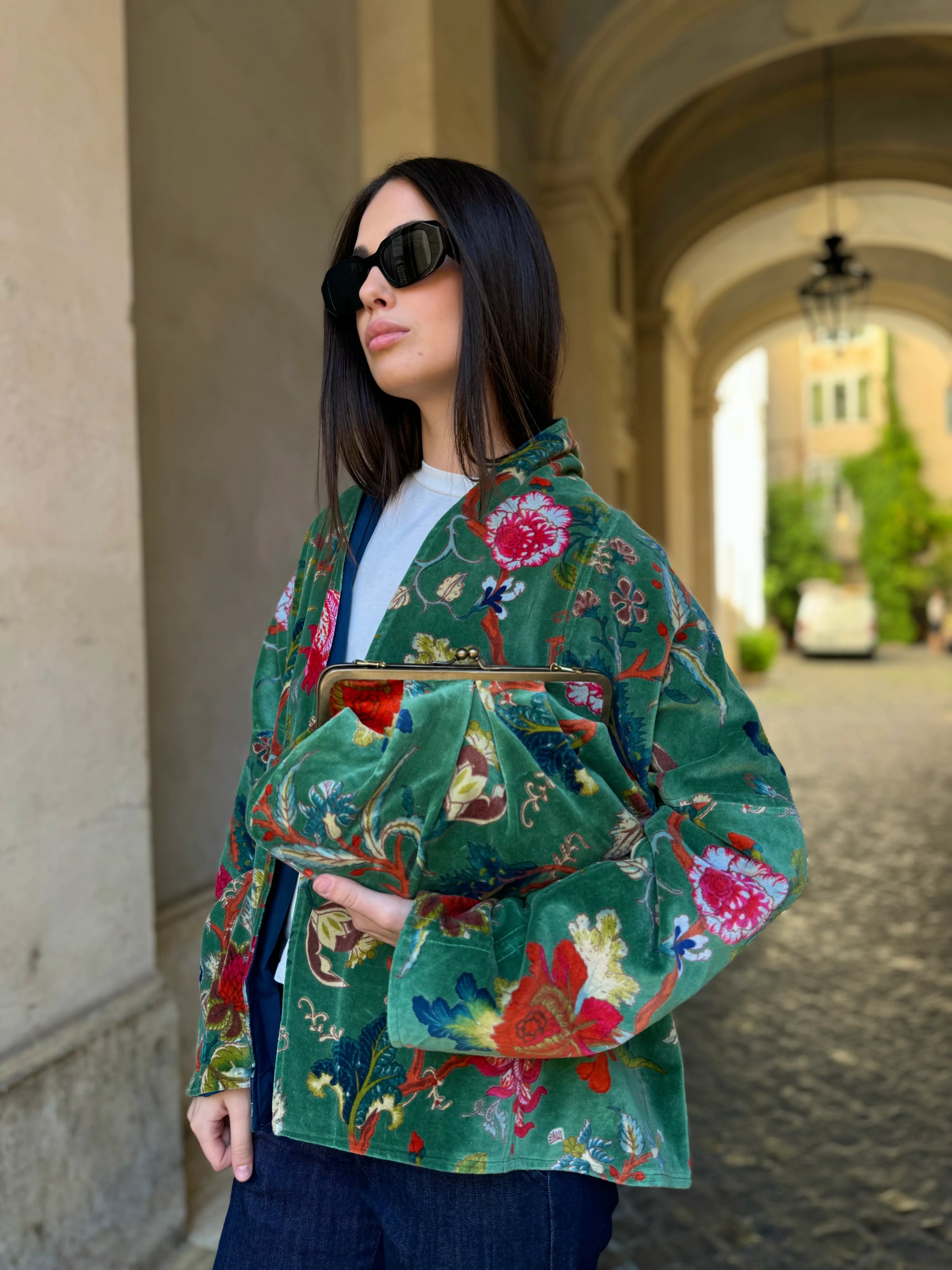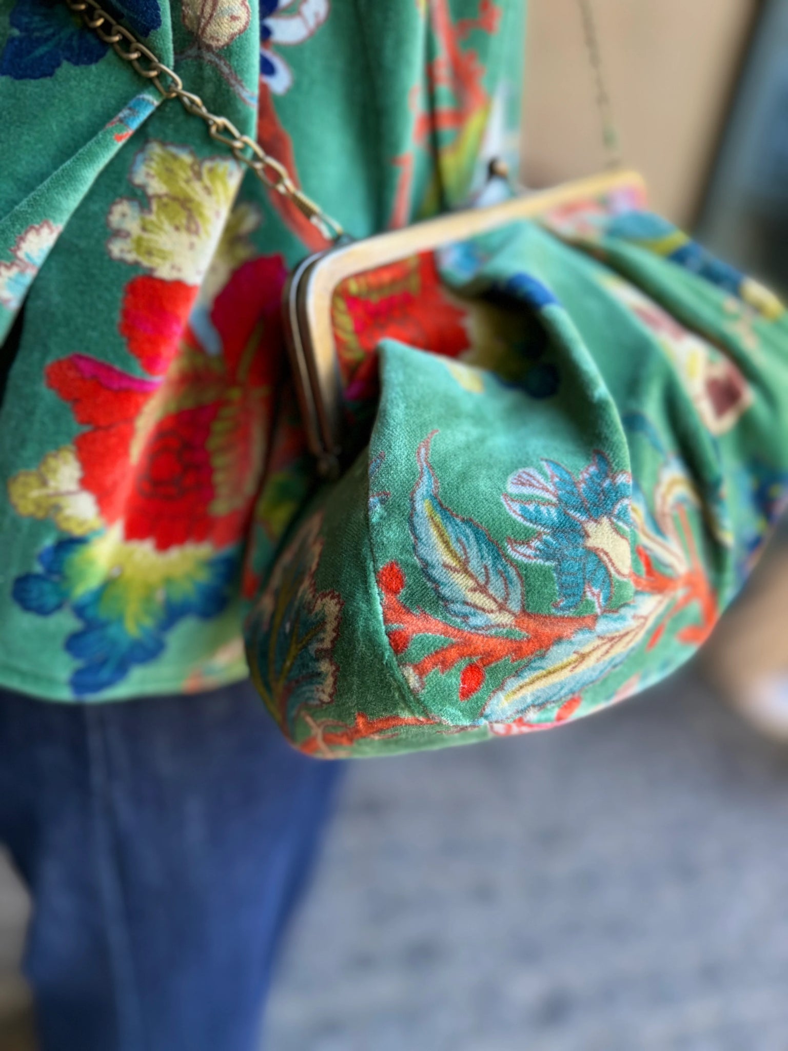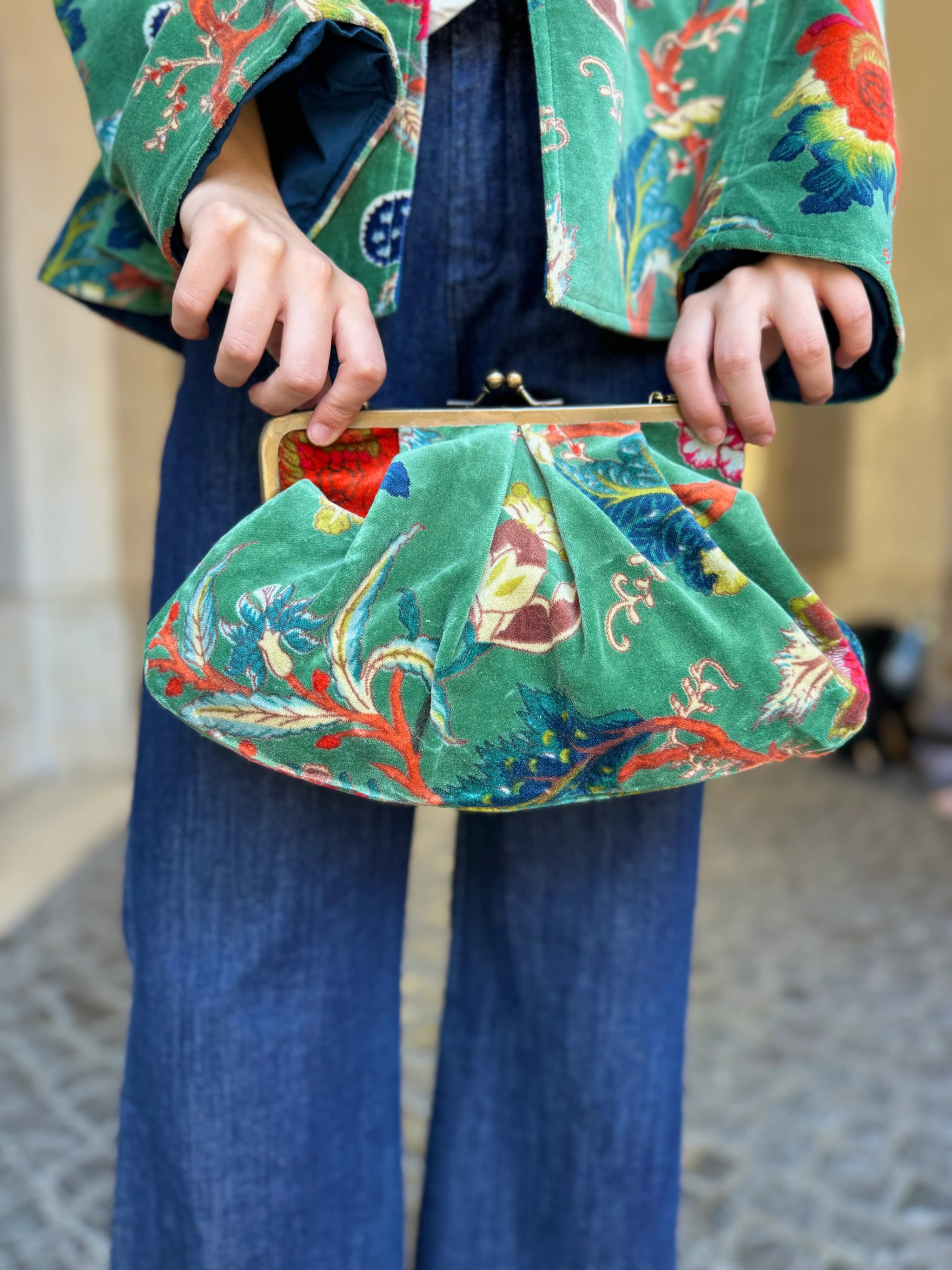 La borsetta Stella Brera Savoia di Artefilia Milano unisce il fascino del classico modello “pasticcino” alla ricercatezza del velluto di cotone stampato a mano. Compatta e funzionale, è arricchita da fantasie esclusive che la trasformano in un piccolo gioiello di stile. Le sfumature profonde del Verde Savoia, ispirate al quartiere milanese di Brera, raccontano un perfetto equilibrio tra tradizione e modernità, rendendola un accessorio distintivo e senza tempo.