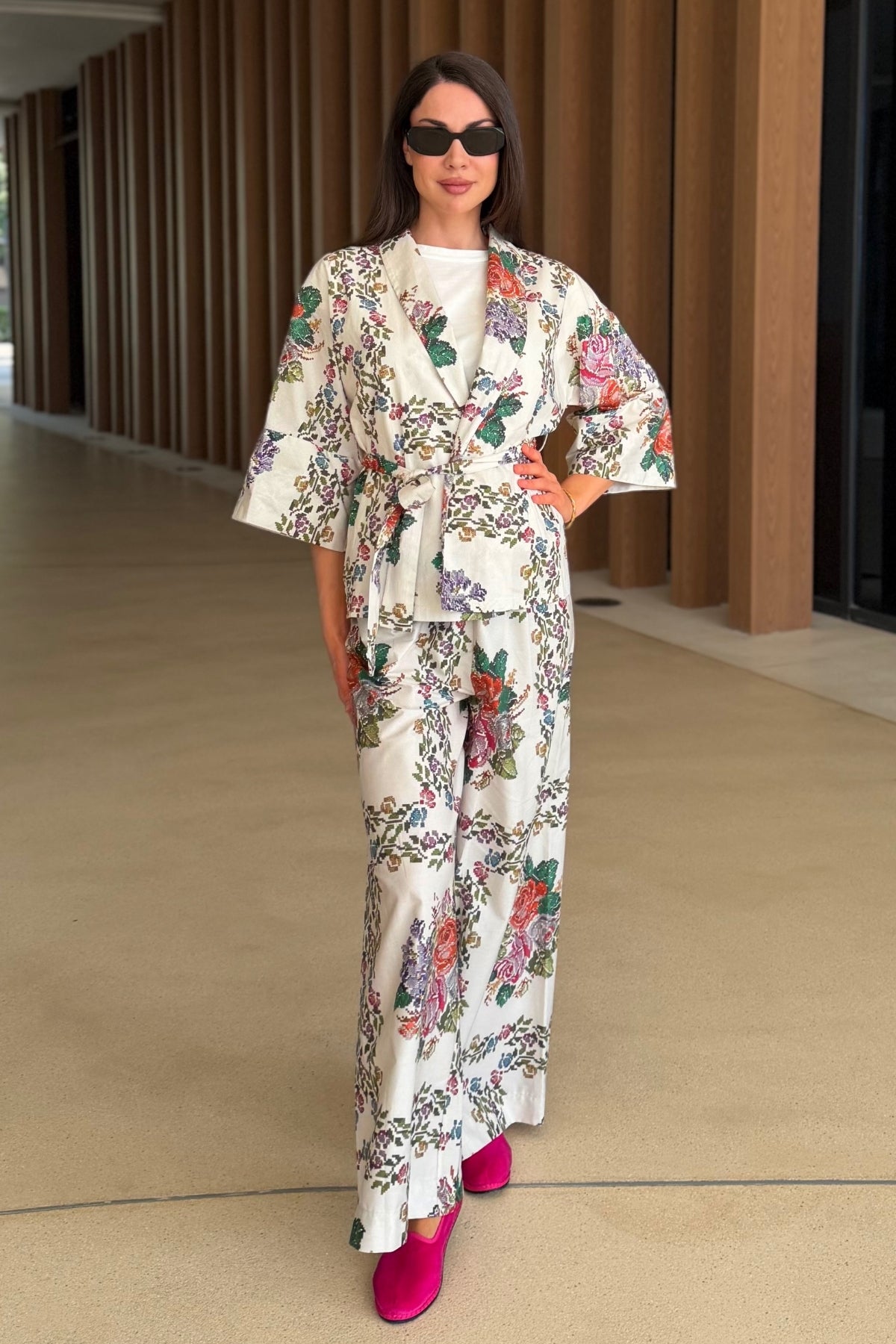 La disposizione verticale della fantasia, alternata a composizioni floreali più ampie, crea ritmo e struttura lungo la gamba, valorizzando la linearità del pantalone e slanciando la figura. Il contrasto tra la luminosità del fondo e la ricchezza cromatica dei fiori genera un effetto sofisticato ma equilibrato.