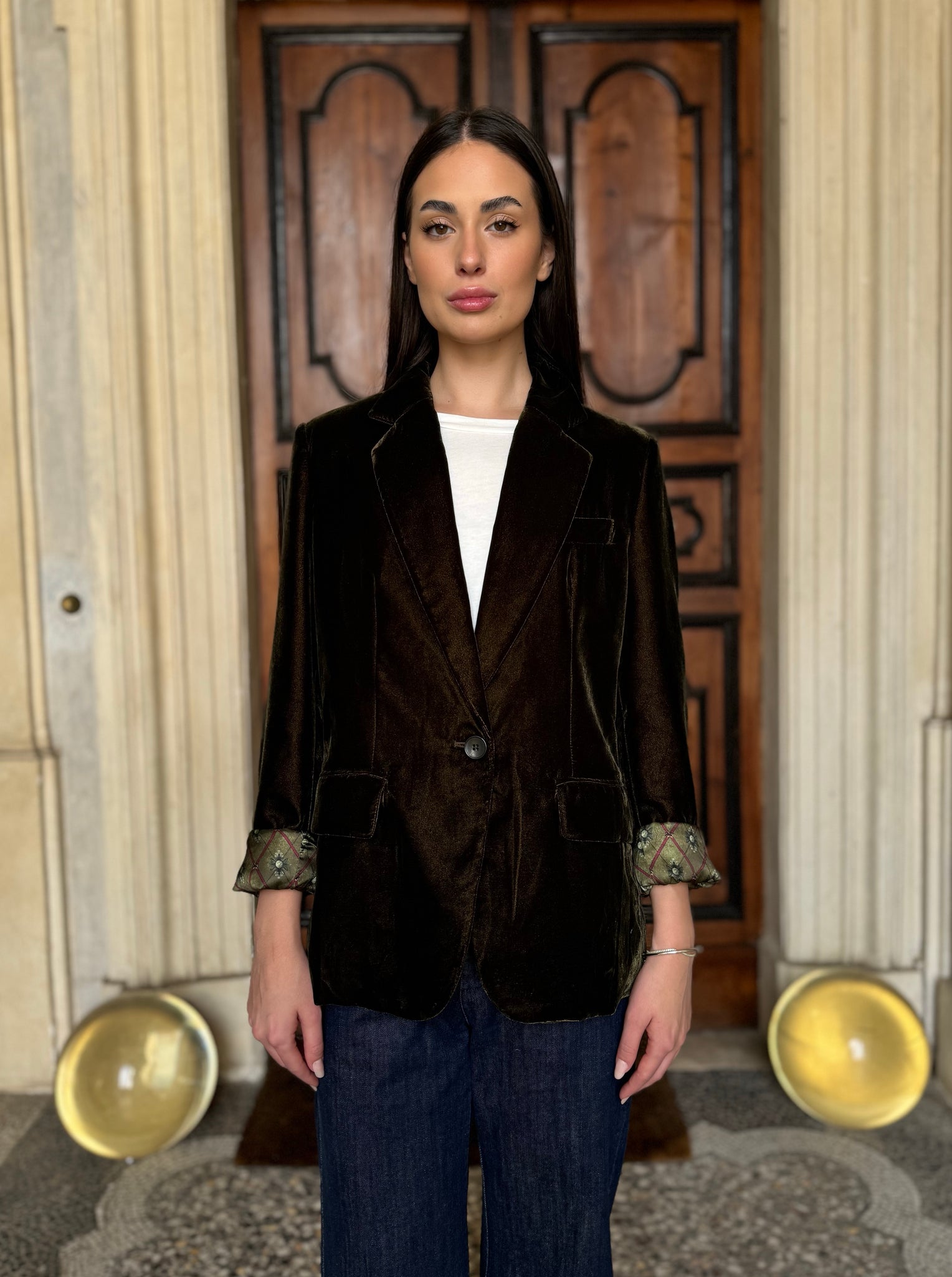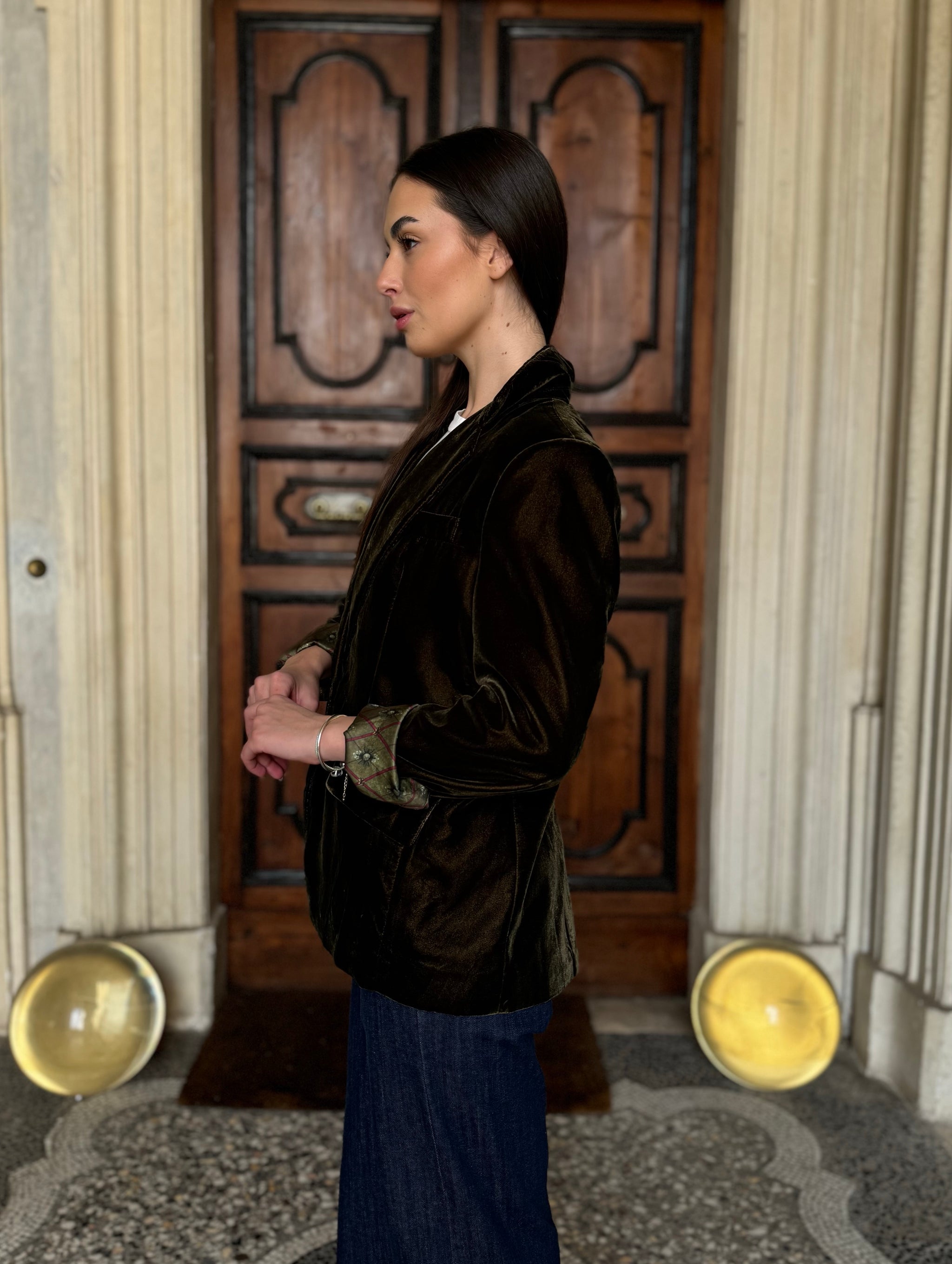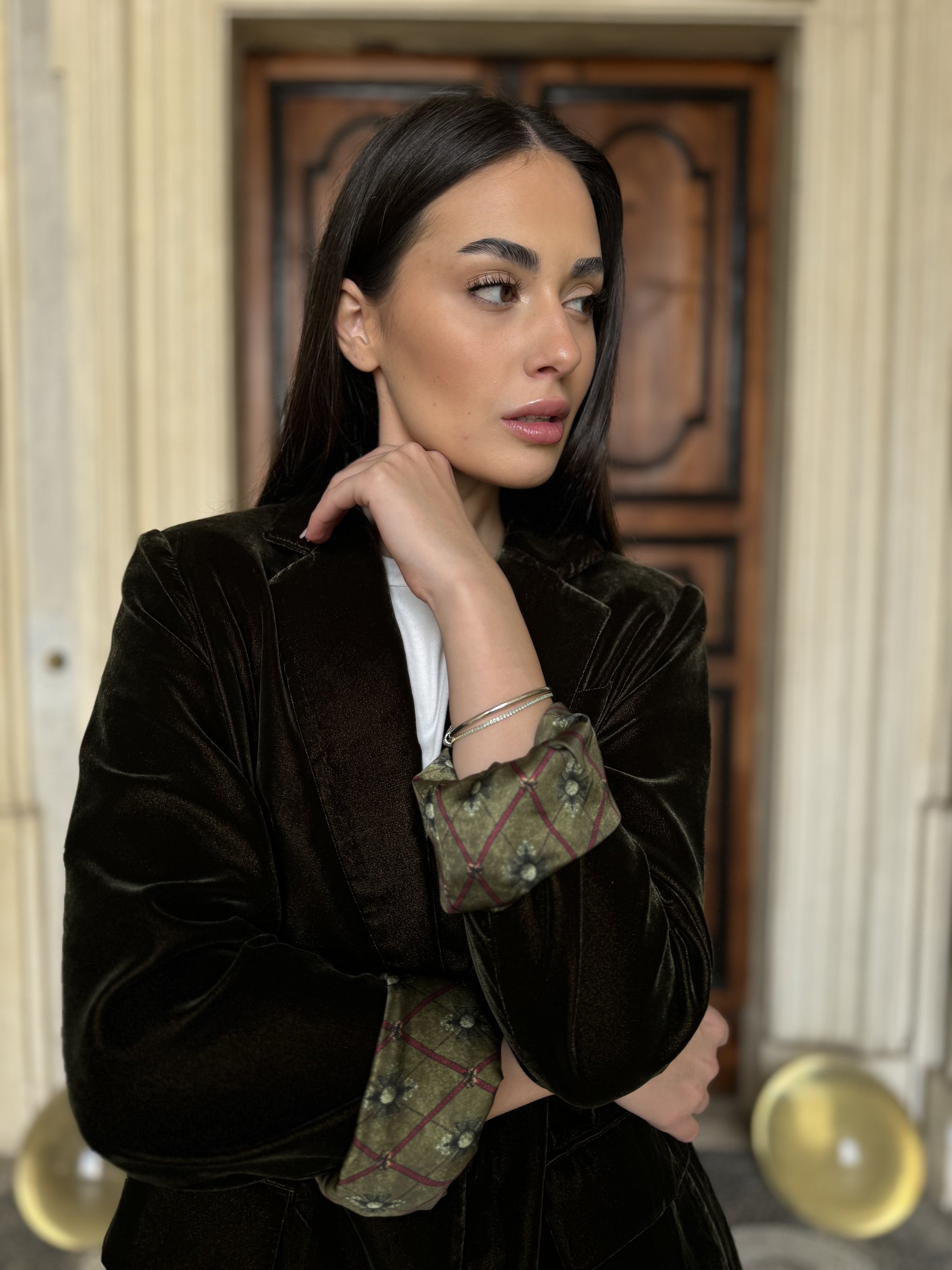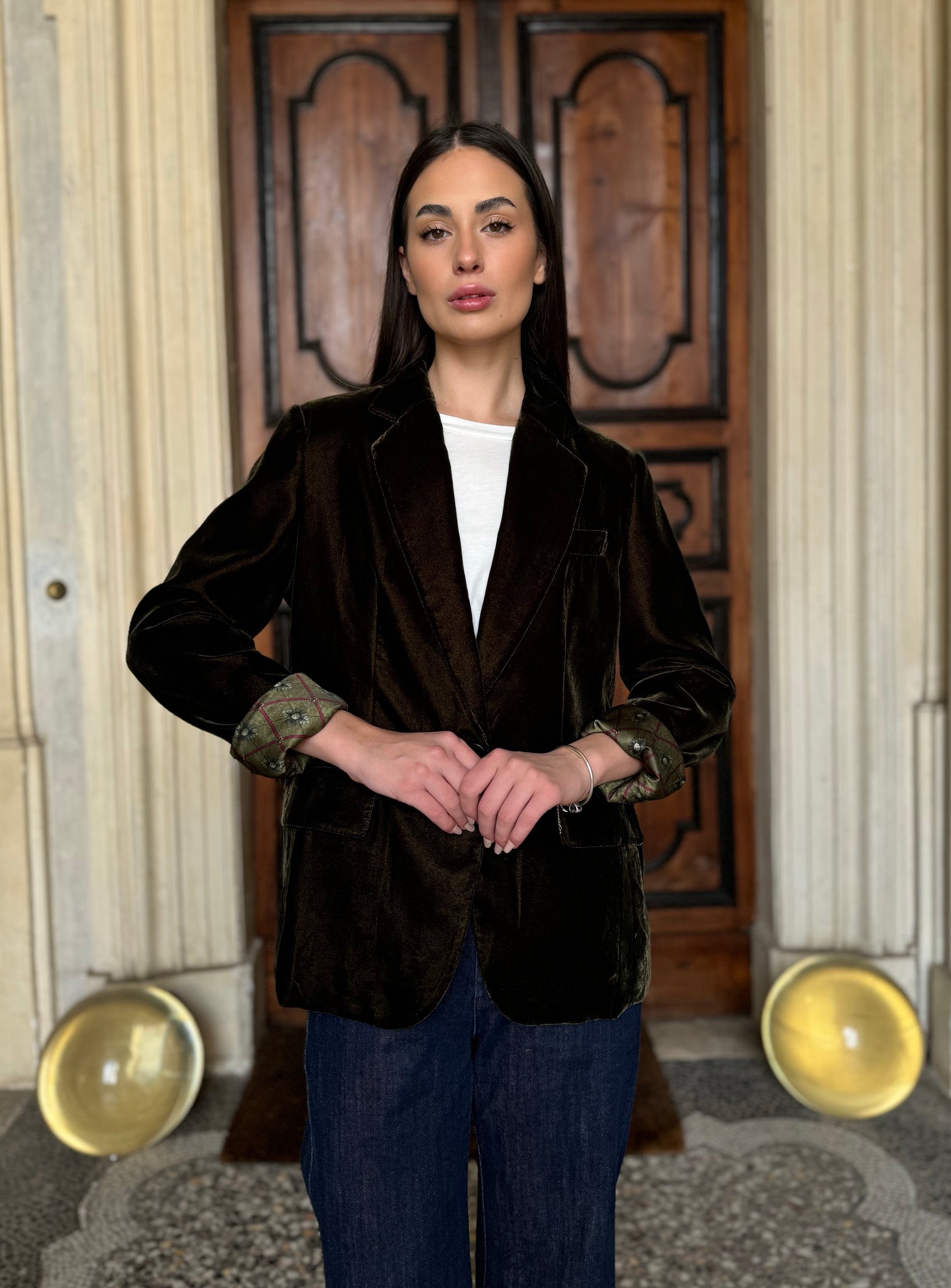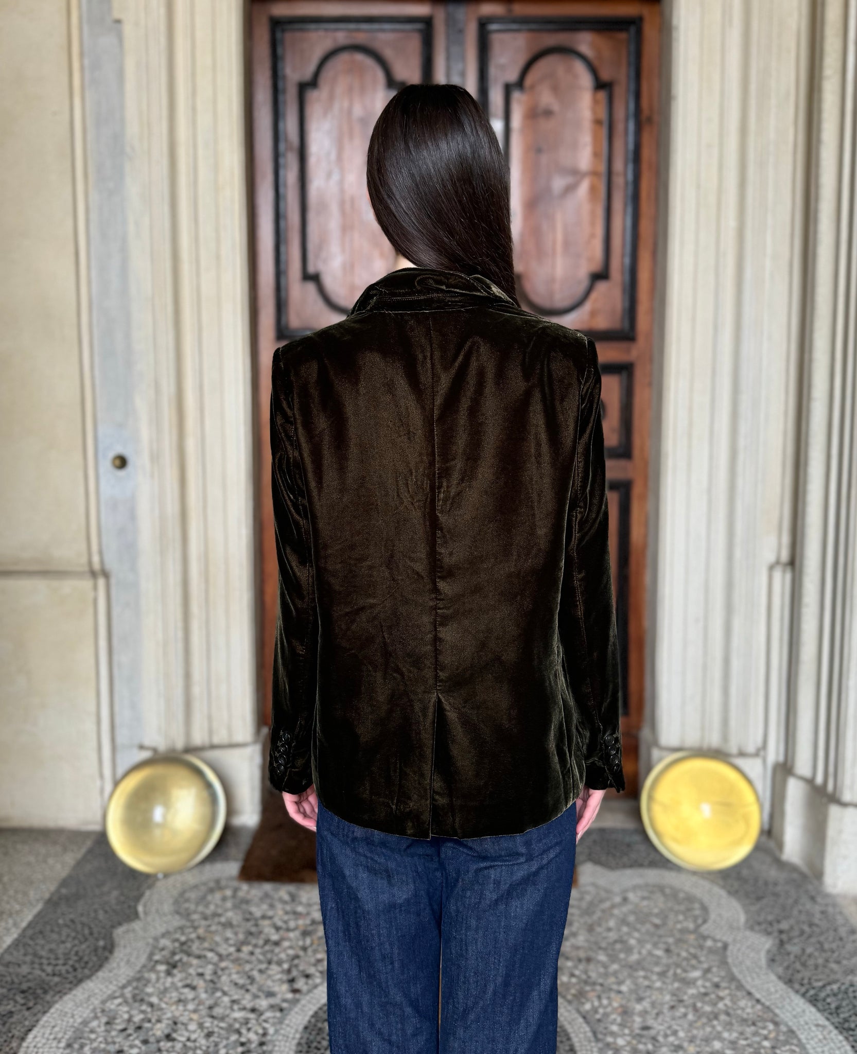 Giacca in velluto made in Italy dalla linea classica e dall’eleganza intramontabile. Il tessuto morbido e luminoso mette in risalto la profondità del verde scuro, mentre il risvolto interno fantasia aggiunge un tocco raffinato e inatteso. Il modello monopetto con revers e tasche applicate combina stile sartoriale e comfort quotidiano, rendendolo un capo versatile, perfetto da indossare sia con look formali che casual.