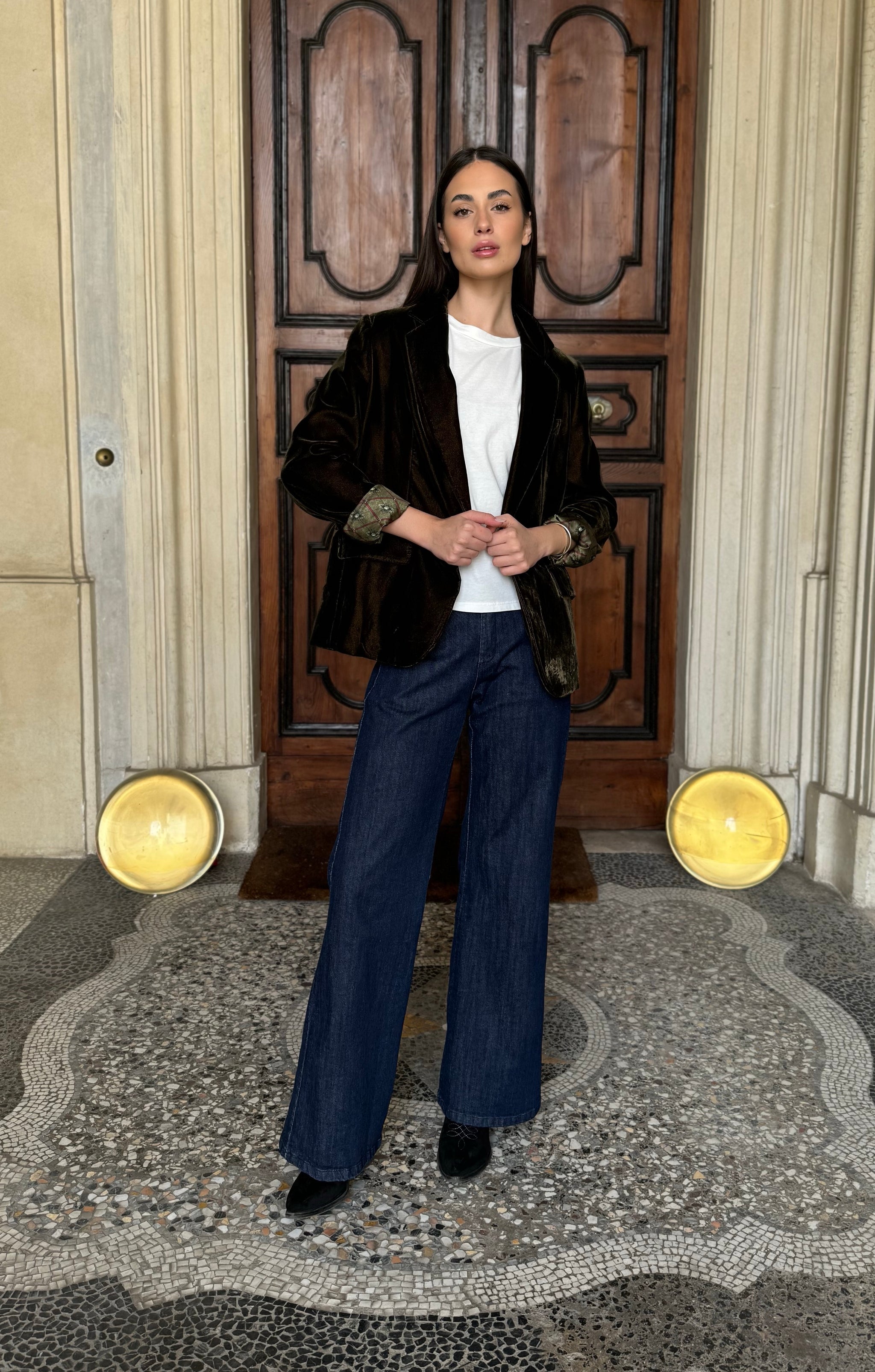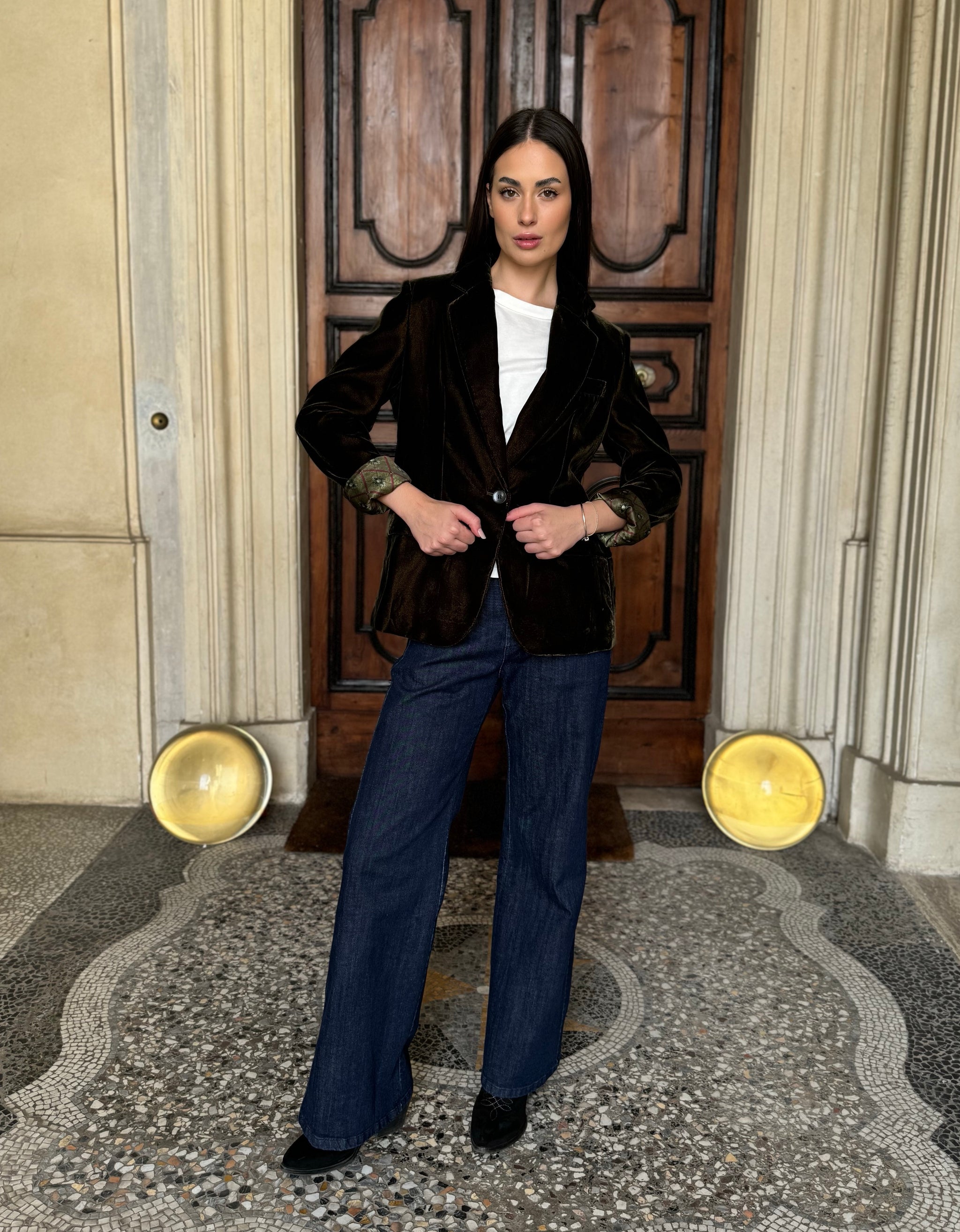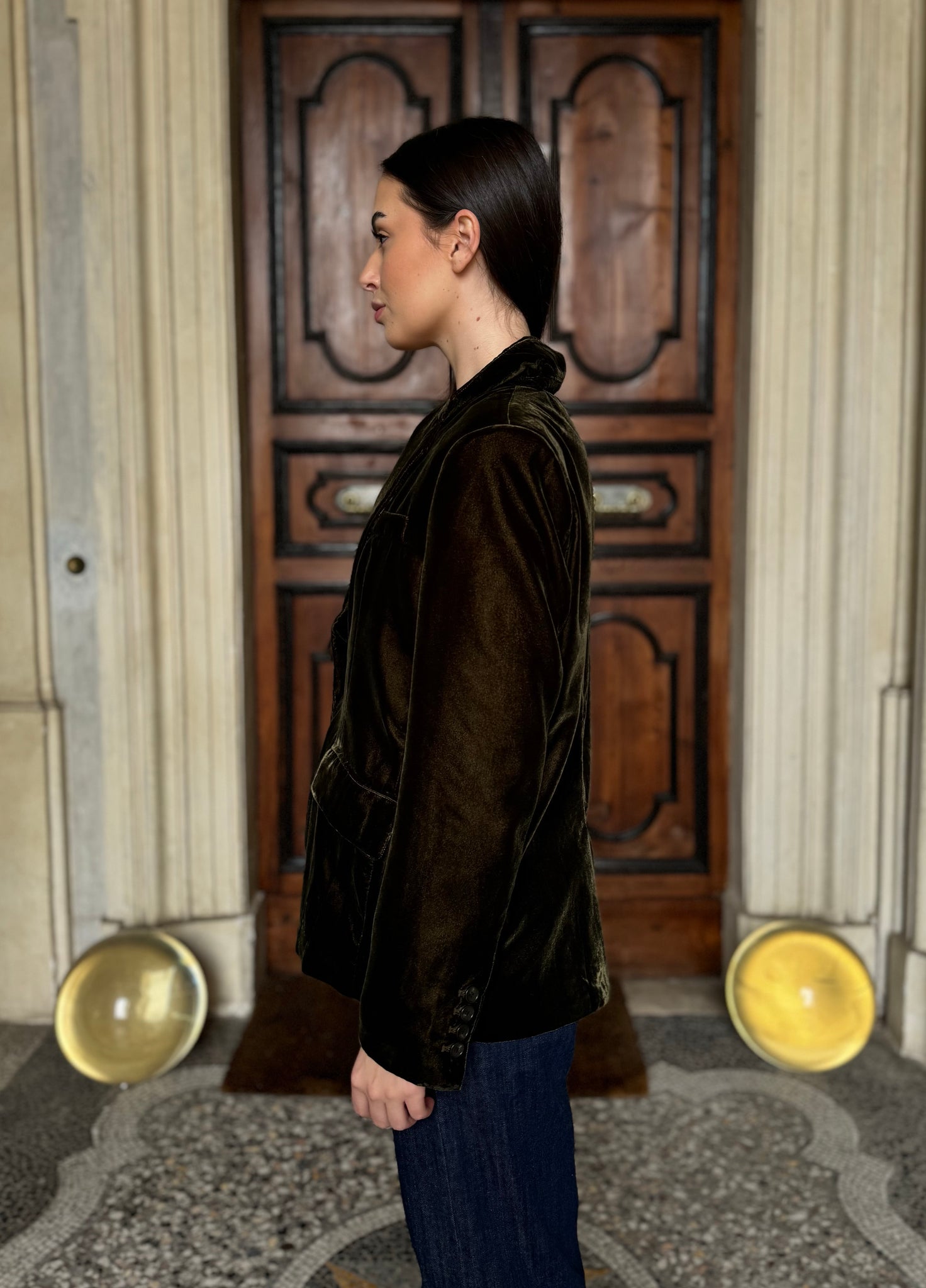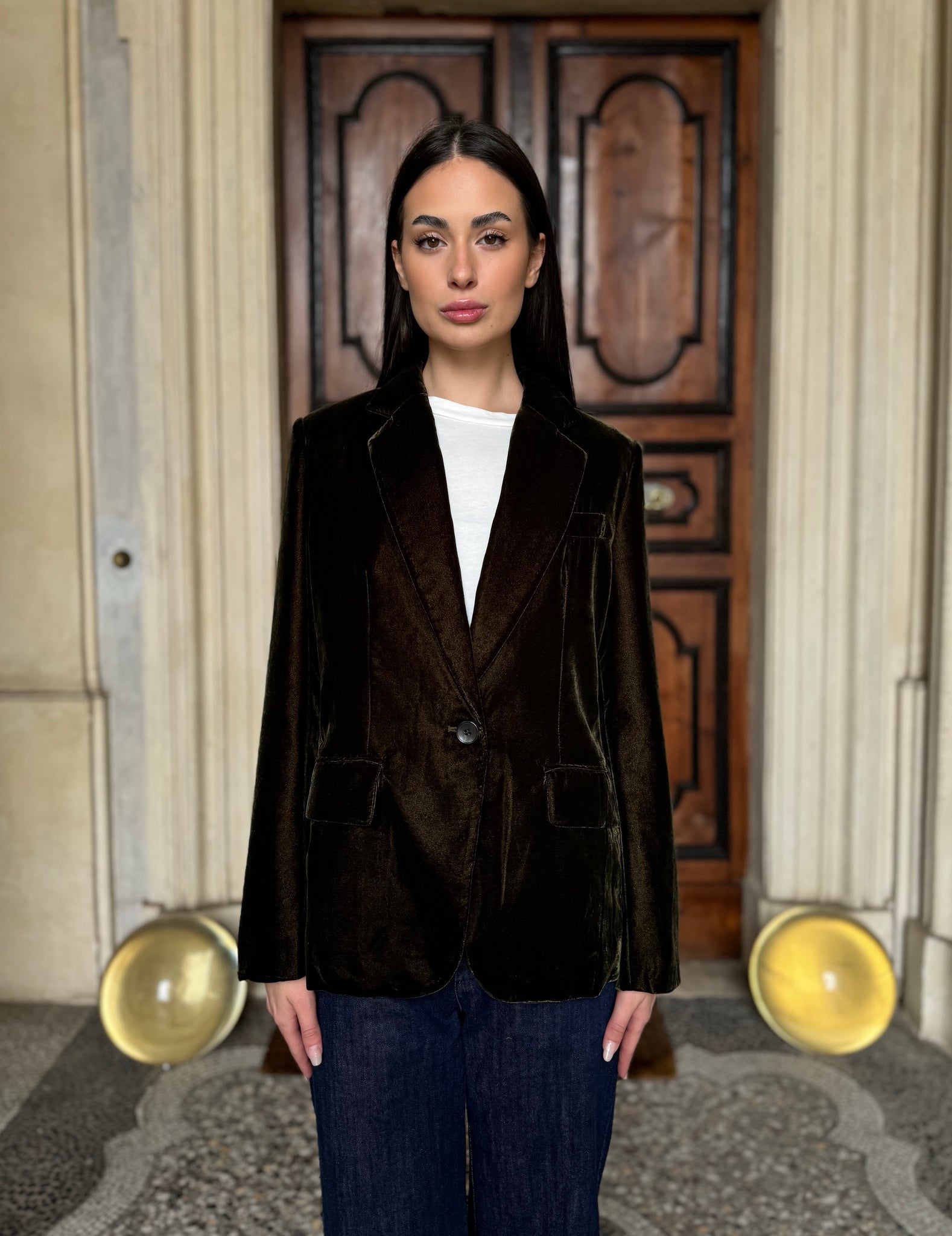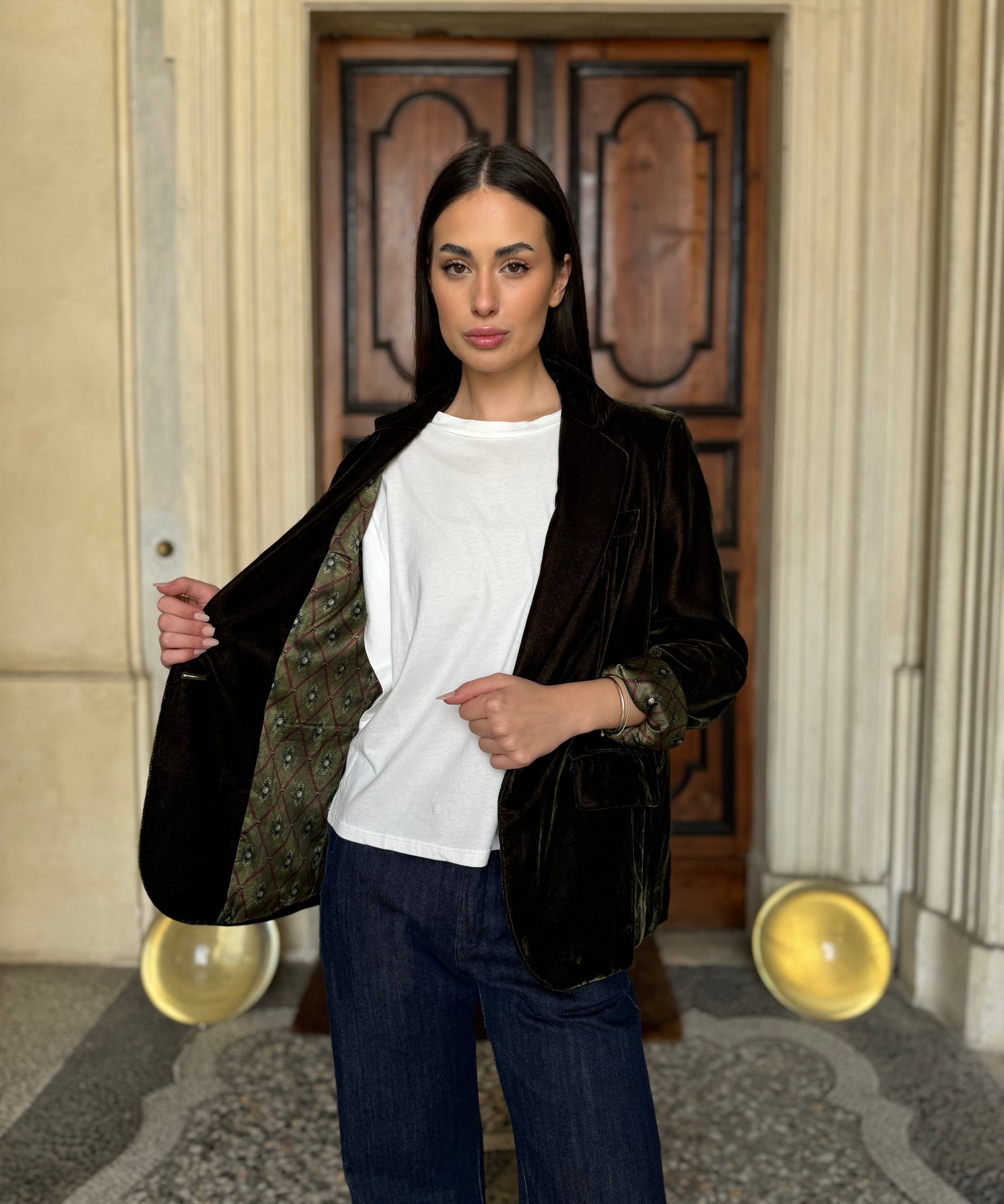 Giacca in velluto made in Italy dalla linea classica e dall’eleganza intramontabile. Il tessuto morbido e luminoso mette in risalto la profondità del verde scuro, mentre il risvolto interno fantasia aggiunge un tocco raffinato e inatteso. Il modello monopetto con revers e tasche applicate combina stile sartoriale e comfort quotidiano, rendendolo un capo versatile, perfetto da indossare sia con look formali che casual.