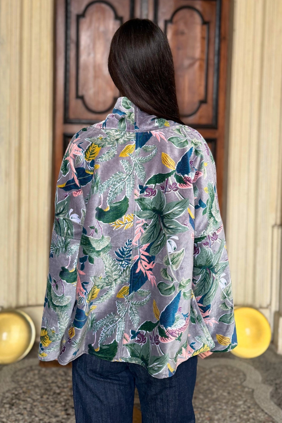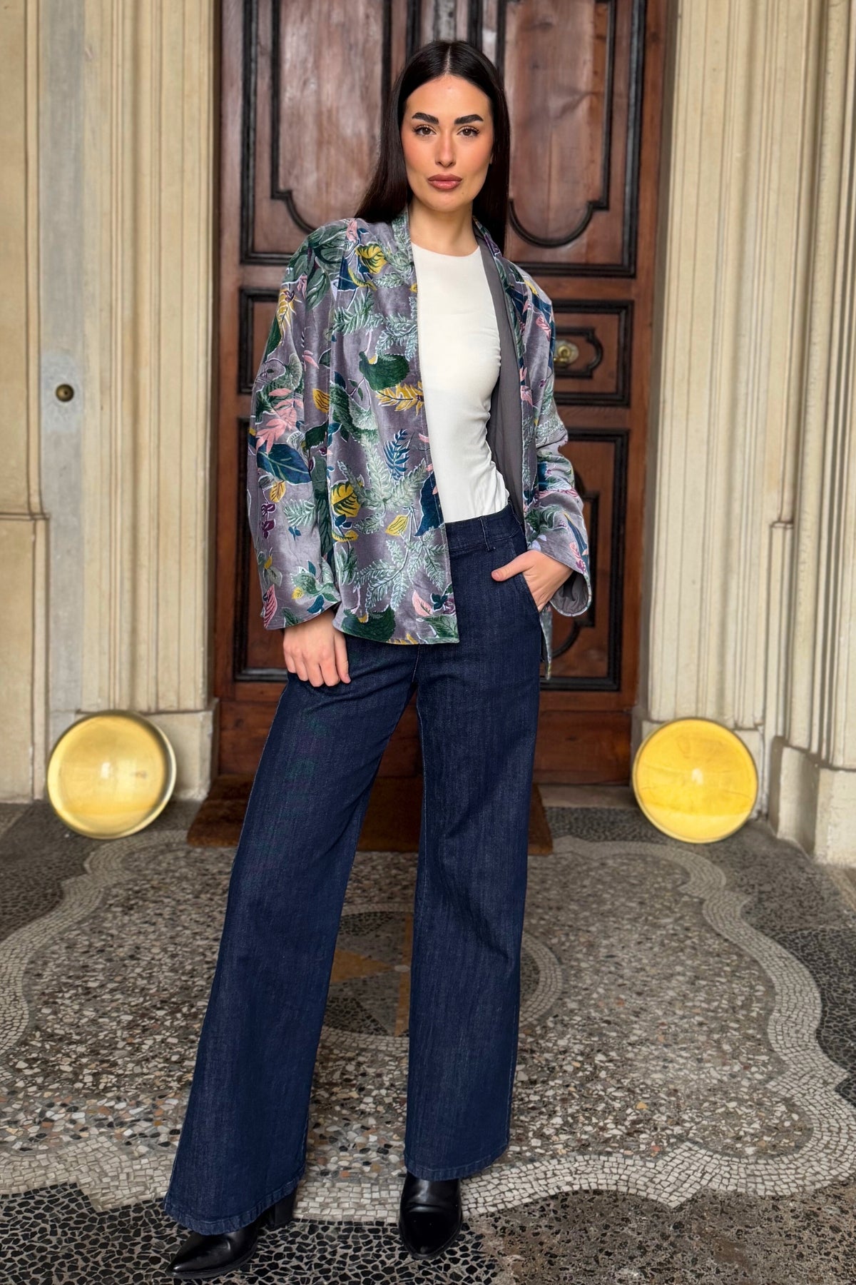 La giacca Uma rappresenta uno dei modelli distintivi della maison: un capo pensato per mantenere eleganza e presenza in ogni stagione. Il taglio a trapezio definisce la silhouette con equilibrio e struttura, mentre il velluto di cotone stampato a mano rende ogni pezzo irripetibile per profondità e resa cromatica.