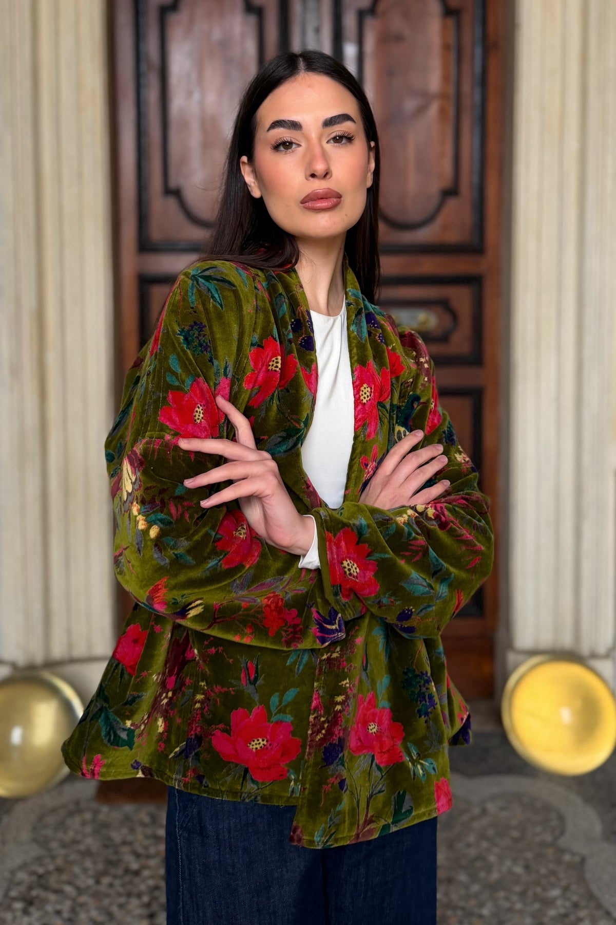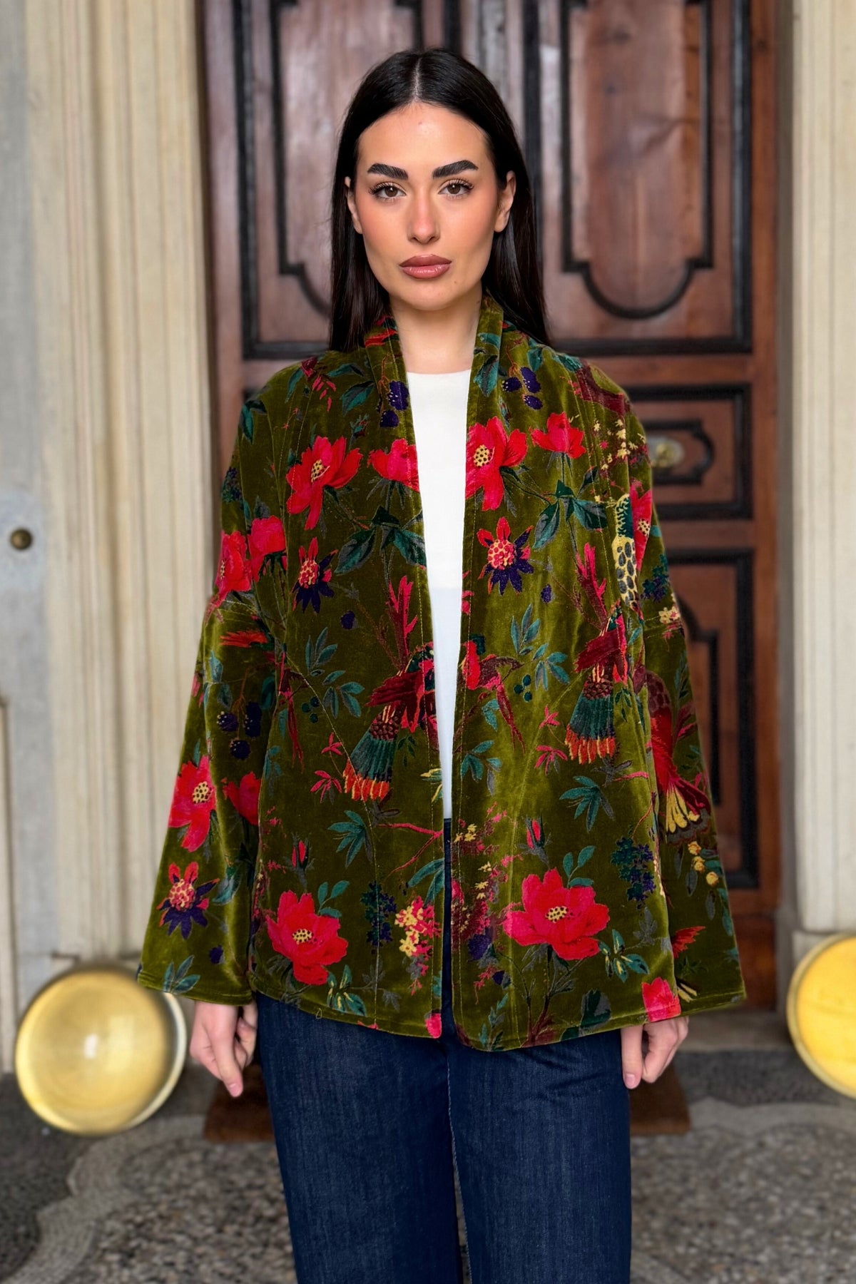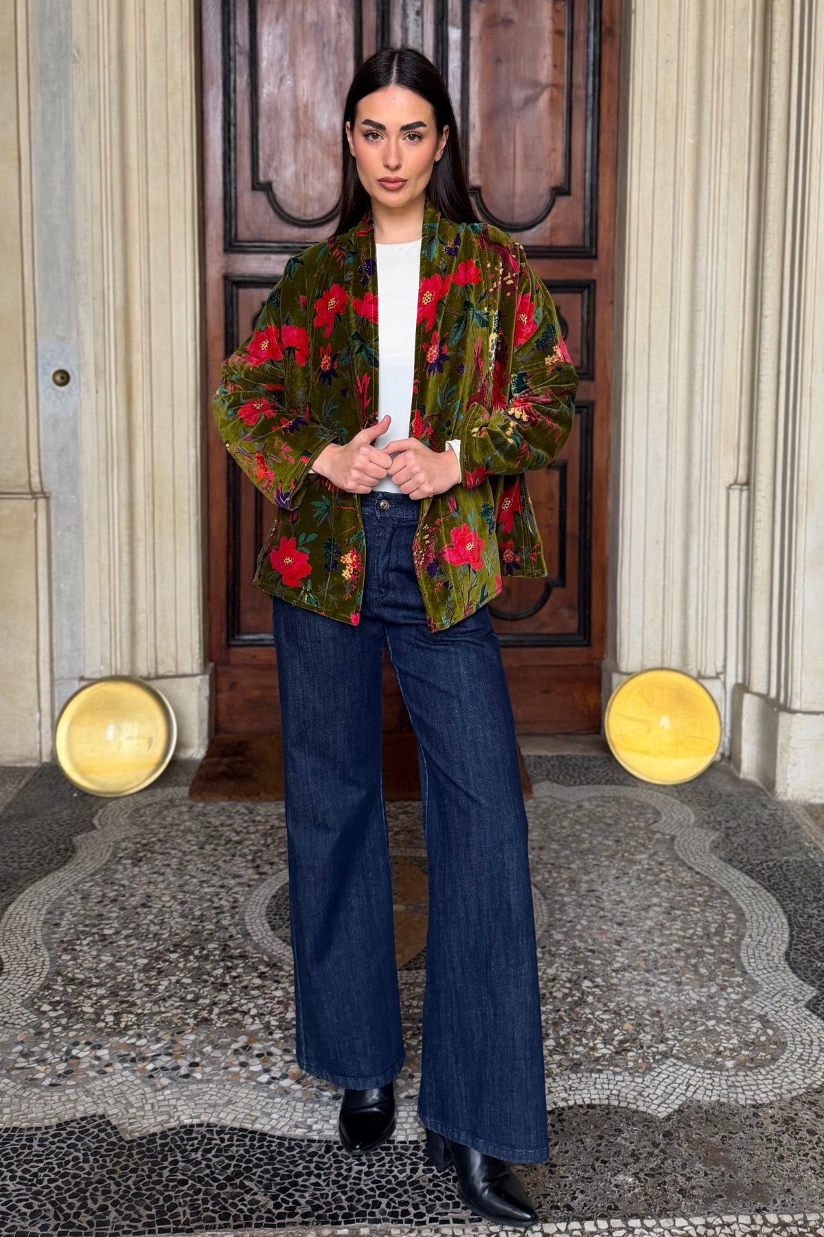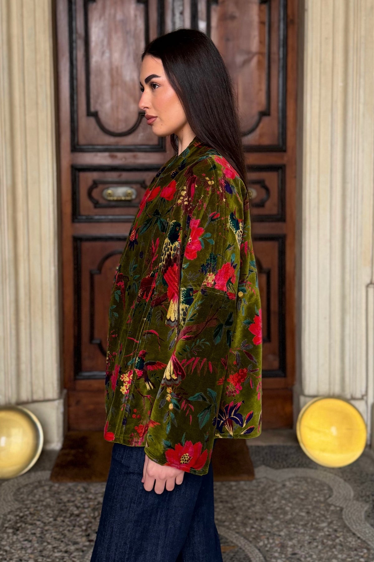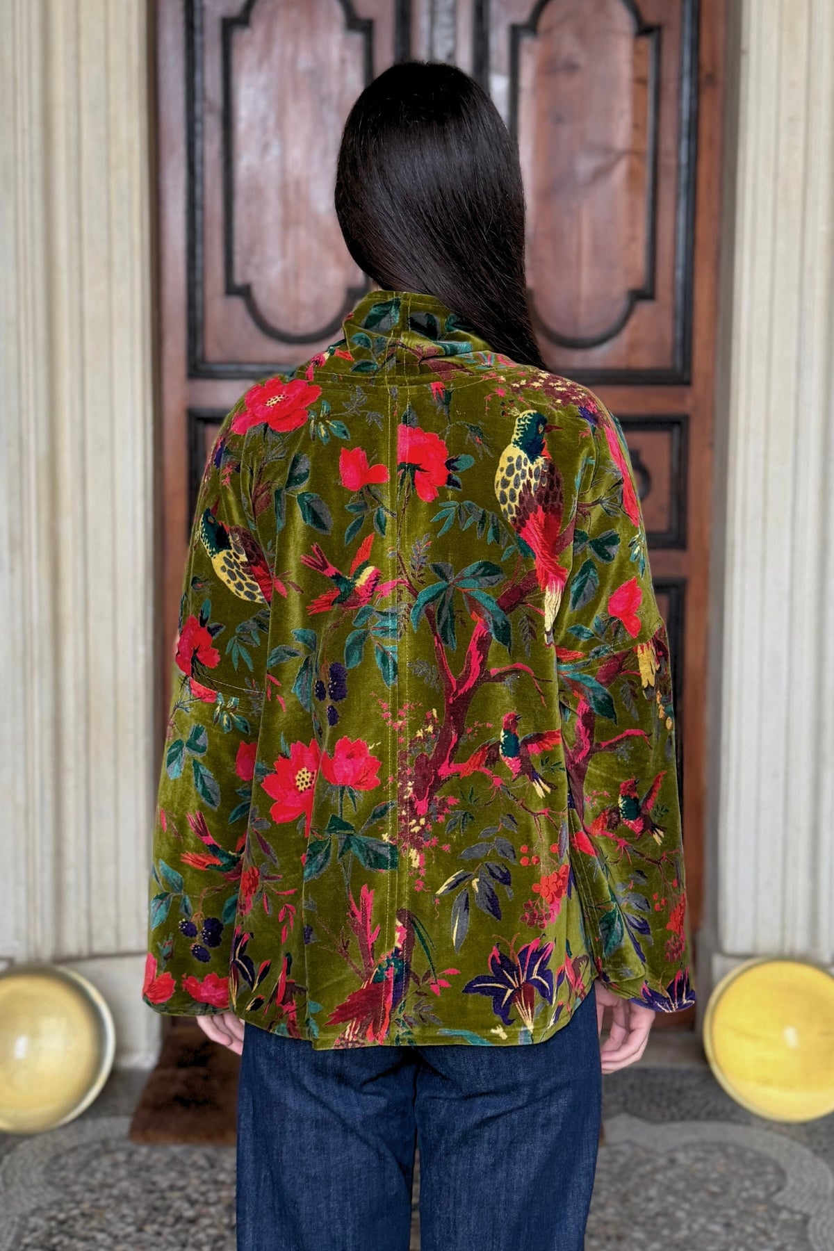 La giacca Uma è uno dei modelli simbolo della maison, pensata per attraversare le stagioni mantenendo un’eleganza costante. Il taglio a trapezio scolpisce la silhouette con equilibrio, adattandosi con naturalezza a diverse fisicità, mentre il velluto di cotone stampato a mano conferisce a ogni capo profondità e unicità.