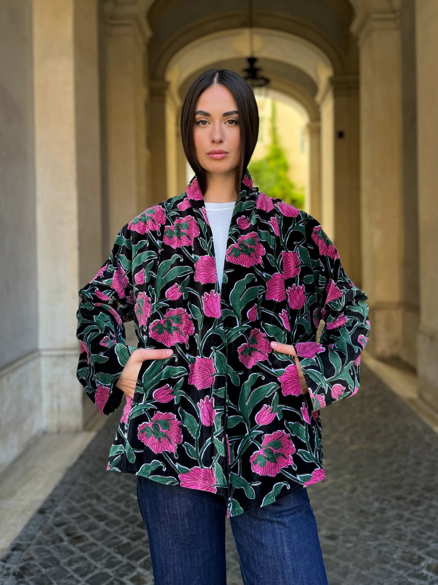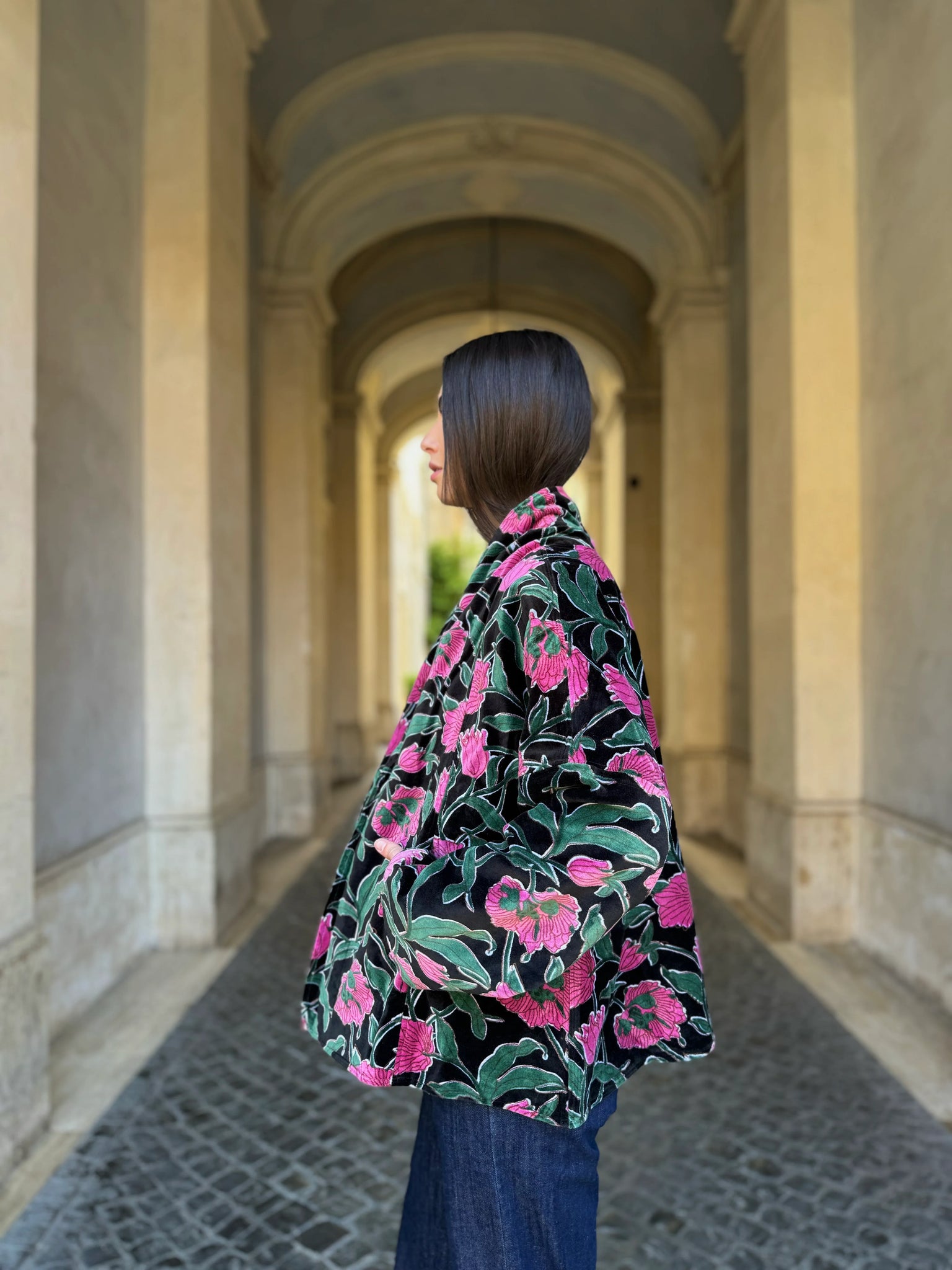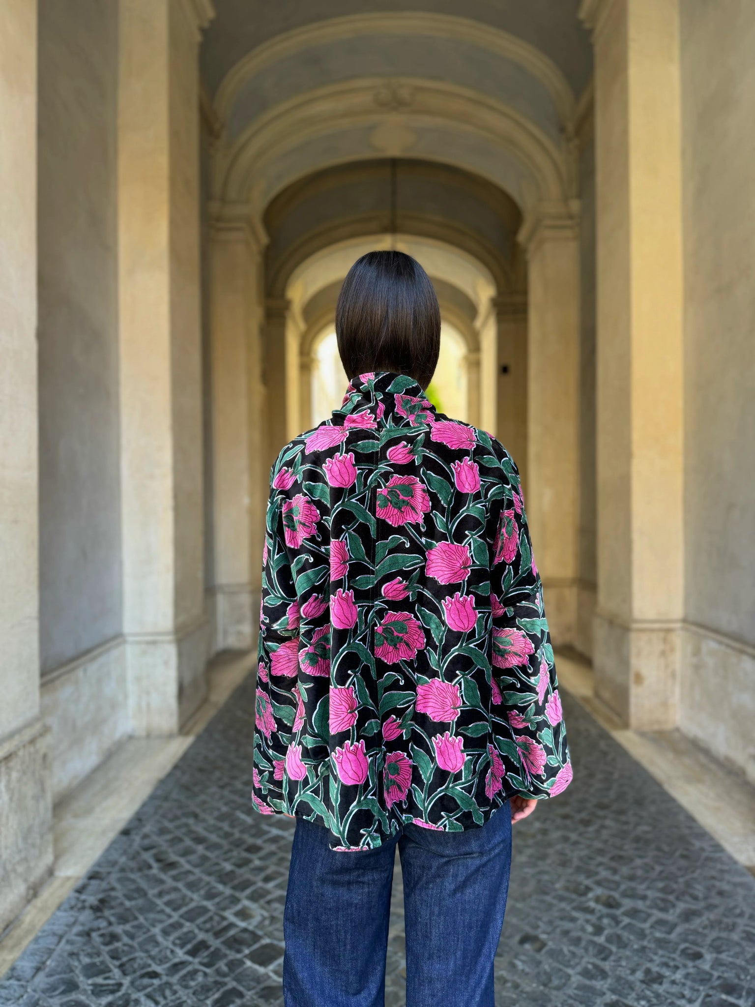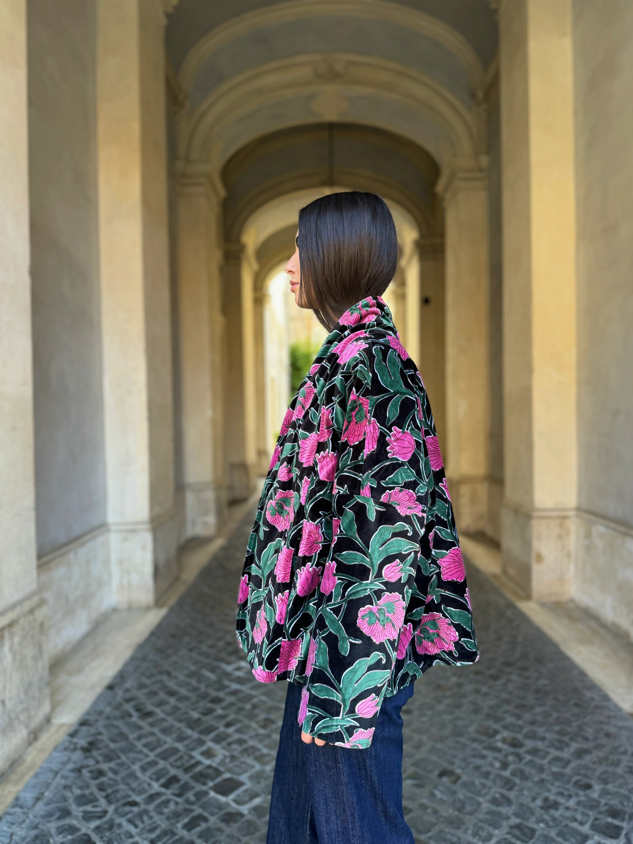 La giacca Uma Rialto Nero di Artefilia Milano unisce il taglio a trapezio, studiato per donare struttura e armonia alla silhouette, con la morbidezza del velluto di cotone stampato a mano, che rende ogni capo un pezzo unico. L’ispirazione arriva da Venezia: il fondo scuro e avvolgente richiama la solidità del ponte di Rialto, mentre i dettagli fucsia accendono la superficie come lampi di luce, creando un contrasto vibrante che esprime energia ed eleganza senza tempo.
