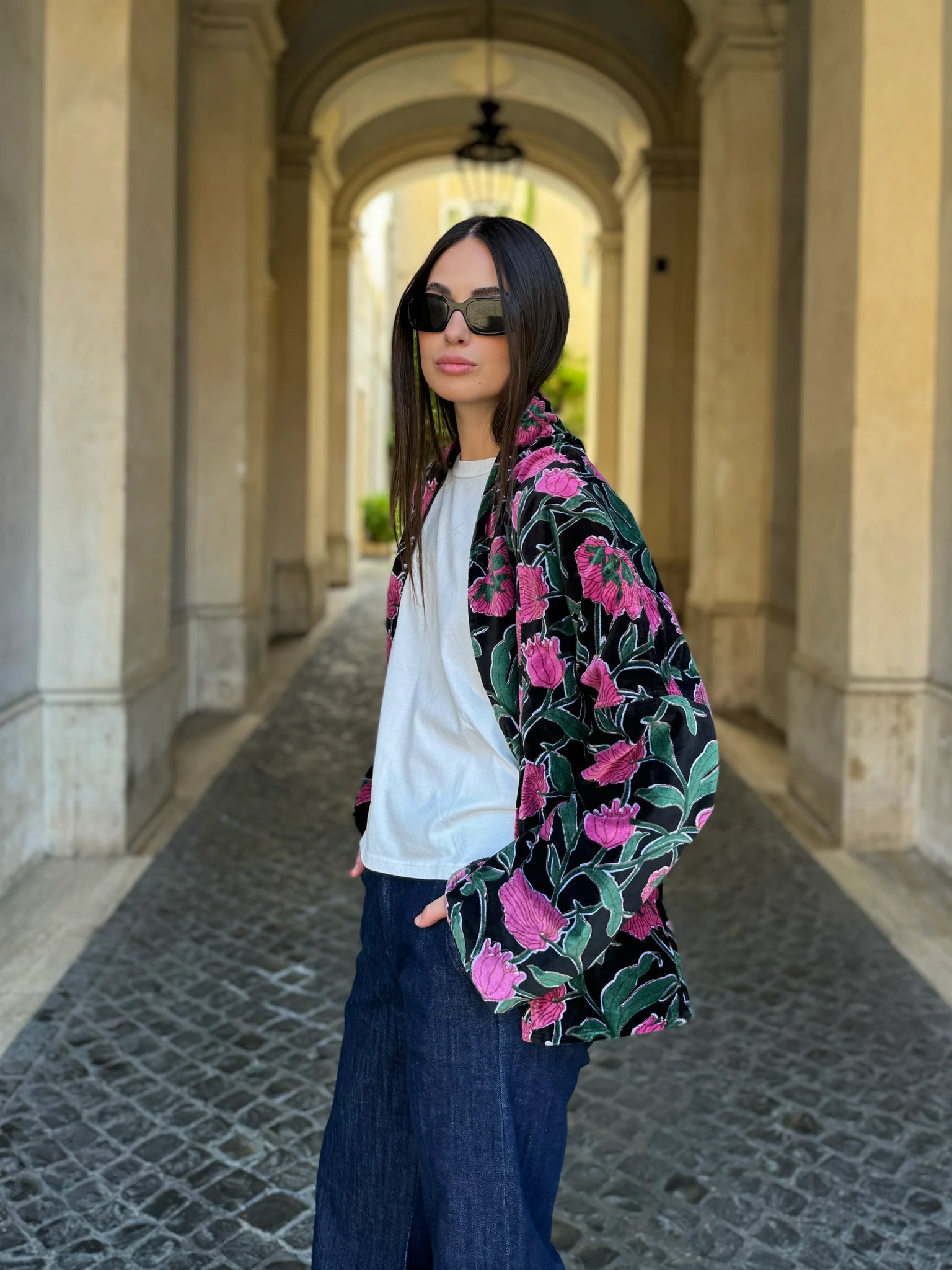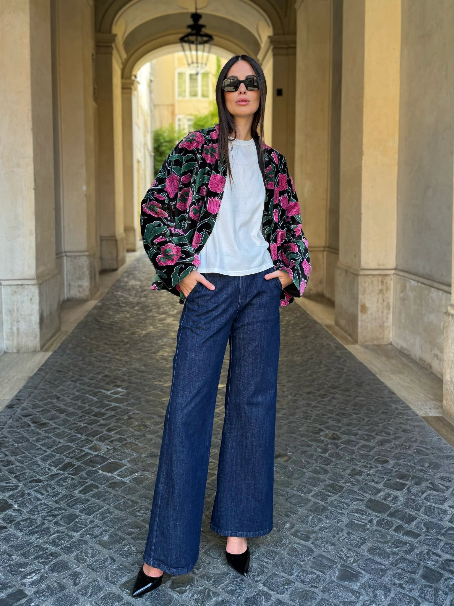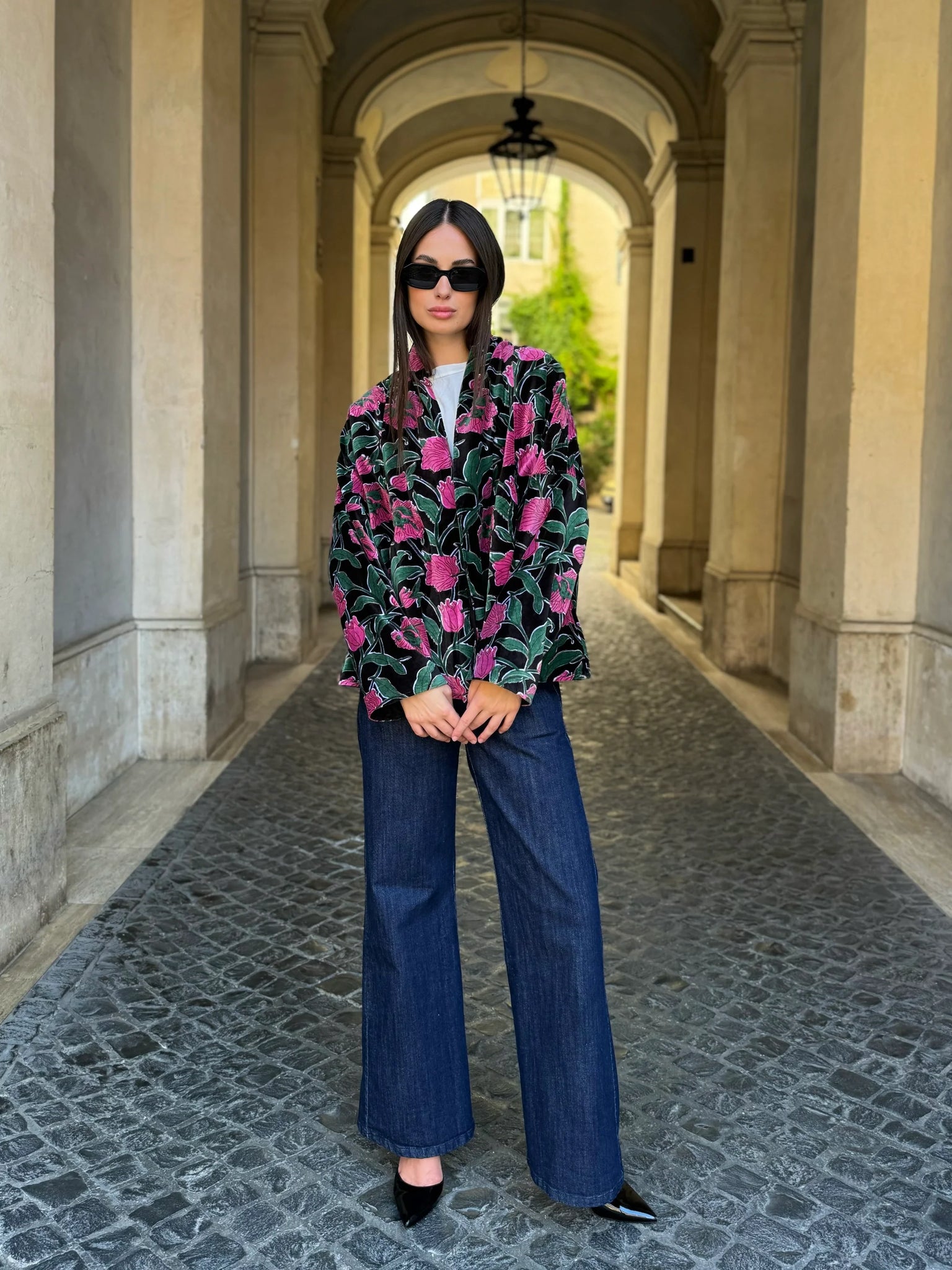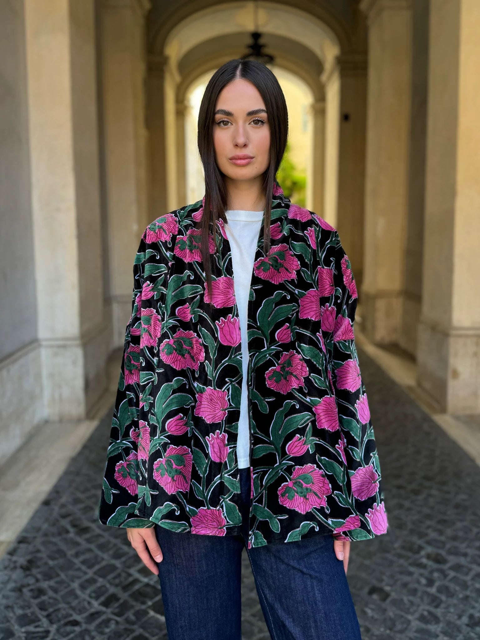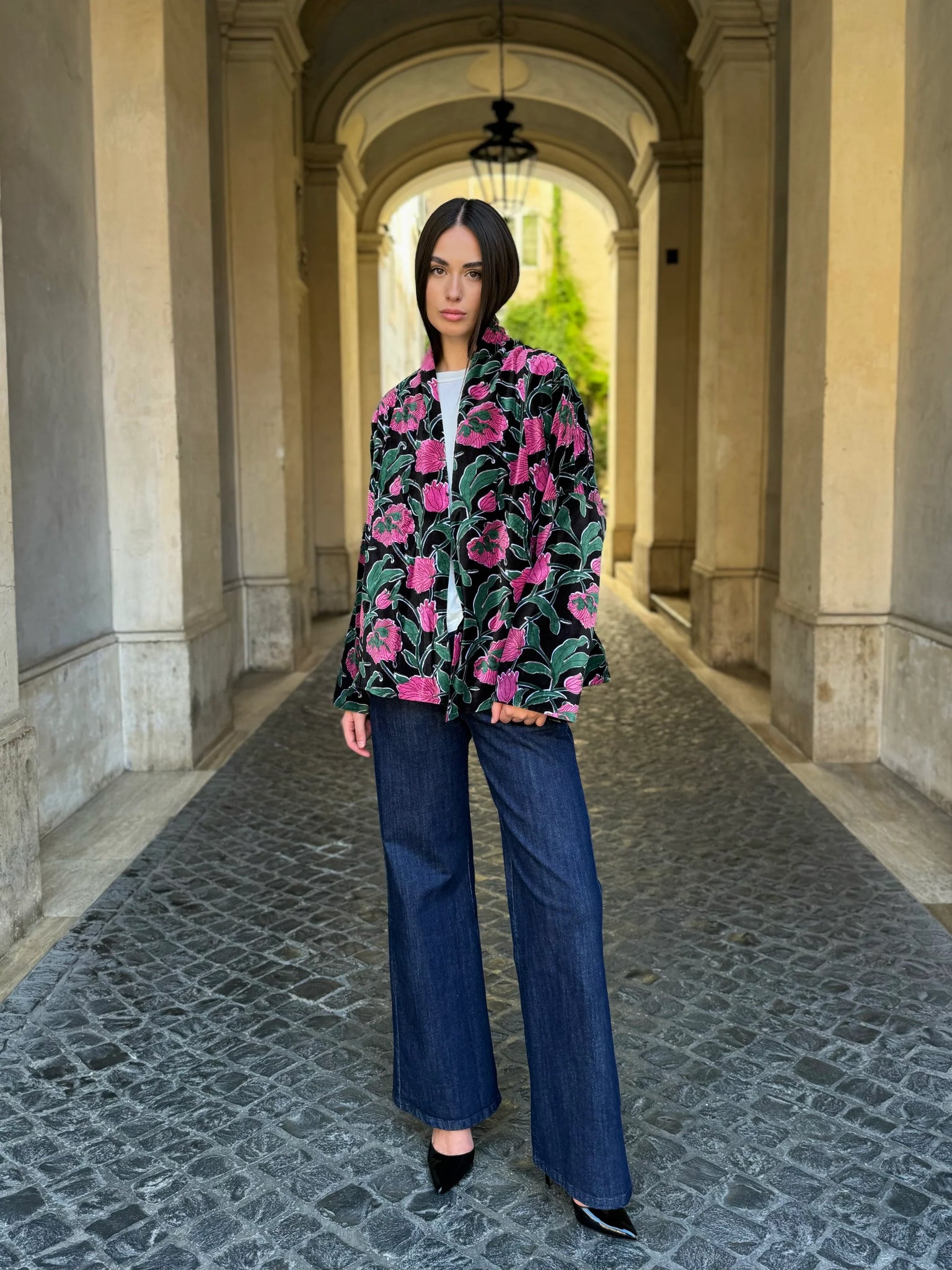 La giacca Uma Rialto Nero di Artefilia Milano unisce il taglio a trapezio, studiato per donare struttura e armonia alla silhouette, con la morbidezza del velluto di cotone stampato a mano, che rende ogni capo un pezzo unico. L’ispirazione arriva da Venezia: il fondo scuro e avvolgente richiama la solidità del ponte di Rialto, mentre i dettagli fucsia accendono la superficie come lampi di luce, creando un contrasto vibrante che esprime energia ed eleganza senza tempo.