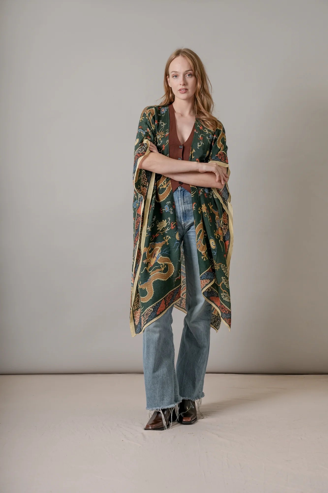 Un capo avvolgente e ricco di fascino, realizzato in pura lana con stampa ispirata al drago cinese, simbolo di forza, fortuna e prosperità.