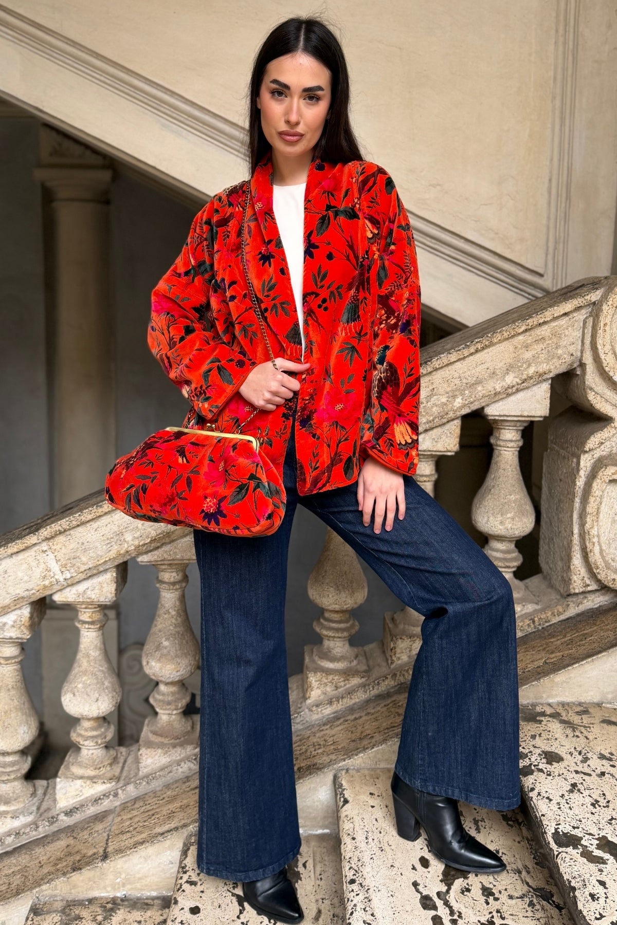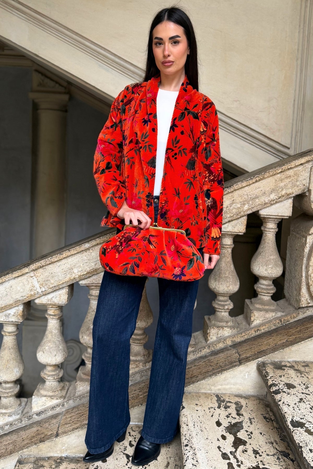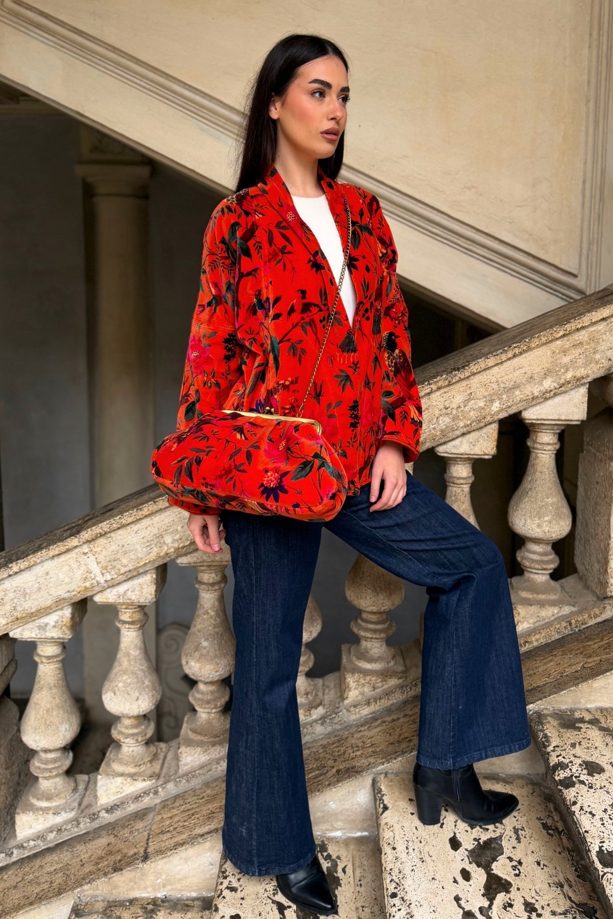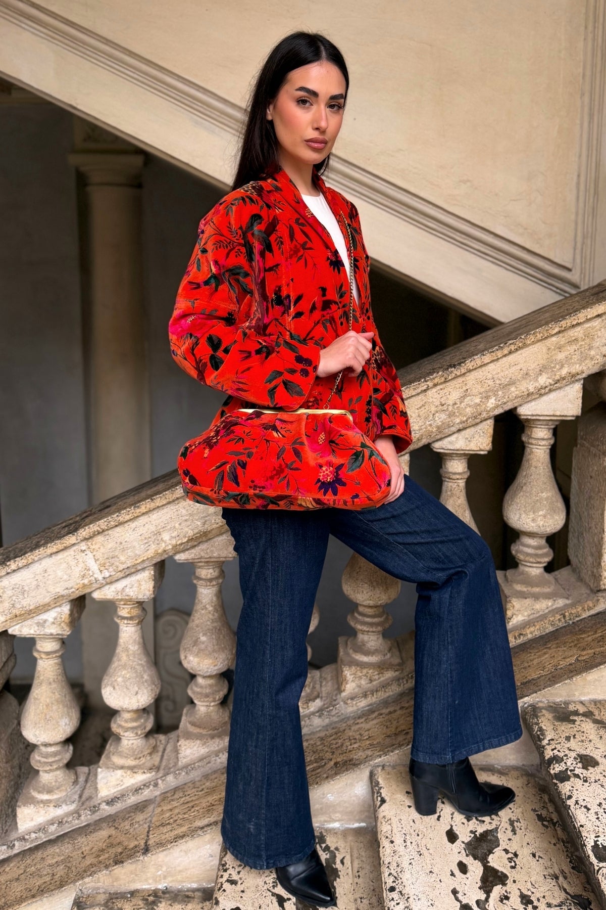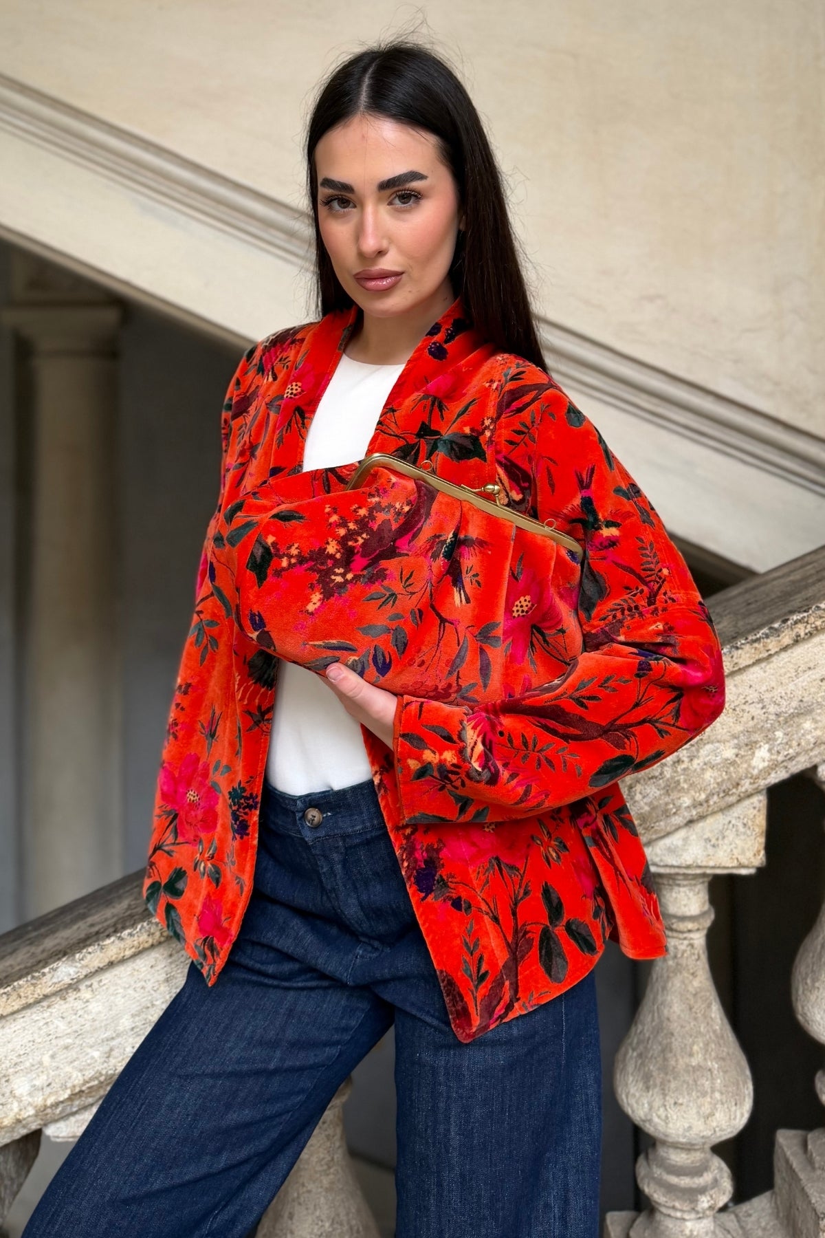 La borsa Stella, realizzata in velluto di cotone stampato a mano, interpreta il formato compatto con un’eleganza luminosa e contemporanea. La variante Ravello Arancio si distingue per il suo fondo caldo e intenso, animato da micro-dettagli ispirati ai giardini mediterranei: pennellate di colore, petali e accenti grafici che donano ritmo e vivacità al design.