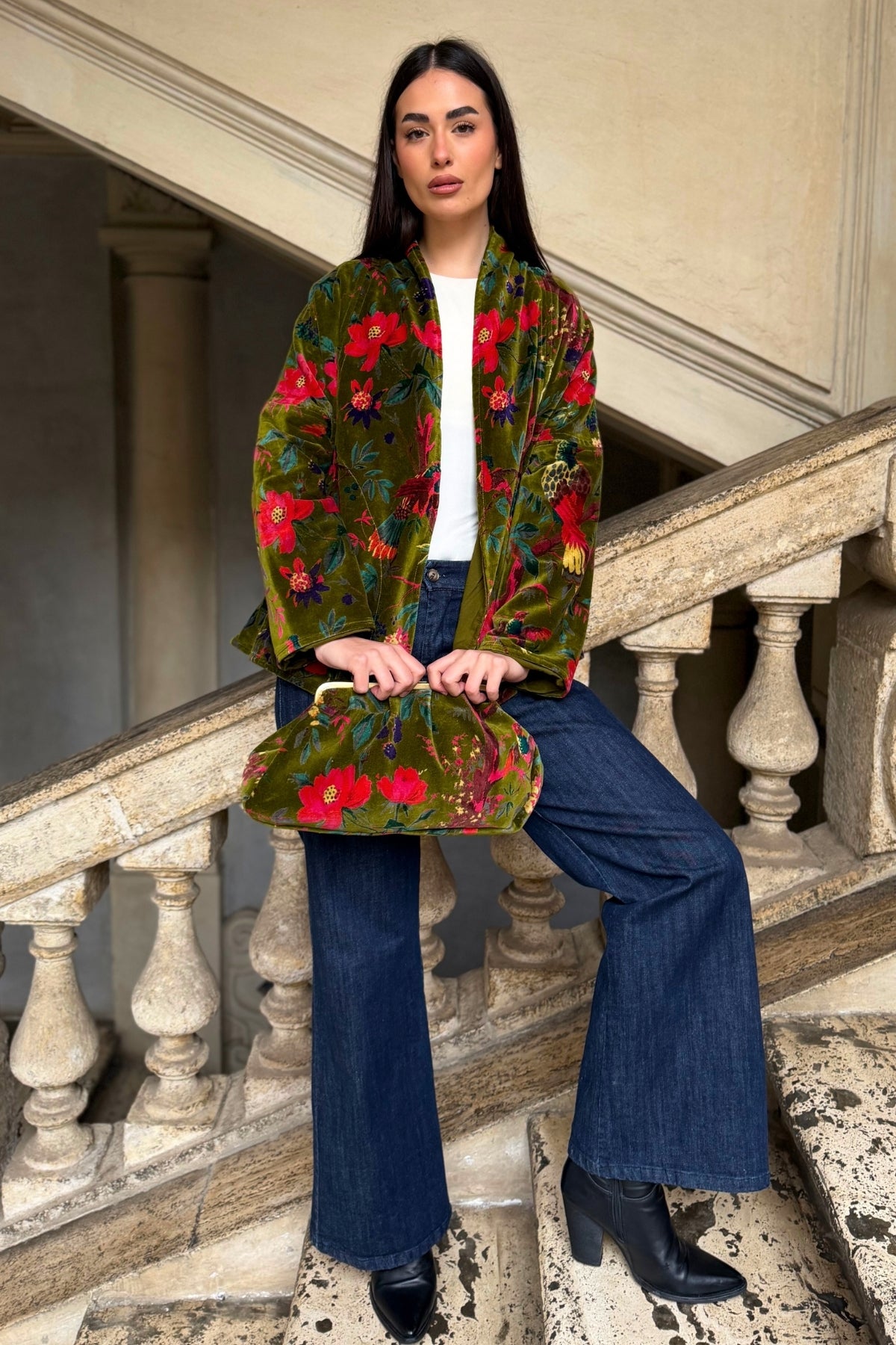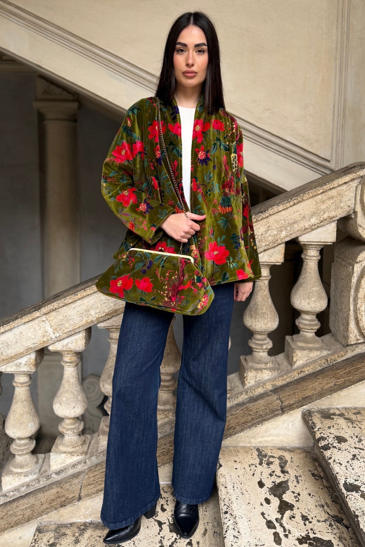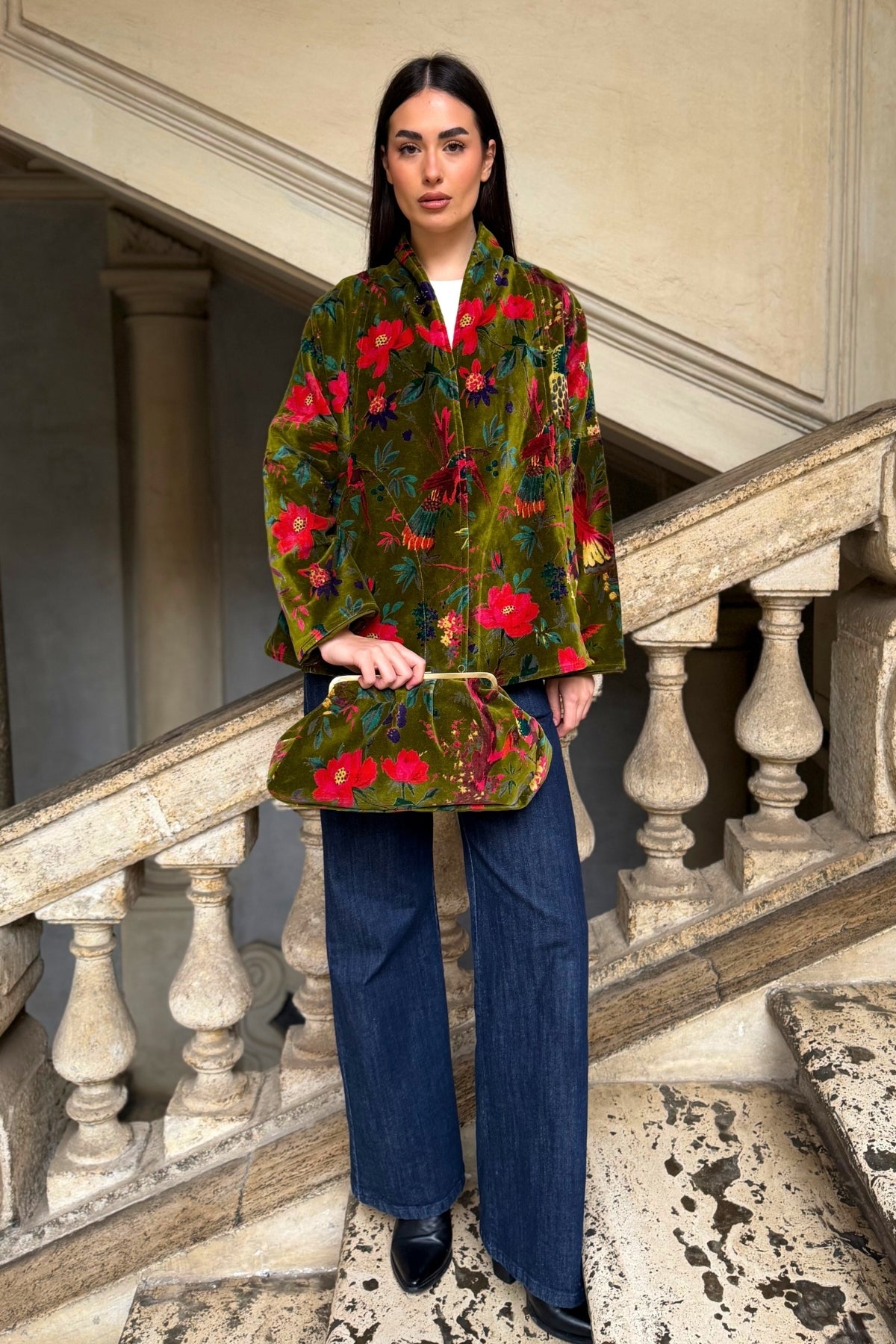 La borsa Stella, in velluto di cotone stampato a mano, reinterpreta il formato compatto con una presenza elegante e discreta. La variante Ravello Verde si ispira ai giardini della Costiera Amalfitana: un verde profondo e vellutato, attraversato da dettagli vividi che richiamano fogliami, petali e forme organiche. Un disegno armonioso, ricco ma mai eccessivo, che dà vita a una palette sofisticata e senza tempo.