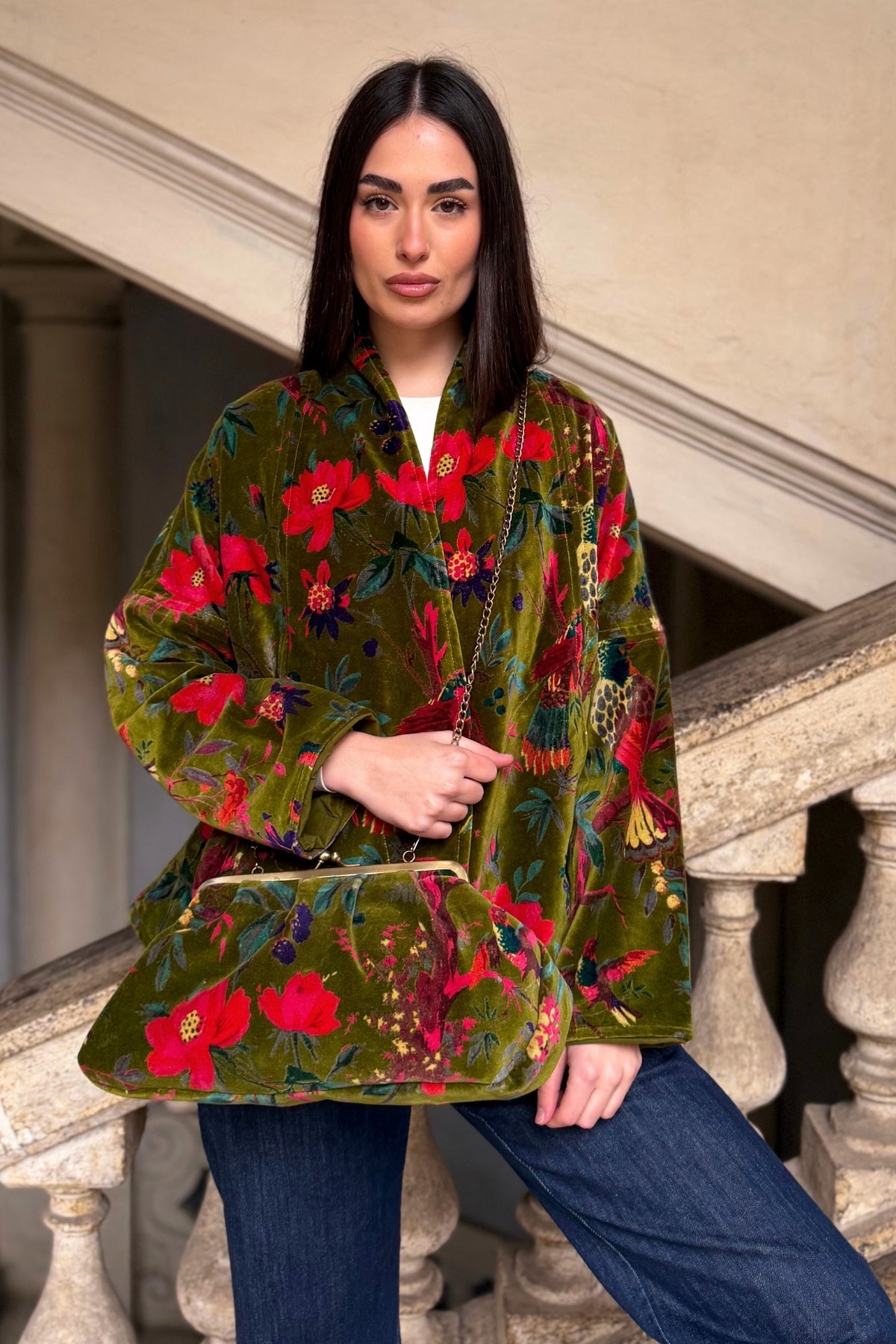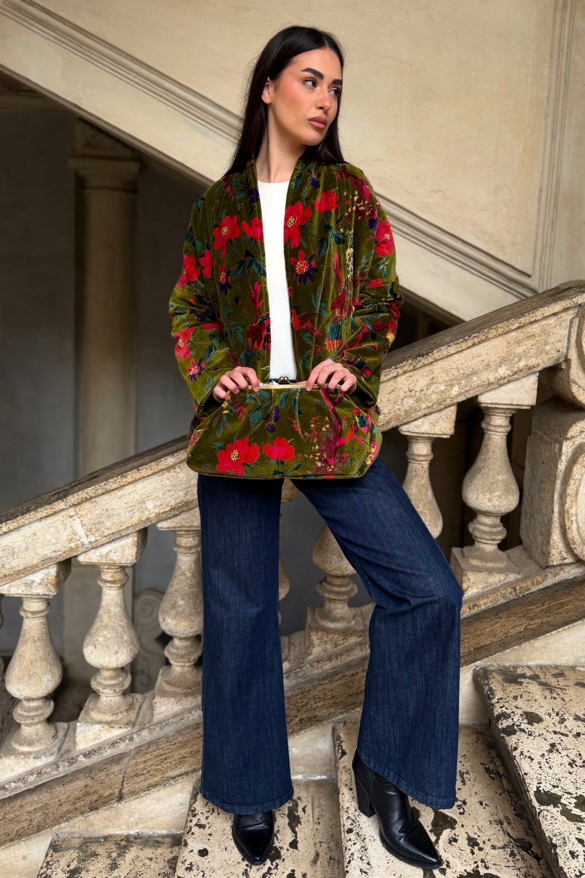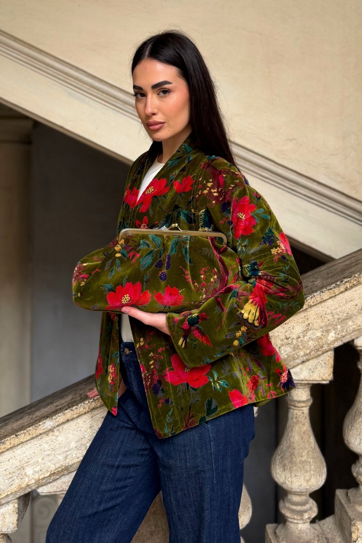 La borsa Stella, in velluto di cotone stampato a mano, reinterpreta il formato compatto con una presenza elegante e discreta. La variante Ravello Verde si ispira ai giardini della Costiera Amalfitana: un verde profondo e vellutato, attraversato da dettagli vividi che richiamano fogliami, petali e forme organiche. Un disegno armonioso, ricco ma mai eccessivo, che dà vita a una palette sofisticata e senza tempo.