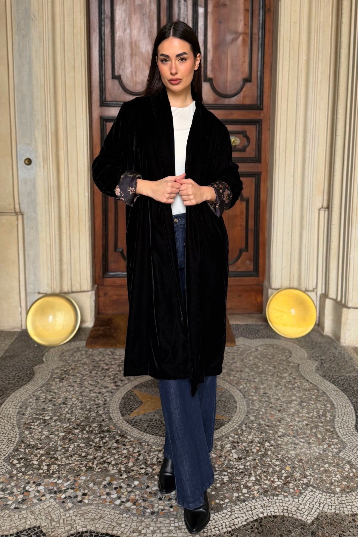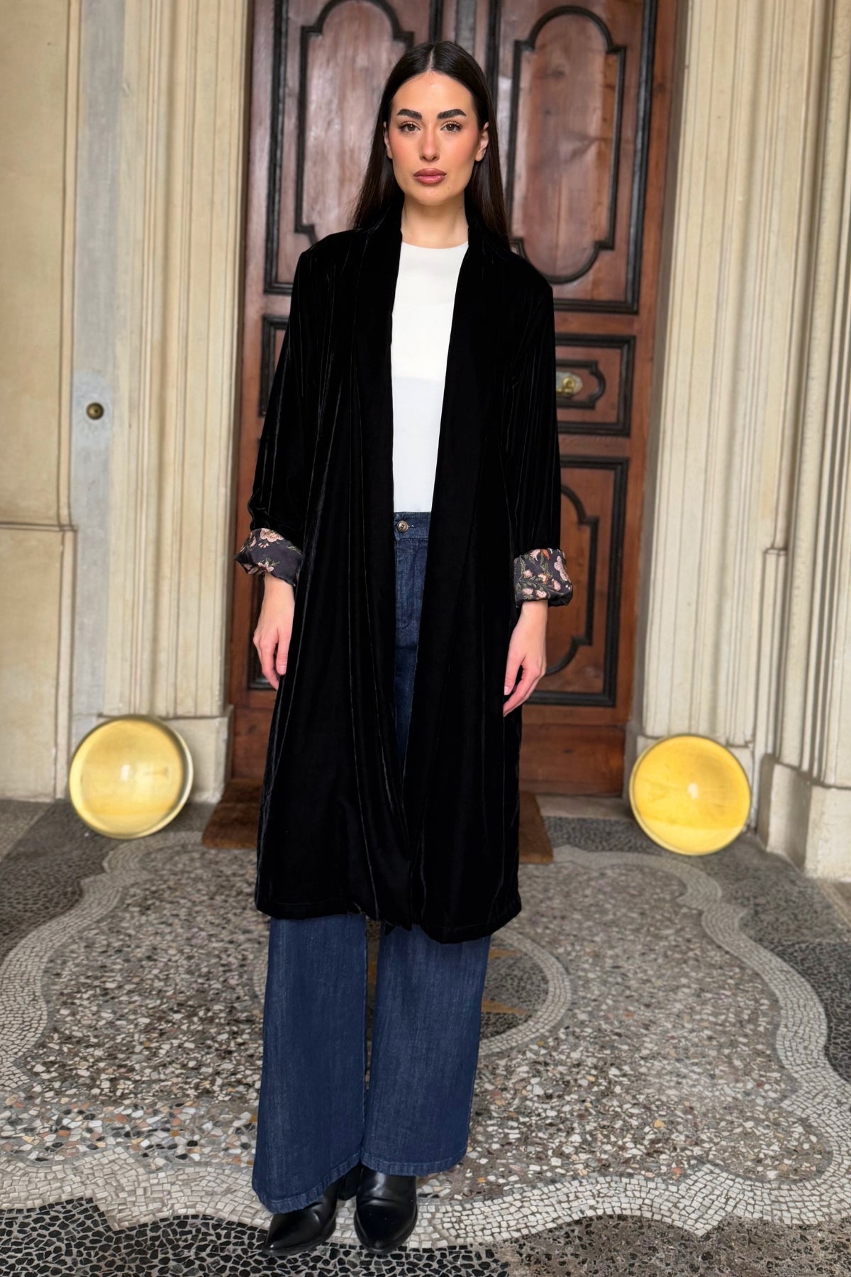 Un kimono lungo in velluto, morbido e fluido, pensato per aggiungere un tocco elegante a qualsiasi look.
