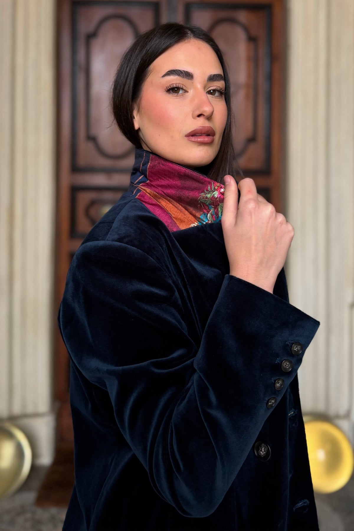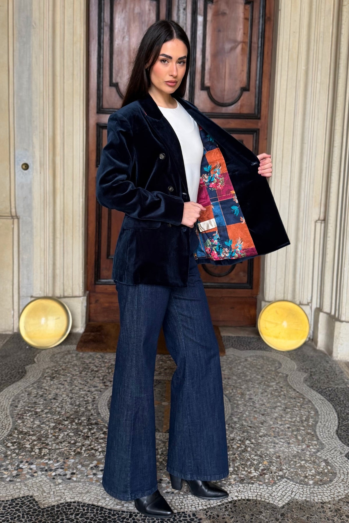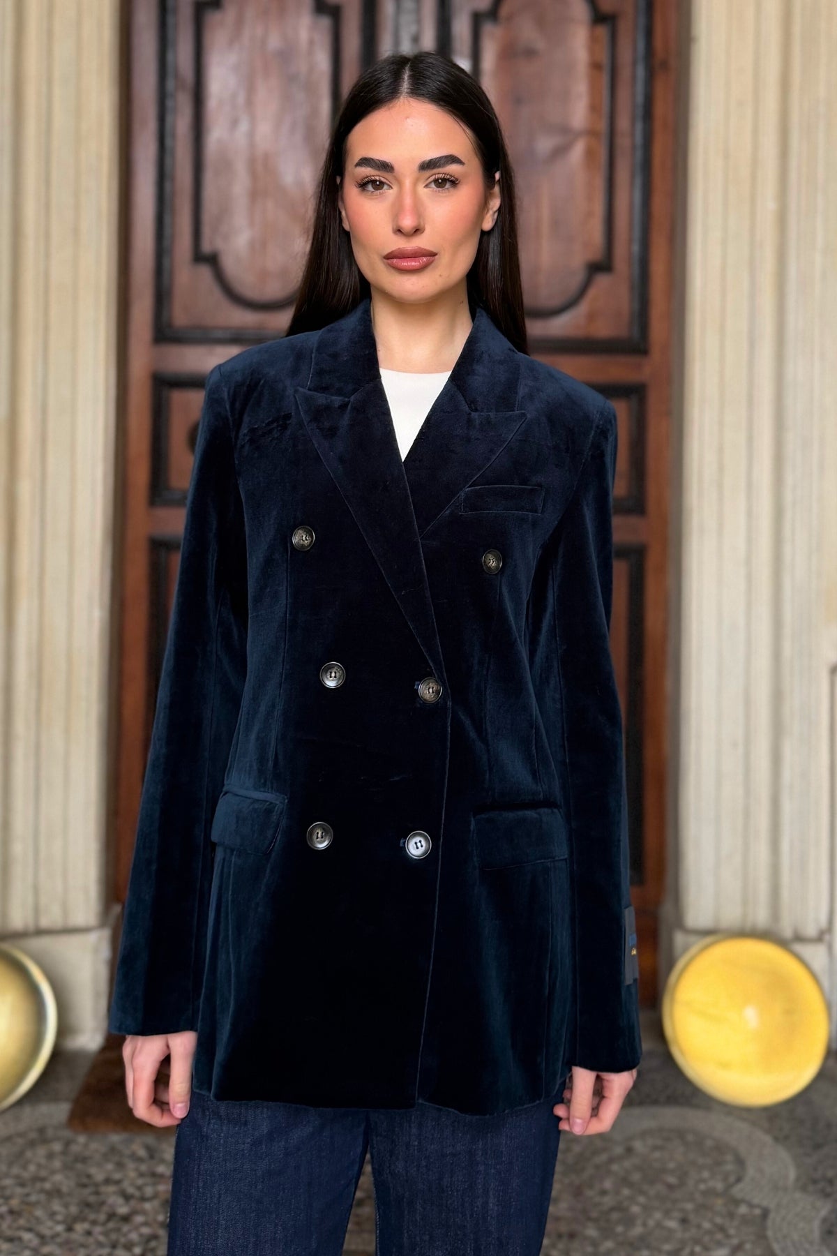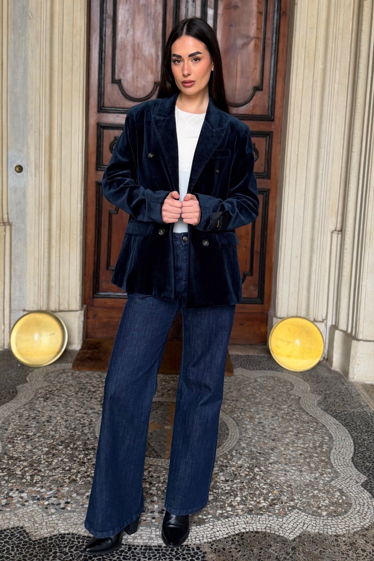 Una giacca doppiopetto dal carattere deciso, realizzata in velluto morbido e corposo, proposta in una profonda tonalità blue che valorizza la luminosità del tessuto.