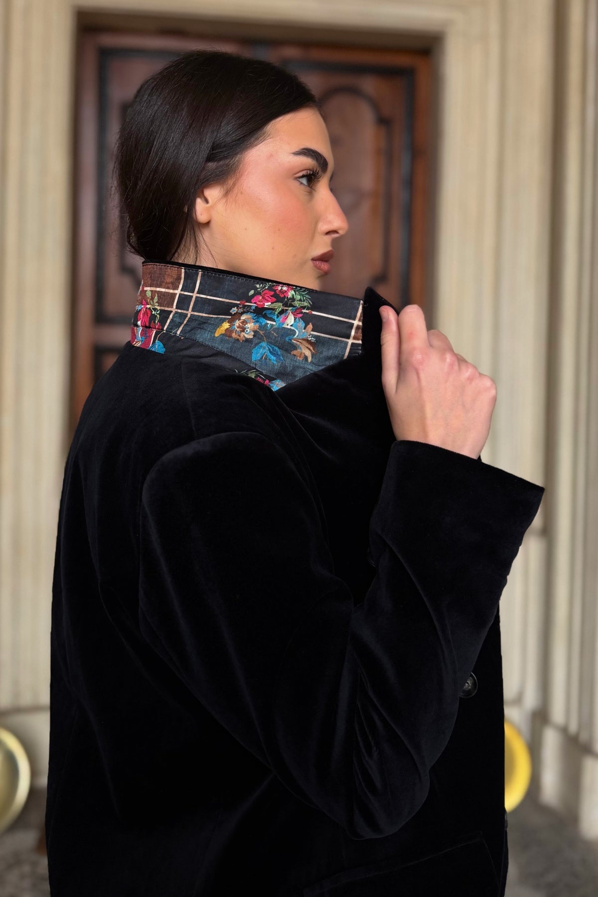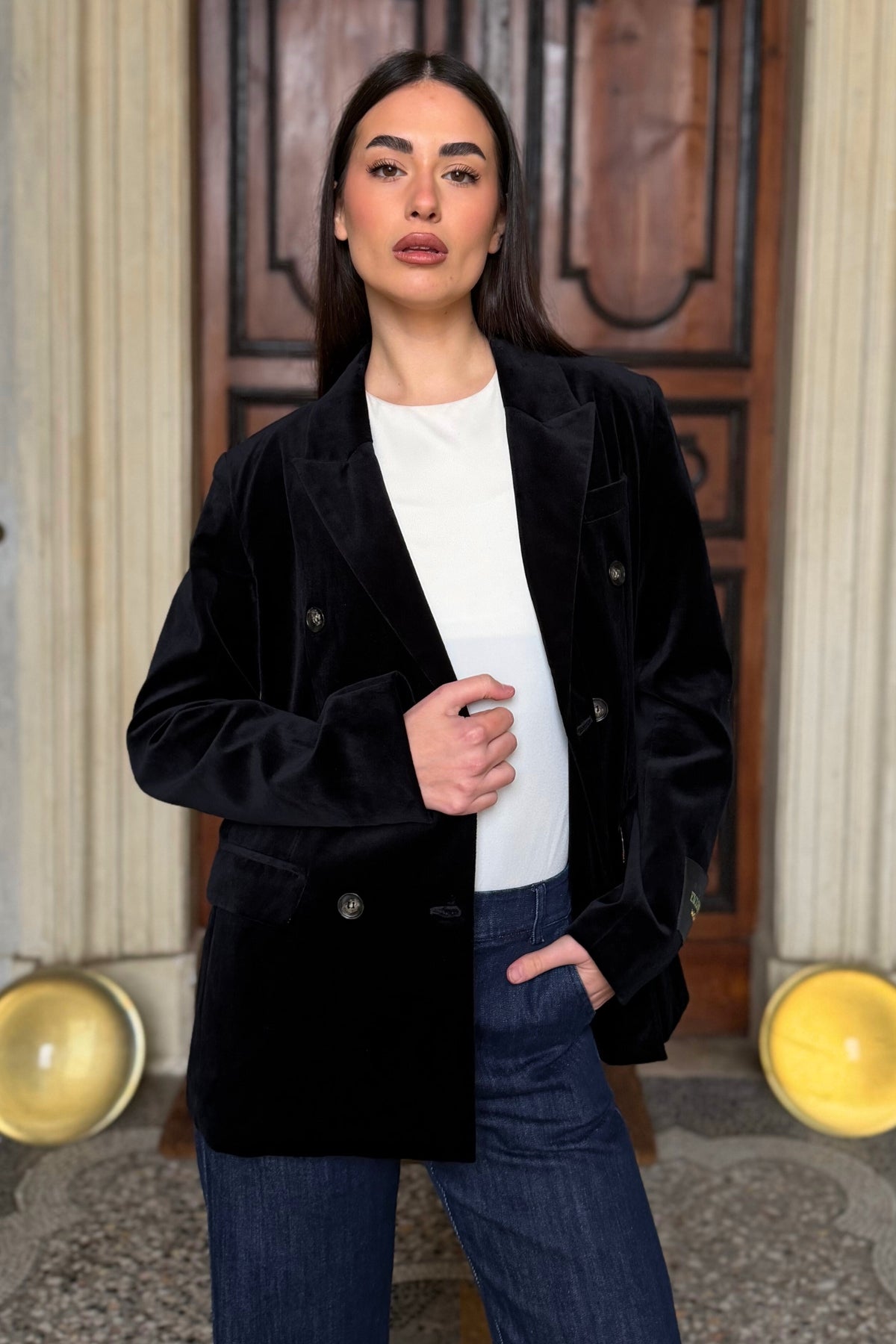 Una versione elegante e contemporanea del classico doppio petto, il colore nero intensifica la morbidezza del tessuto e dona alla giacca una presenza decisa, perfetta per costruire look sofisticati sia casual che più formali.