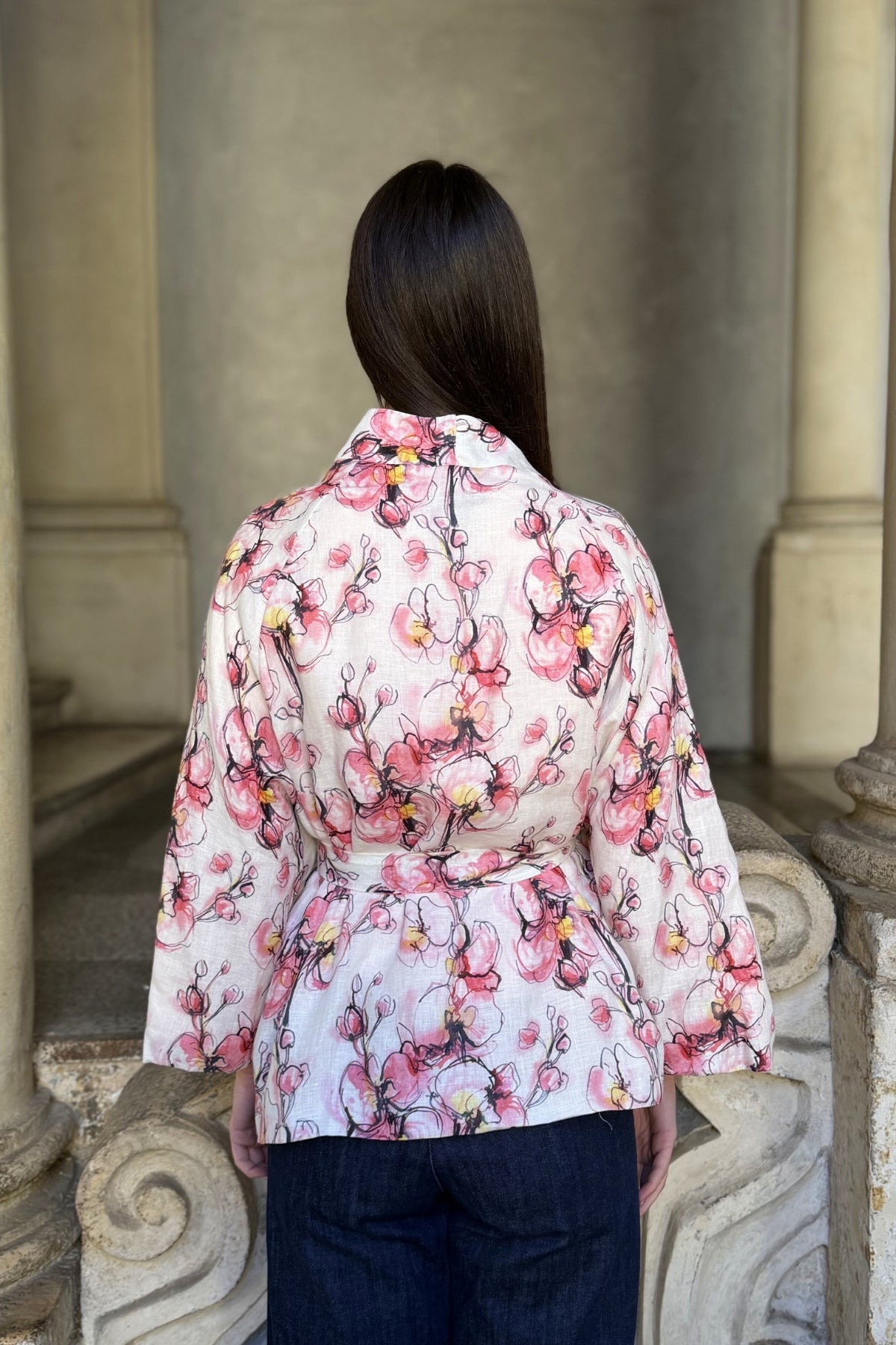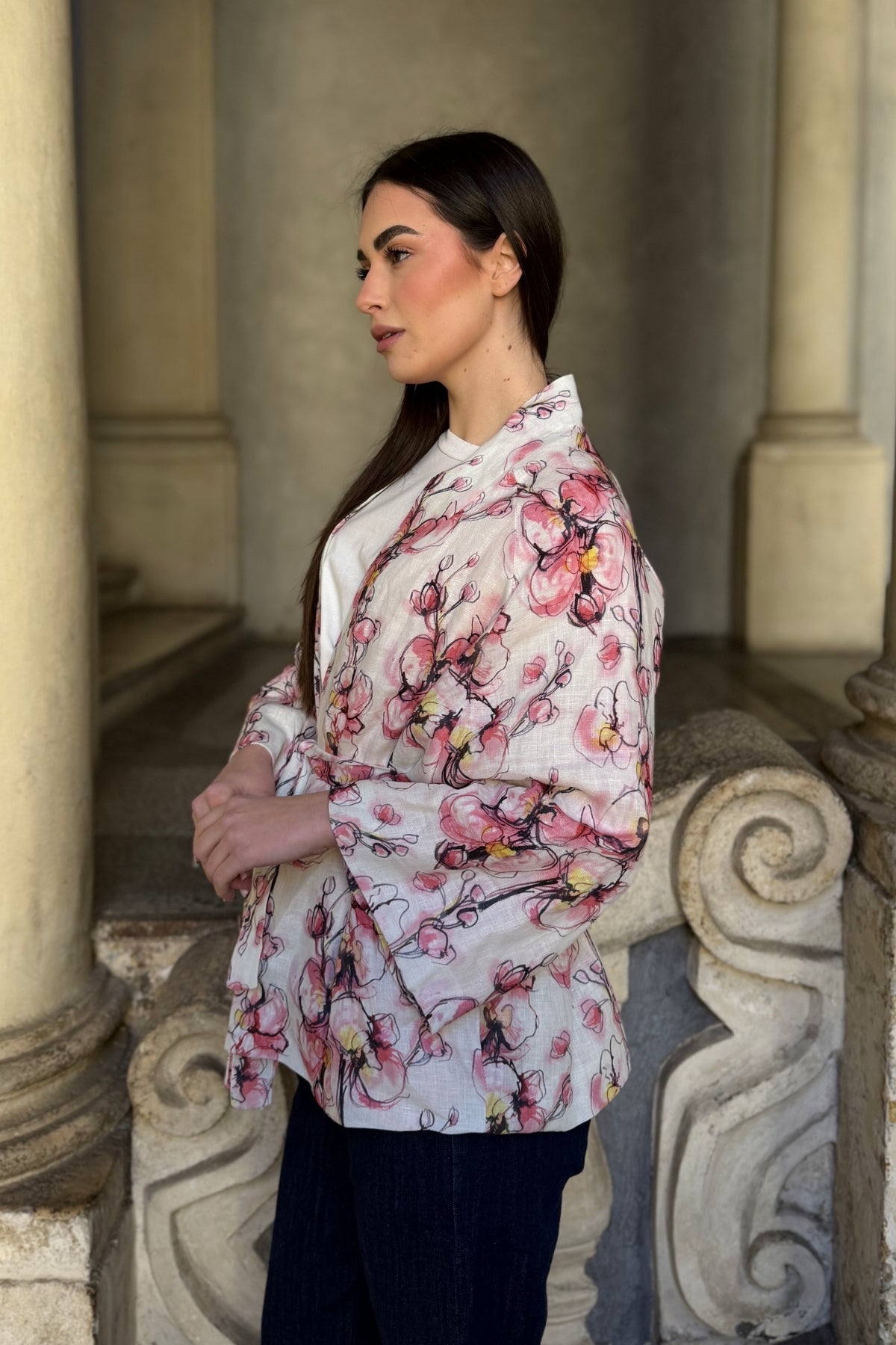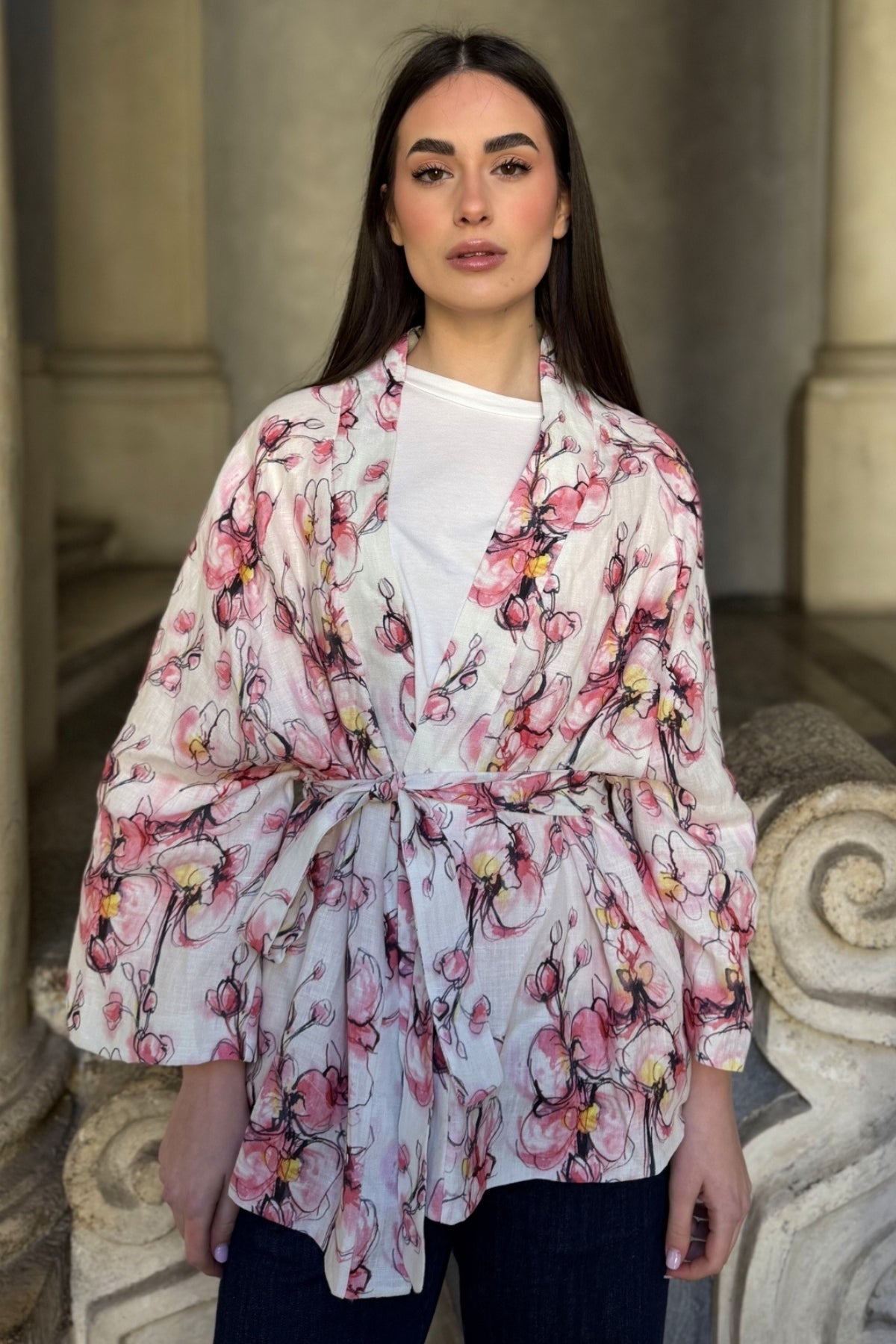 Giacca kimono in puro lino dalla linea morbida e avvolgente, impreziosita da una delicata stampa floreale nei toni cipria, rosa e accenti caldi a contrasto. Il taglio fluido è valorizzato dalla cintura coordinata in vita, che permette di modulare la silhouette con naturale eleganza.