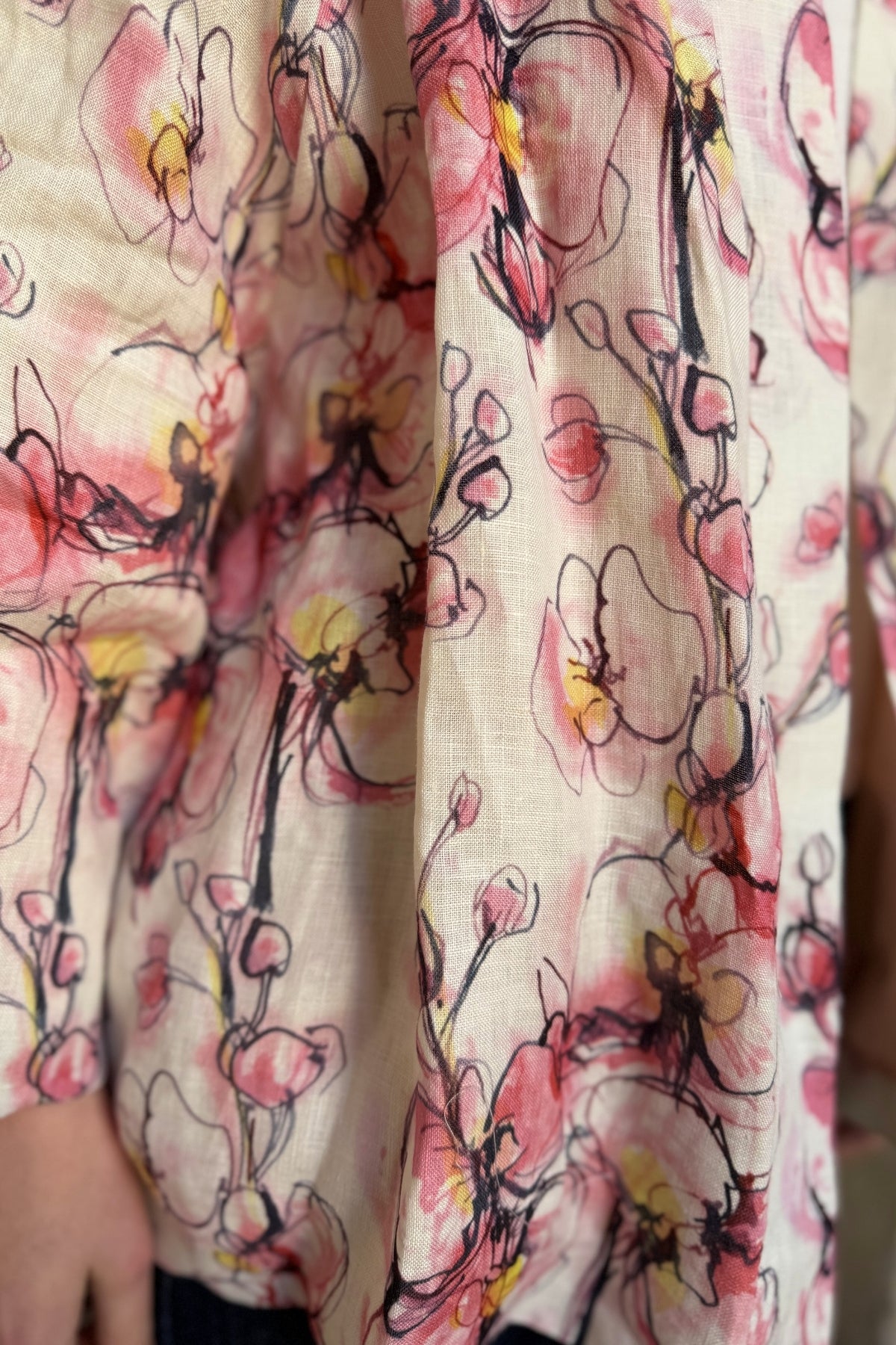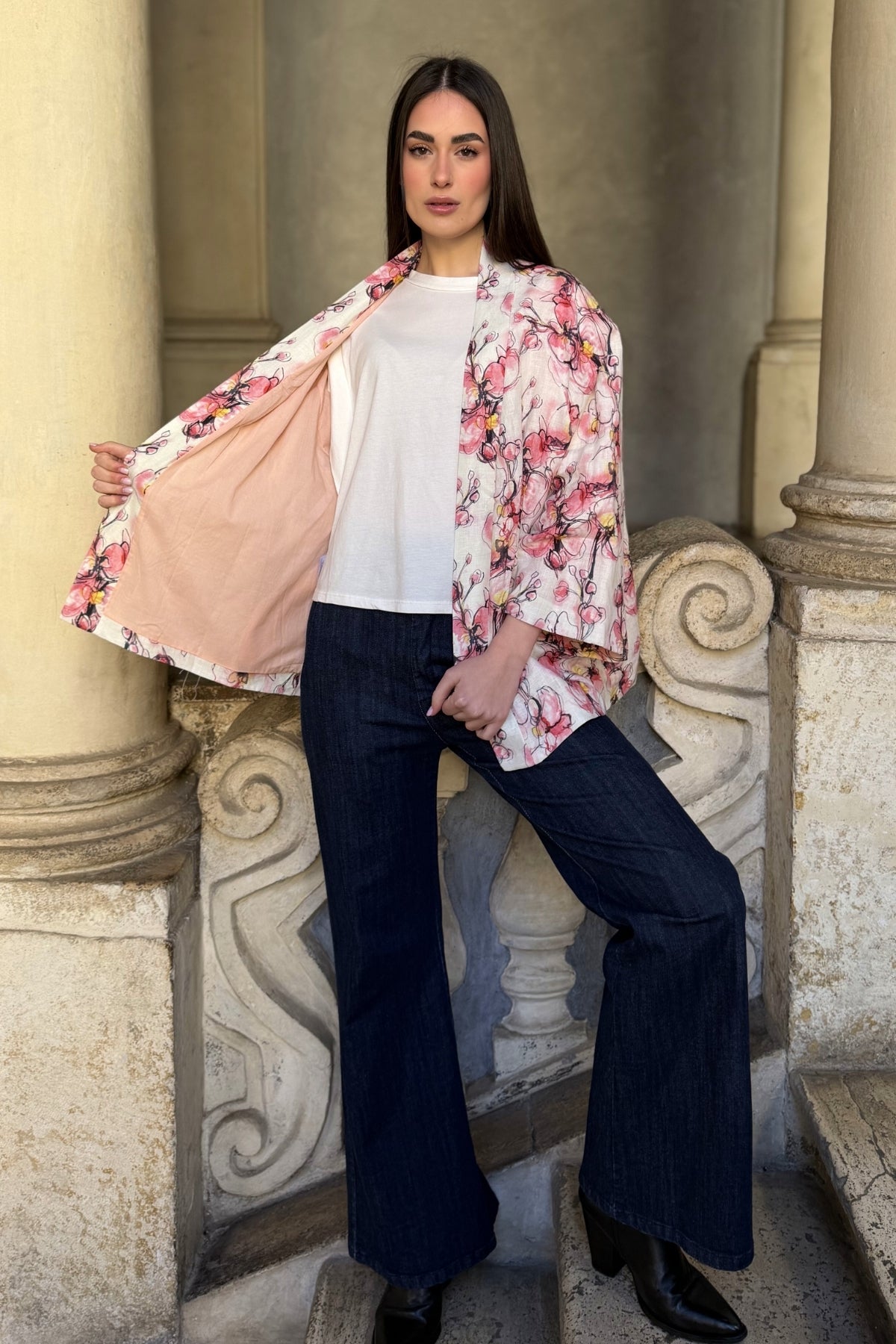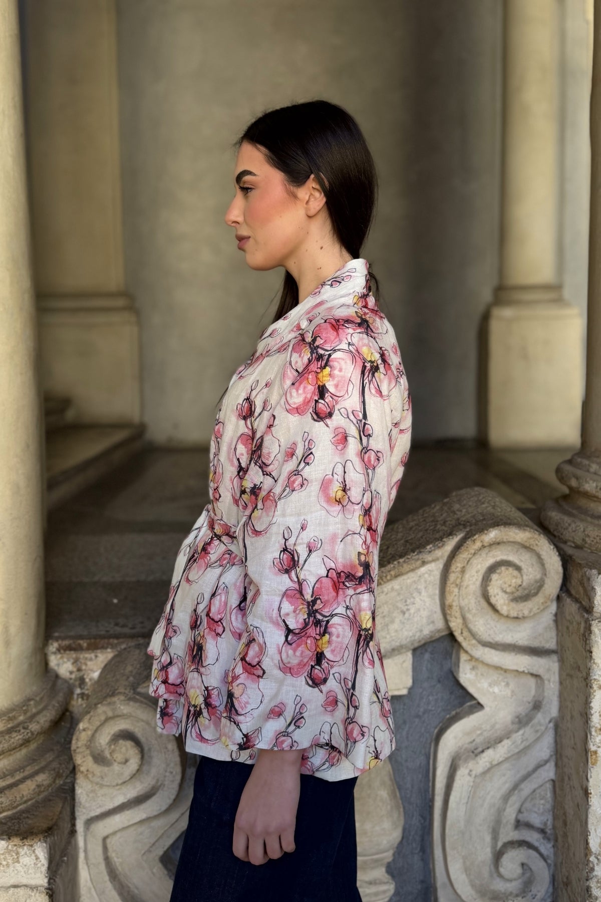 Giacca kimono in puro lino dalla linea morbida e avvolgente, impreziosita da una delicata stampa floreale nei toni cipria, rosa e accenti caldi a contrasto. Il taglio fluido è valorizzato dalla cintura coordinata in vita, che permette di modulare la silhouette con naturale eleganza.