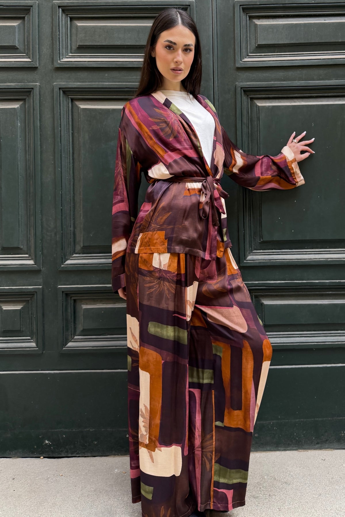 La stampa mosaico nei toni del caffè, del rosa e del verde crea un gioco grafico ricco e dinamico, capace di dare carattere al capo mantenendo un equilibrio raffinato. Il tessuto leggero valorizza la fluidità della linea palazzo, rendendolo ideale sia per outfit quotidiani ricercati sia per abbinamenti più scenografici.