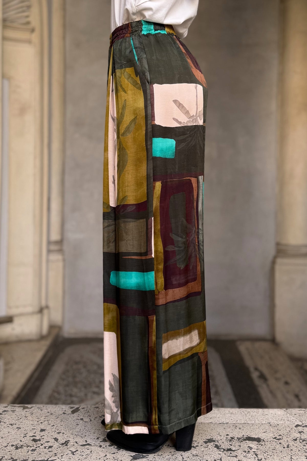 La stampa mosaico nei toni del verde militare, del senape e del turchese crea un raffinato gioco grafico che dona profondità e carattere al capo. Il tessuto morbido valorizza il movimento del pantalone, rendendolo ideale per costruire look contemporanei e ricercati.