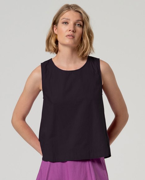 Top smanicato in puro cotone, dalla linea essenziale e contemporanea. Il taglio leggermente svasato crea un movimento morbido e valorizza la silhouette con naturalezza, mantenendo una vestibilità fresca e confortevole.