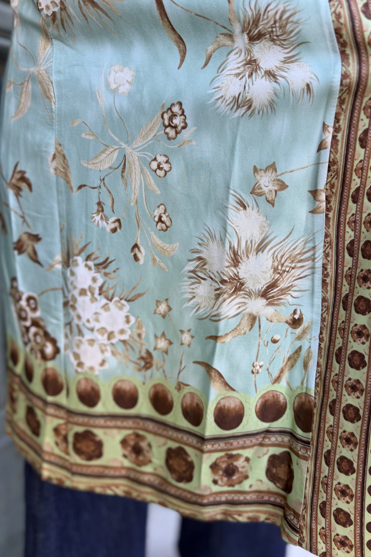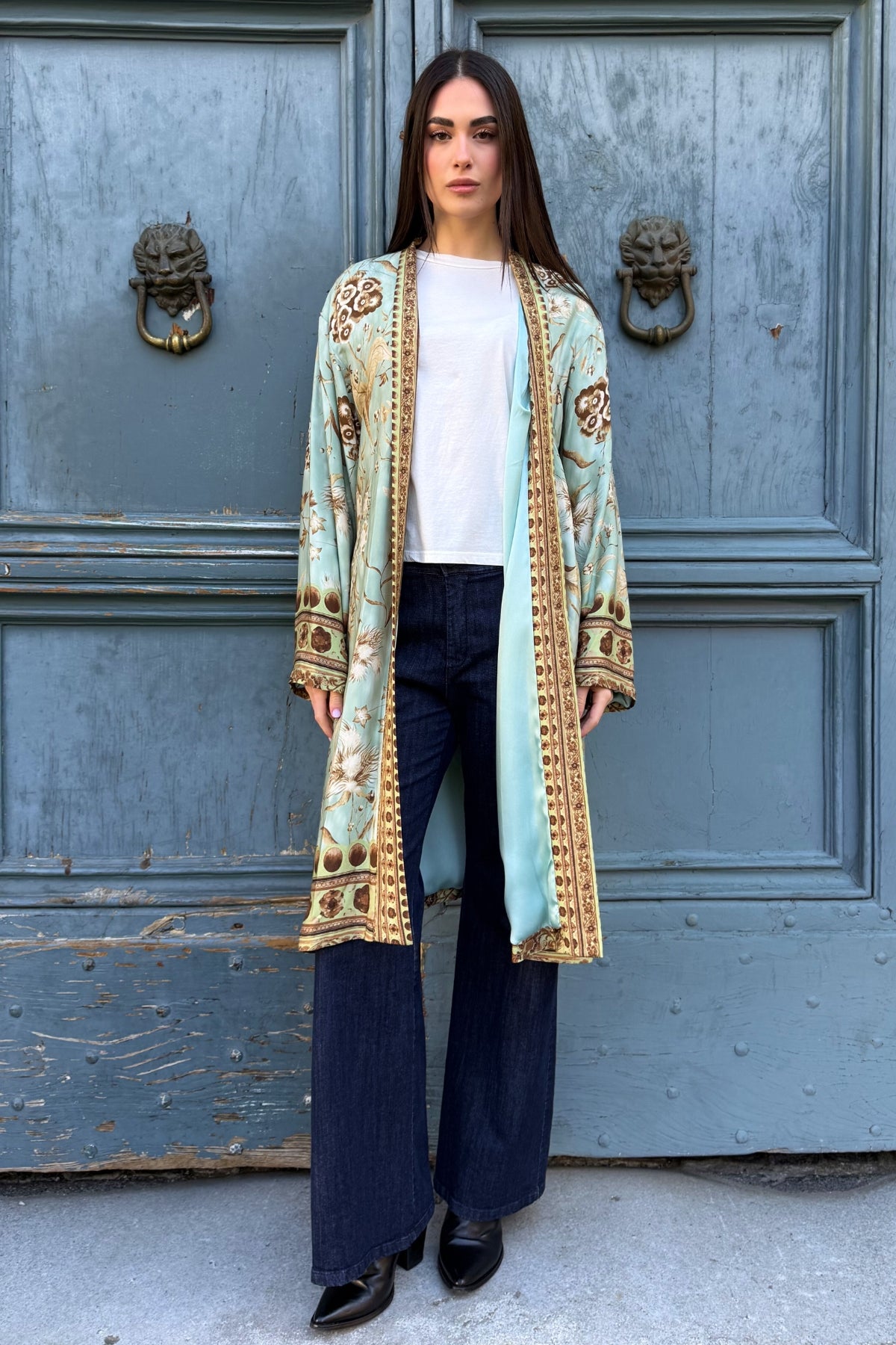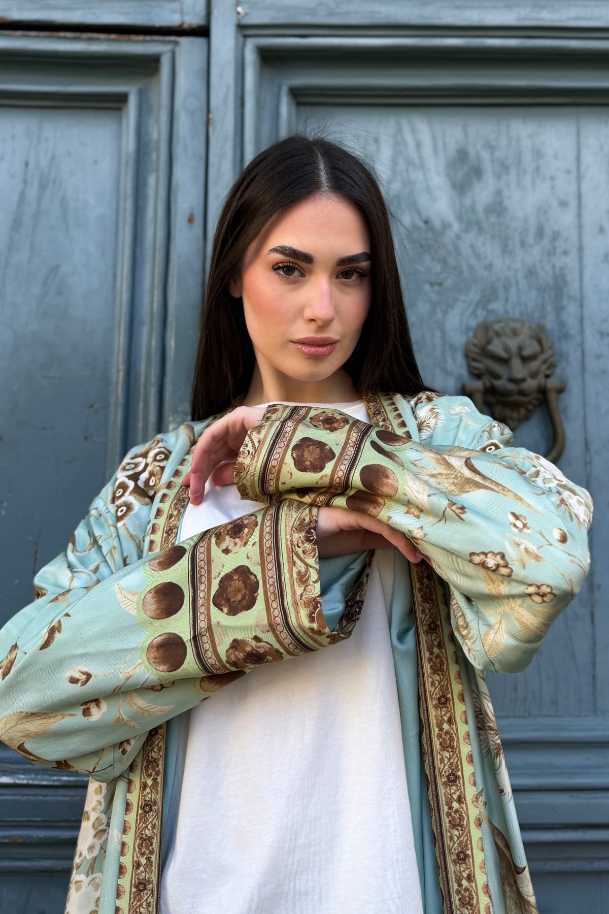 Kimono in 100% viscosa dalla texture fluida e leggera, caratterizzato da una delicata base menta impreziosita da motivi floreali e dettagli grafici nei toni caldi del marrone e del beige. Le bordure decorative sul fondo e lungo i profili creano un elegante gioco di contrasti, valorizzando il design con un tocco ricercato.