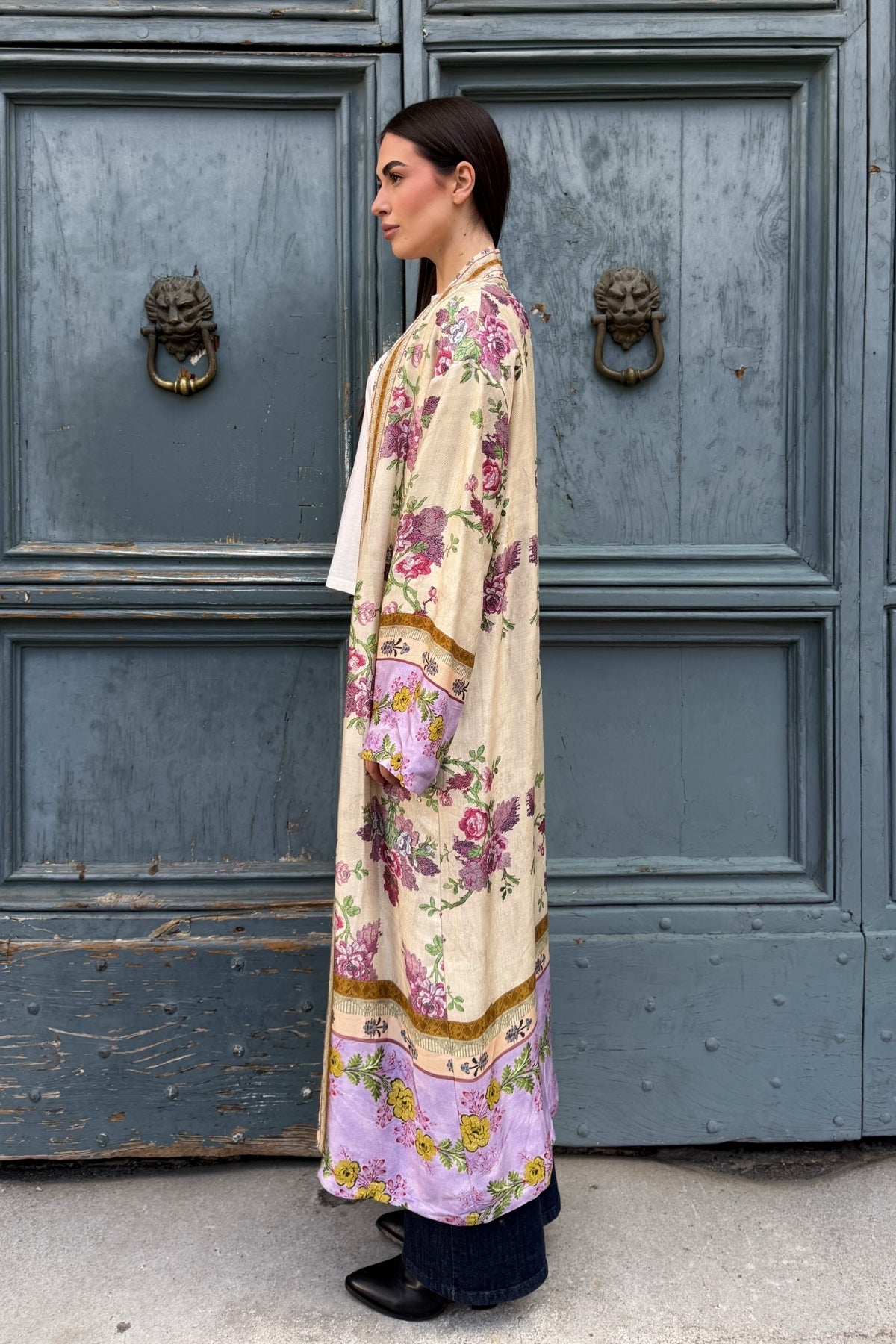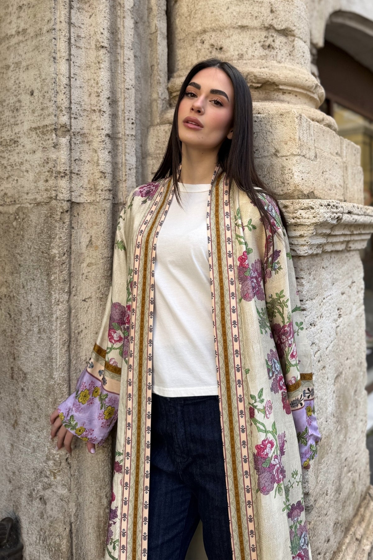 Kimono lungo in viscosa dalla base color burro, impreziosito da una delicata stampa floreale nei toni del rosa, lilla e verde.