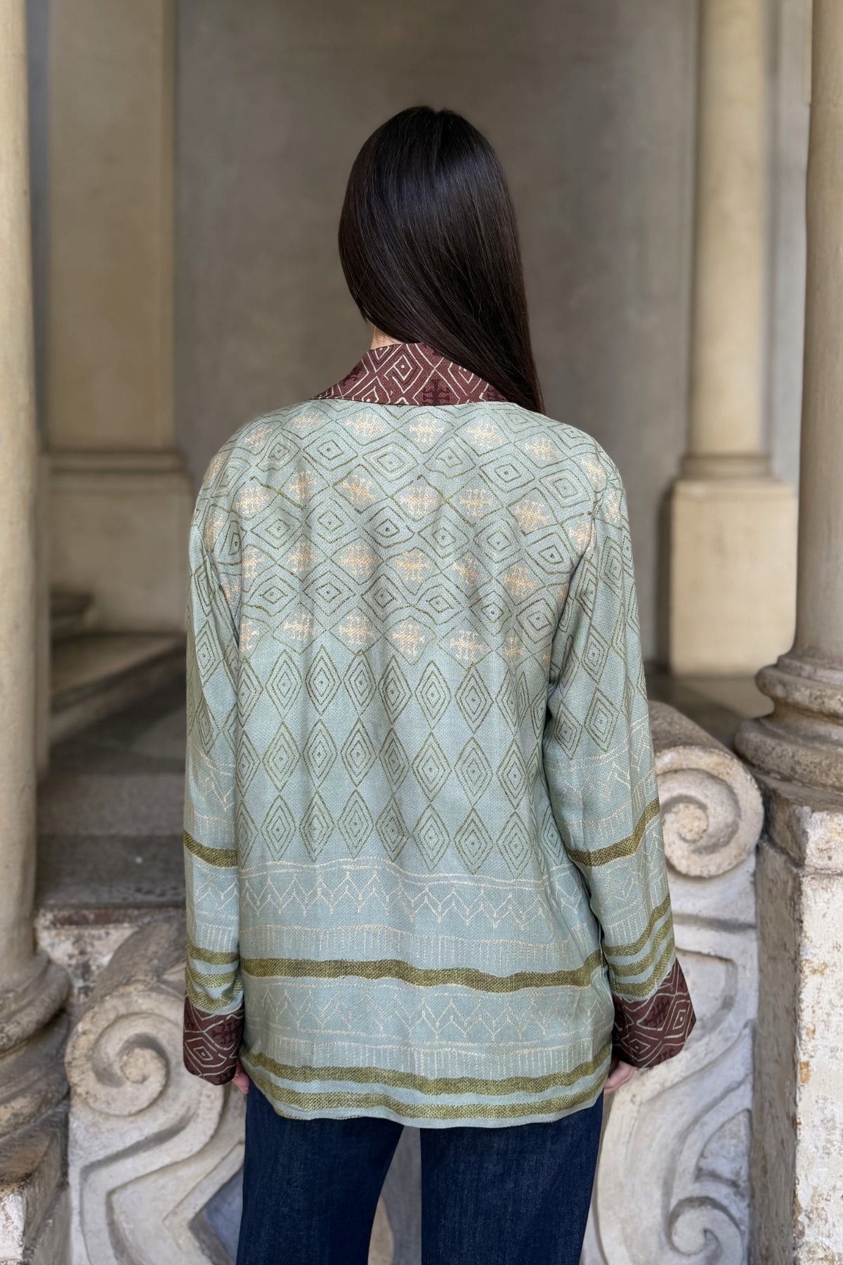 Giacca kimono in morbida viscosa dalla vestibilità fluida e avvolgente, caratterizzata da un raffinato gioco di contrasti tra il verde salvia e il marrone intenso. Il motivo geometrico all-over si alterna a bande decorative sulle maniche e lungo i bordi, creando un effetto grafico elegante e contemporaneo.