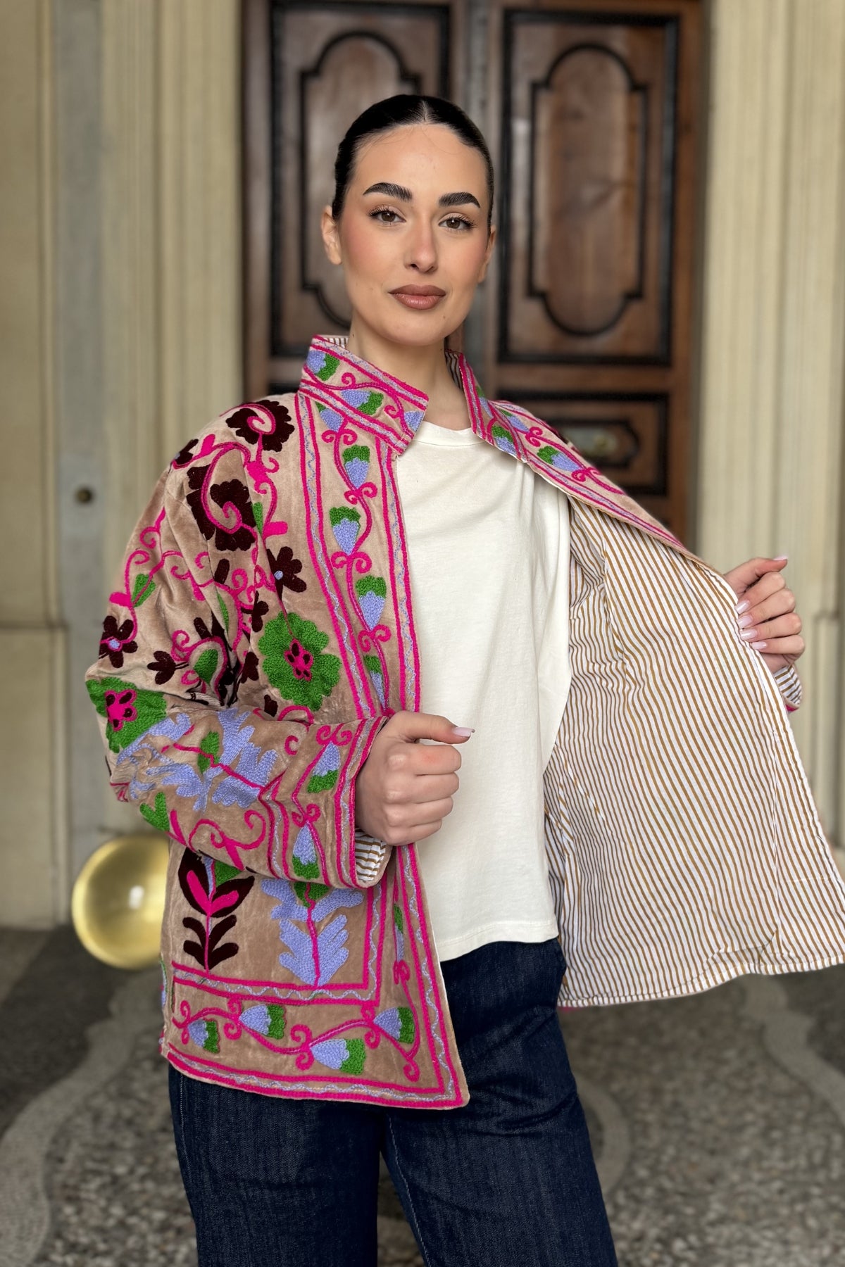 Giacca kimono realizzata in velluto di cotone 100%, con base beige calda e ricami floreali nei toni del fucsia, verde, azzurro e bordeaux.